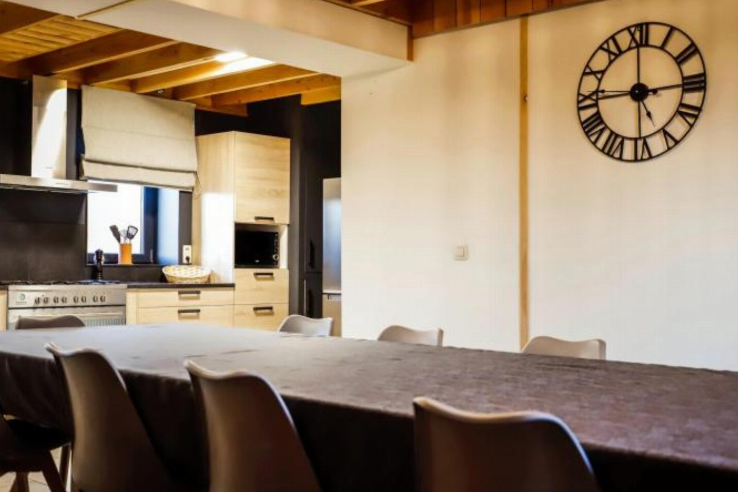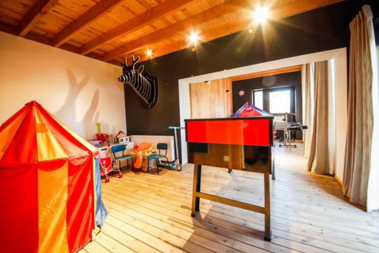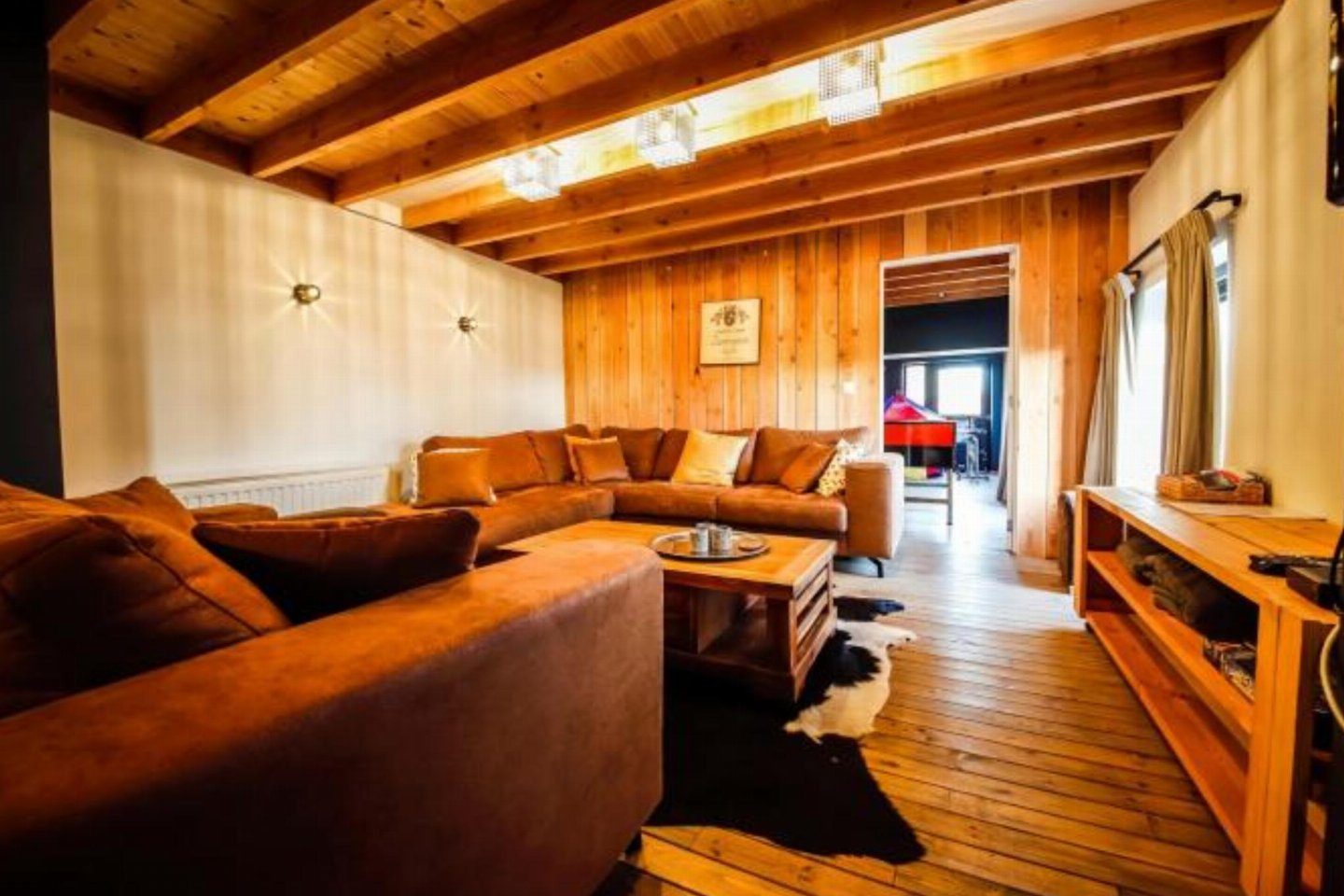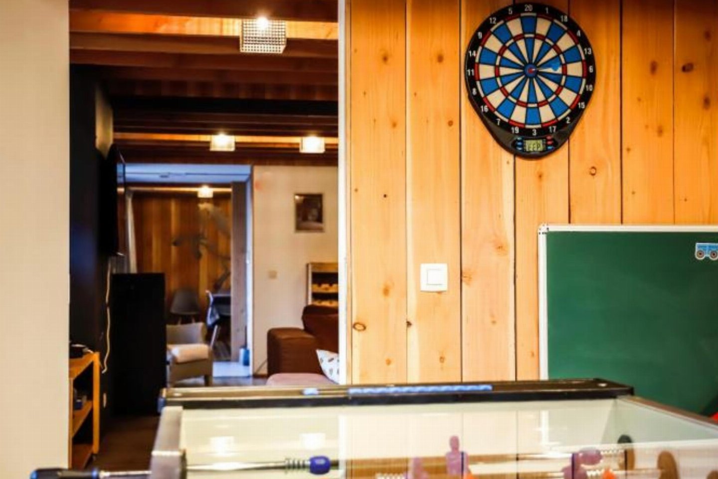 Begane grond: (woonkamer(TV, open haard, zithoek, bar), eetkamer(eettafel, open haard, 1x kinderstoel), open keuken(waterkoker, fornuis, afzuigkap, koffiezetapparaat(filtermaling), oven, magnetron, afwasmachine, koel-/vriescombinatie), toilet(wc), recreatieruimte(dart, biljart))