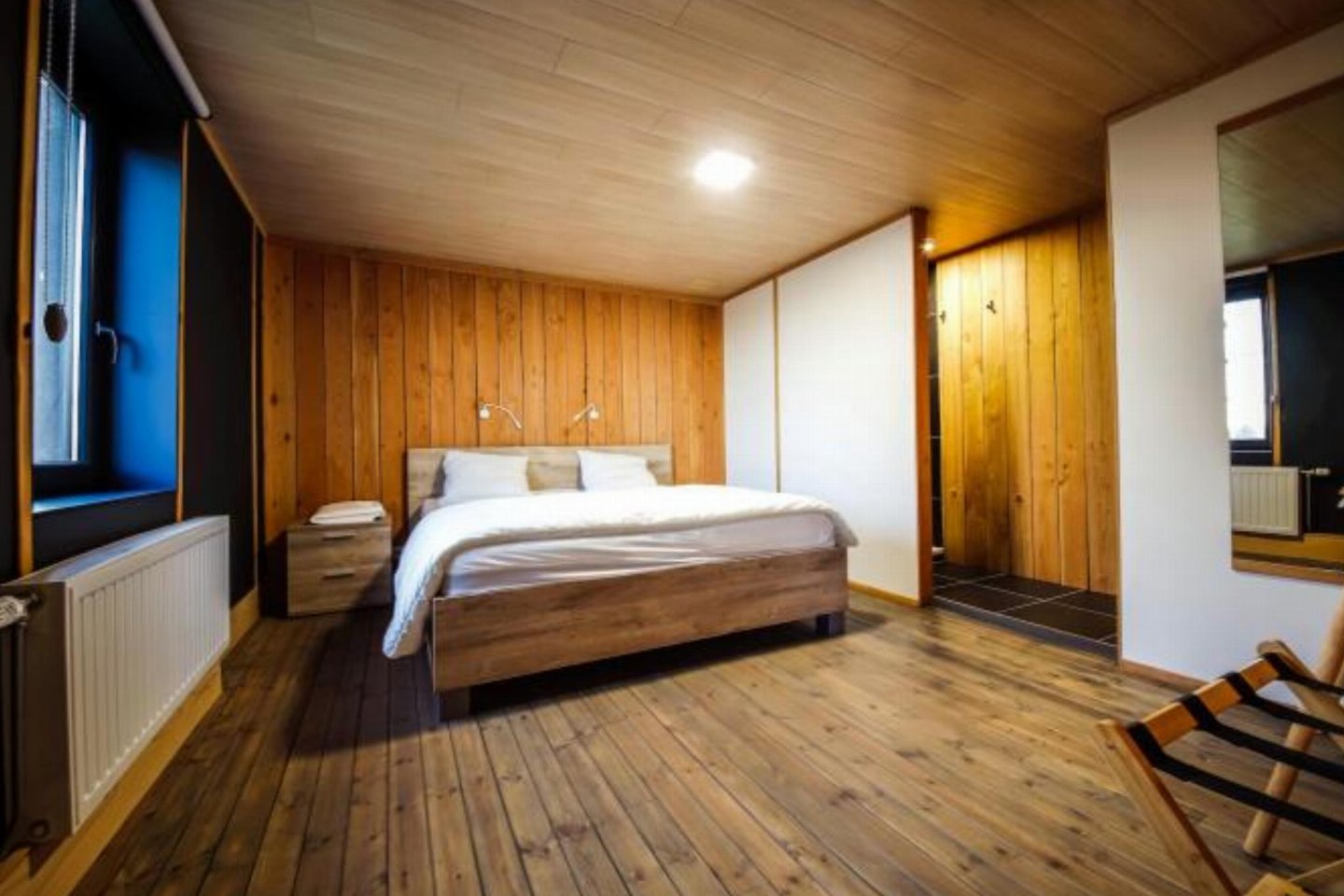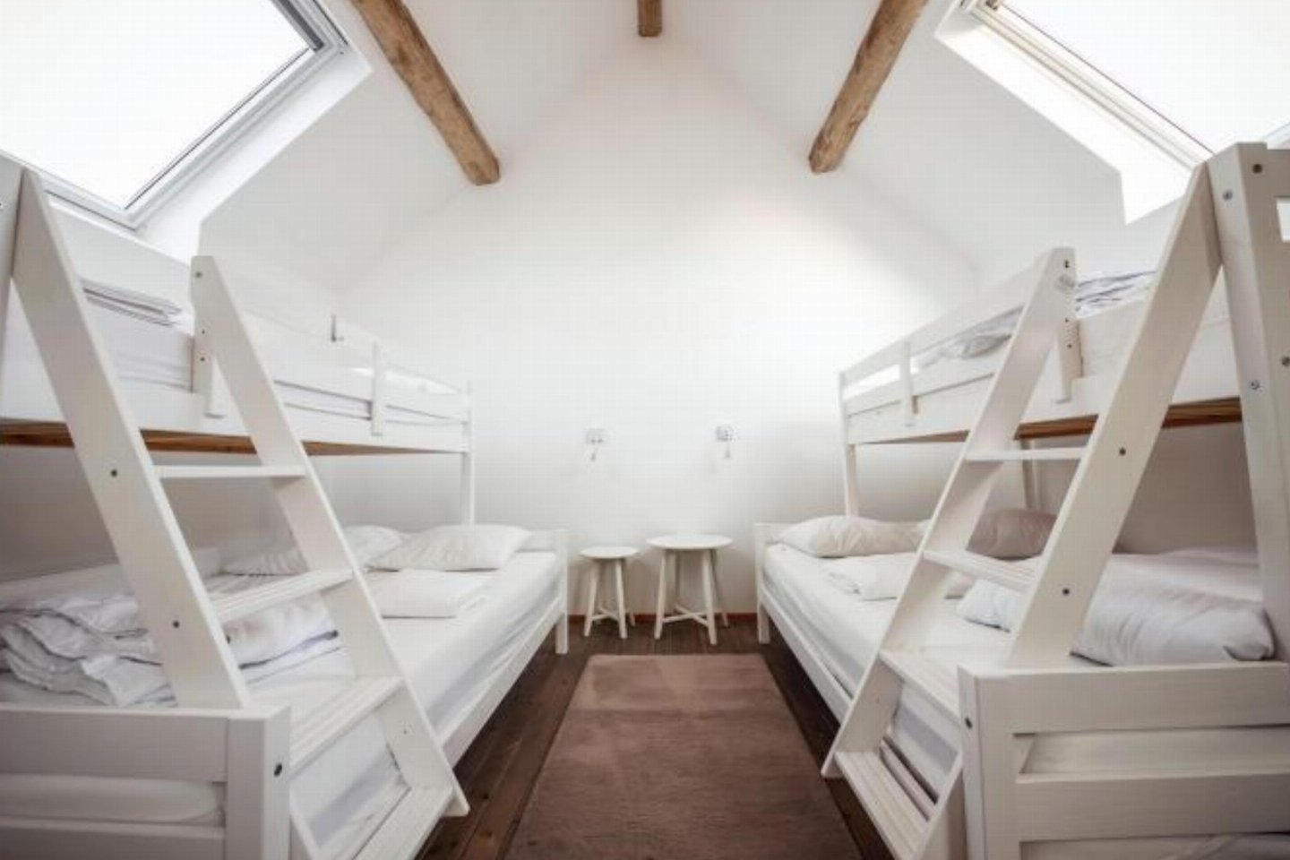 Op de 1e etage: (slaapkamer(2x 1-pers. bed, 2x stapelbed), 4x slaapkamer met badkamer(2-pers. bed, douche, wastafel))