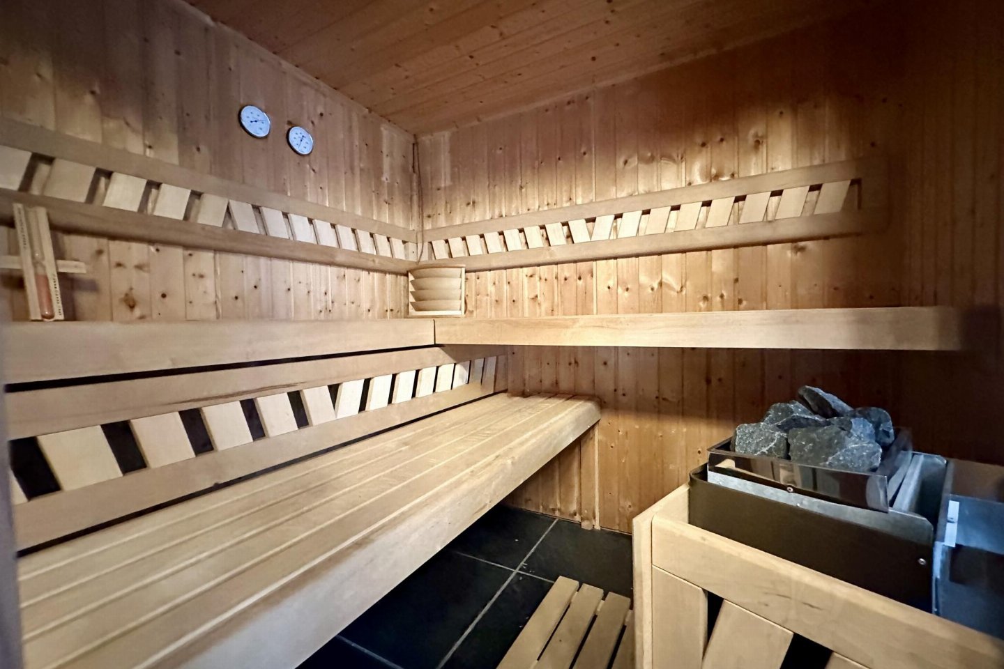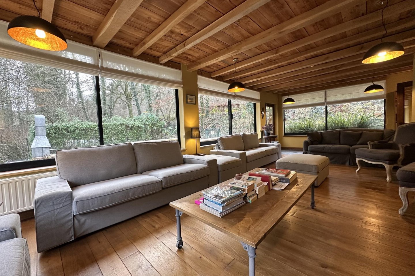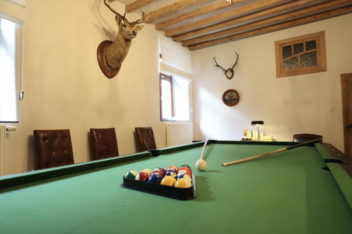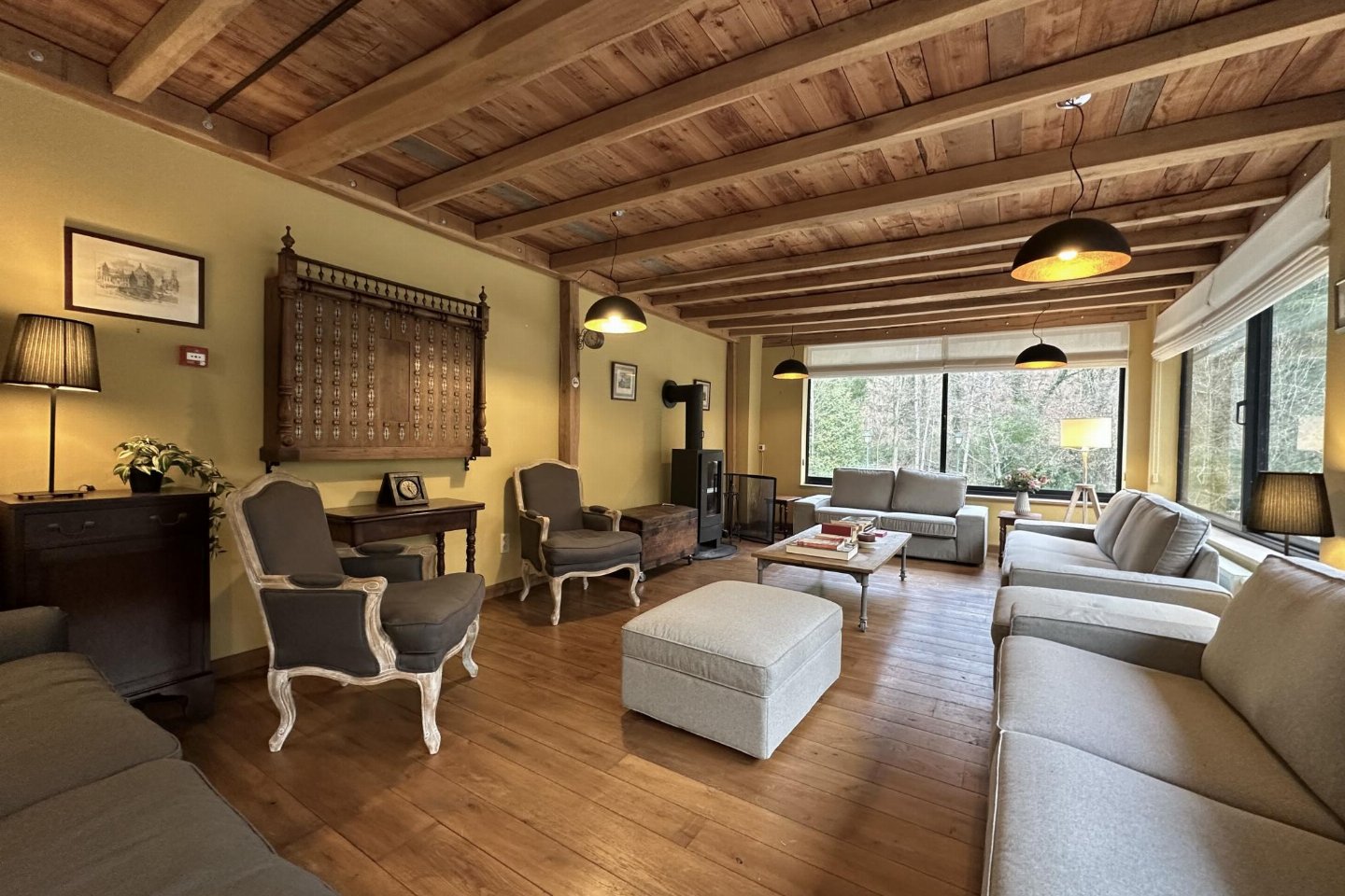 Begane grond: hal, woonkamer met kachel(hout) , zitkamer met TV, open haard , eetkamer, keuken met waterkoker, fornuis(5 kookplaten, gas), koffiezetapparaat(filtermaling), koffiezetapparaat(bonen), afwasmachine, koelkast, vriezer , recreatieruimte met biljart , relaxruimte