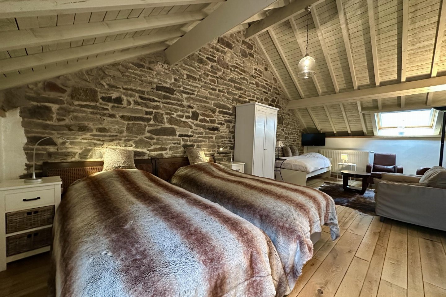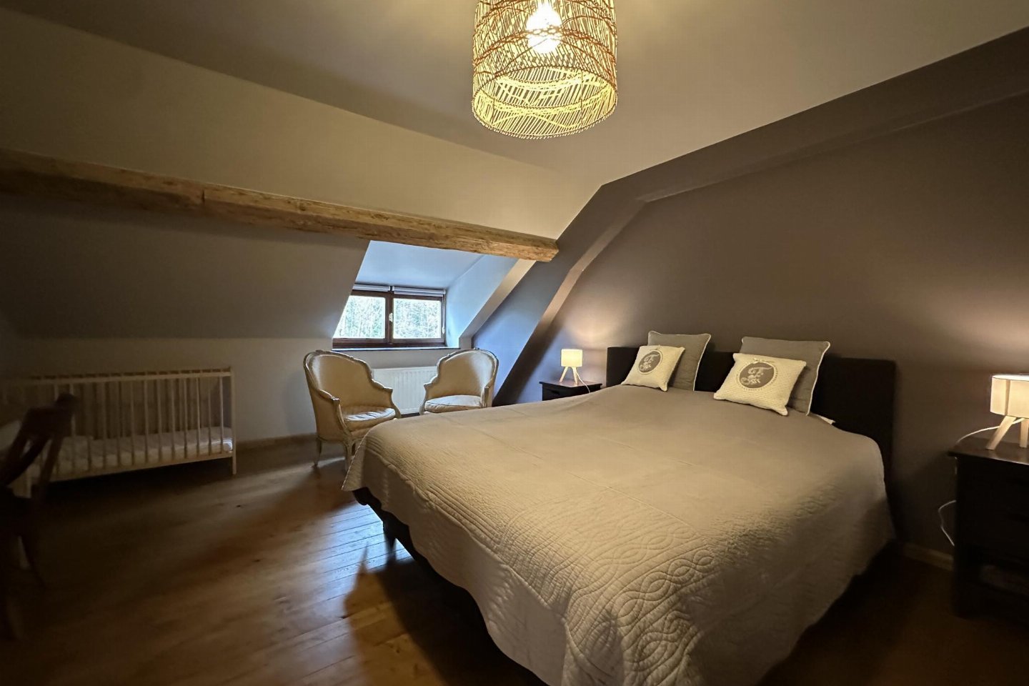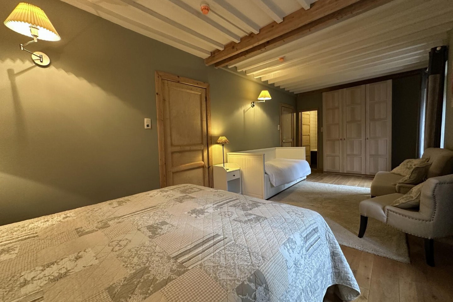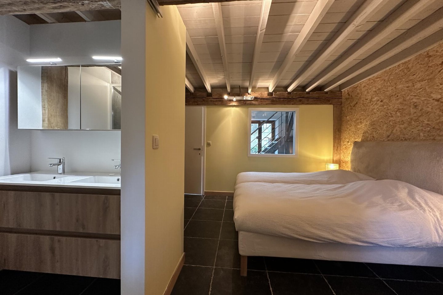 Dit voormalige hotel is gerenoveerd en omgebouwd tot een luxe gite op een landgoed van 2 hectare. Met zijn open zwembad en ontspanningsruimte met sauna is het de perfecte plek om tijd door te brengen met familie of vrienden. bed , slaapkamer met badkamer met 2x 1-pers. bed, douche, 2x wastafel, wc , vide met 2-pers.