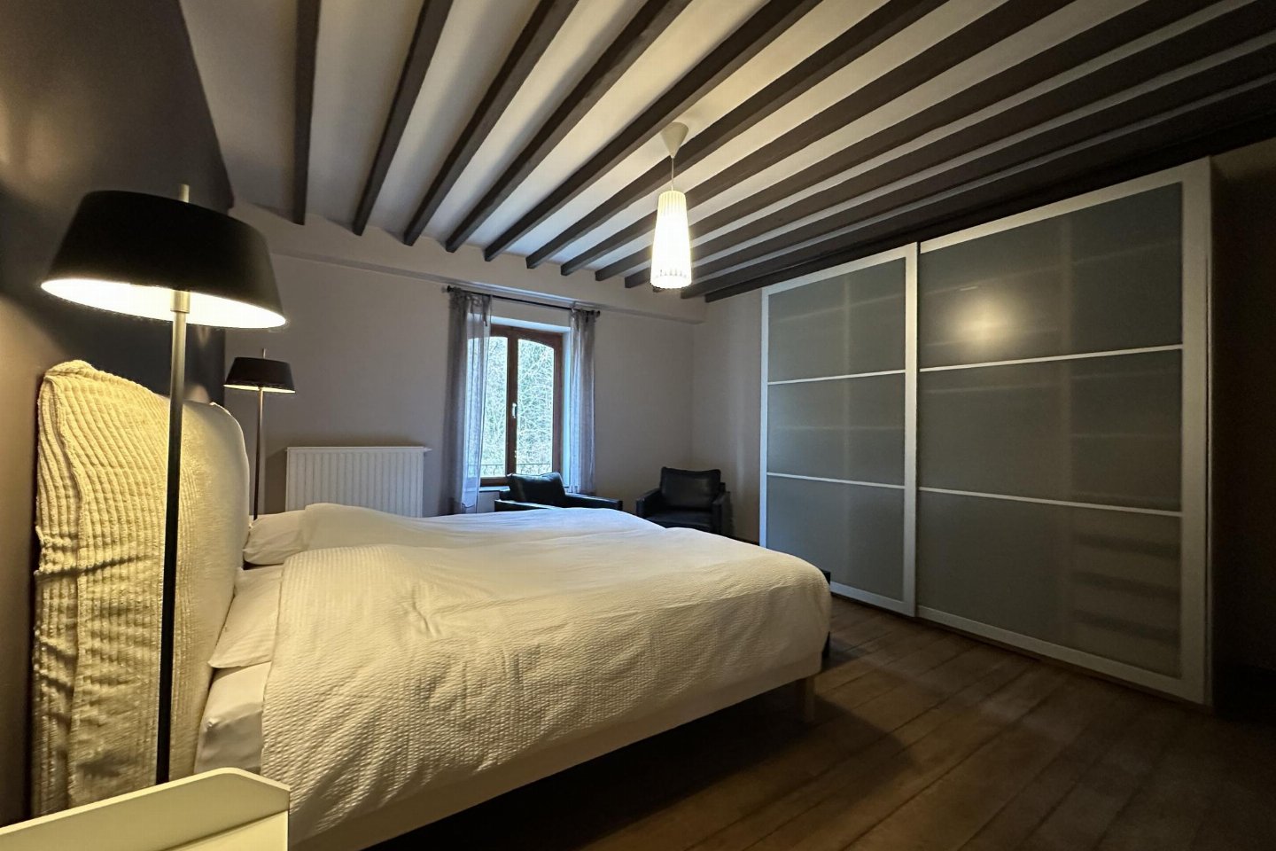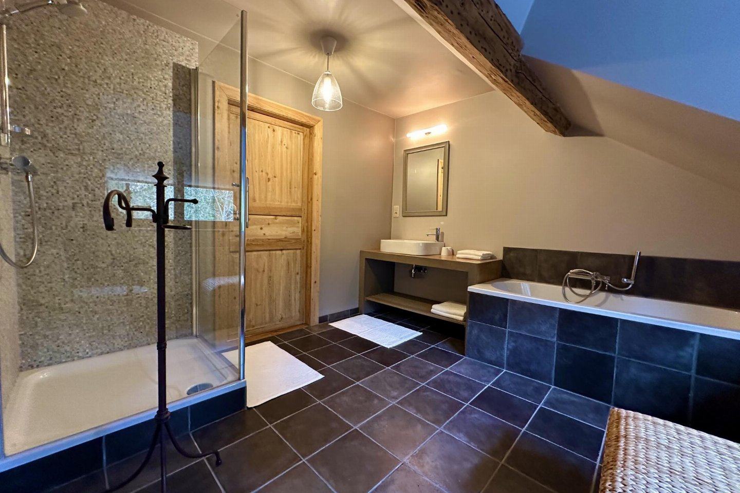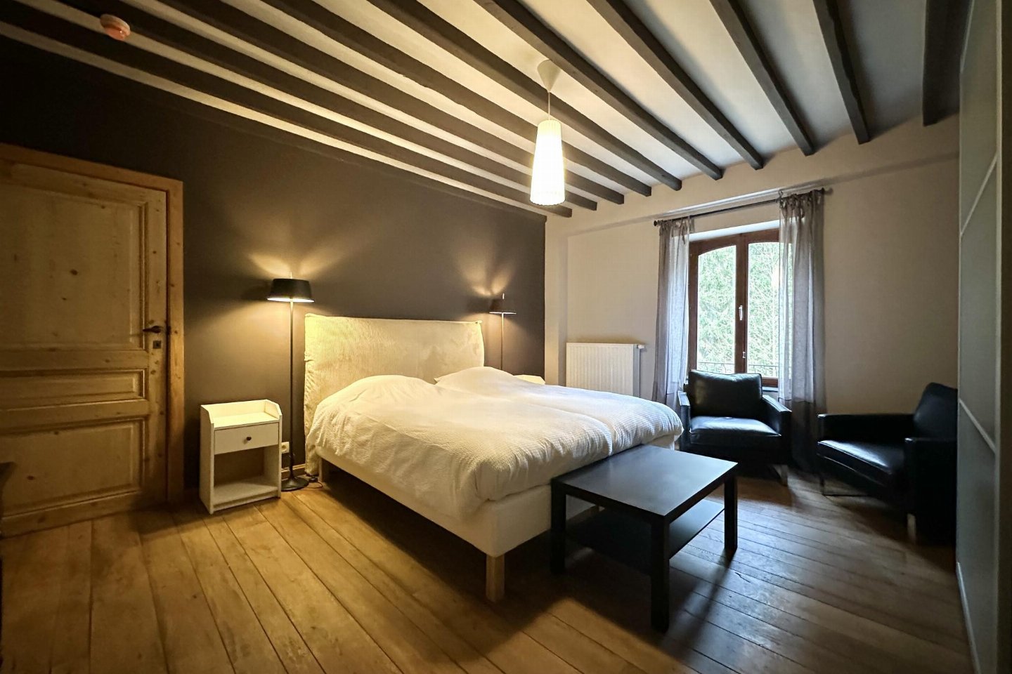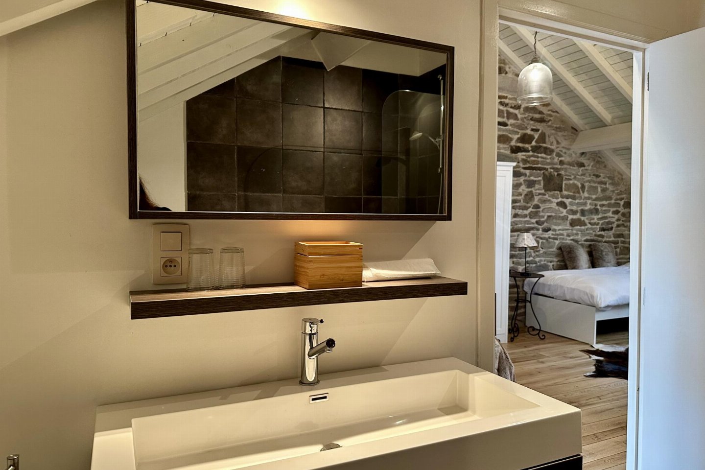 Dit voormalige hotel is gerenoveerd en omgebouwd tot een luxe gite op een landgoed van 2 hectare. Met zijn open zwembad en ontspanningsruimte met sauna is het de perfecte plek om tijd door te brengen met familie of vrienden. bed , slaapkamer met badkamer met 2x 1-pers. bed, douche, 2x wastafel, wc , vide met 2-pers.