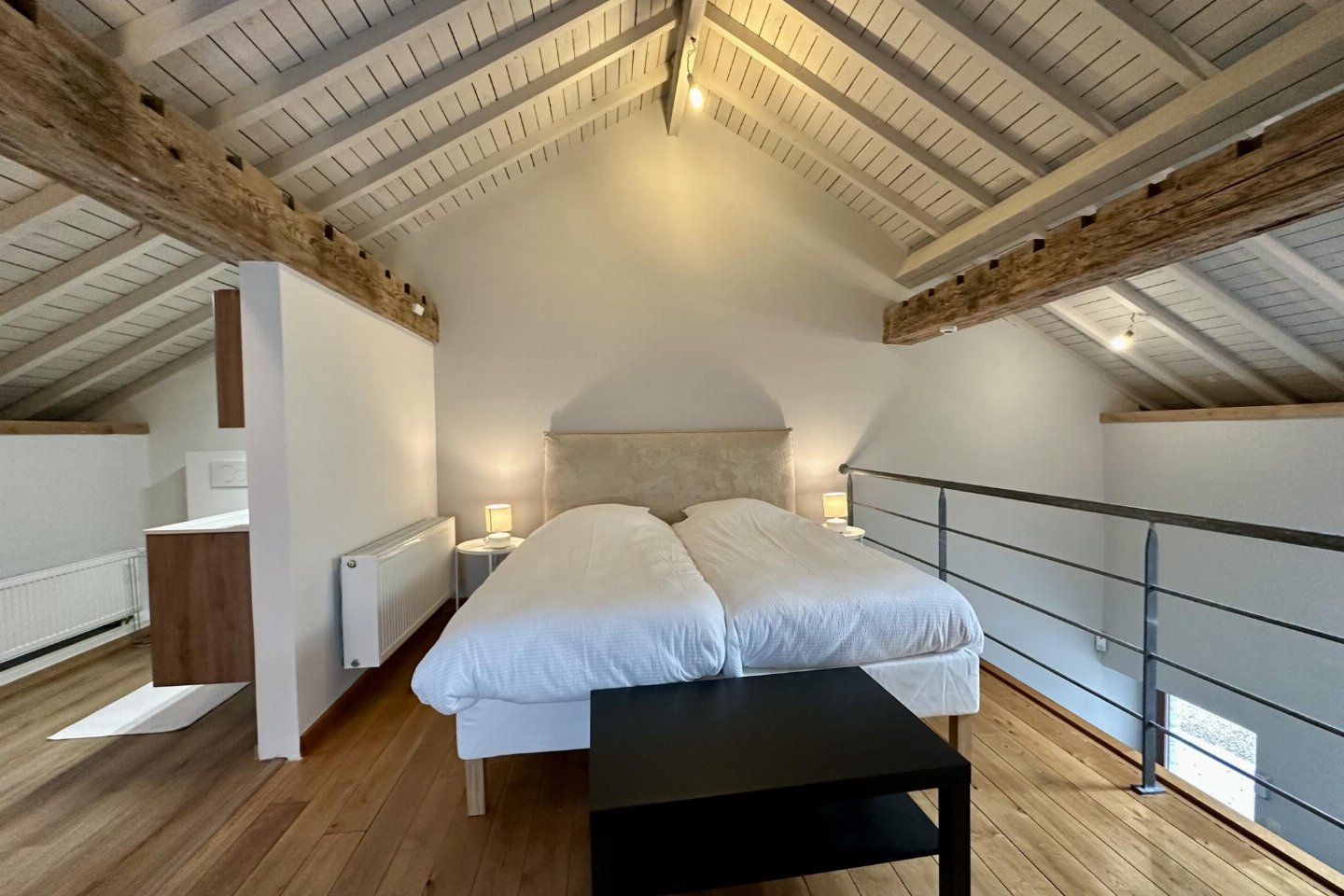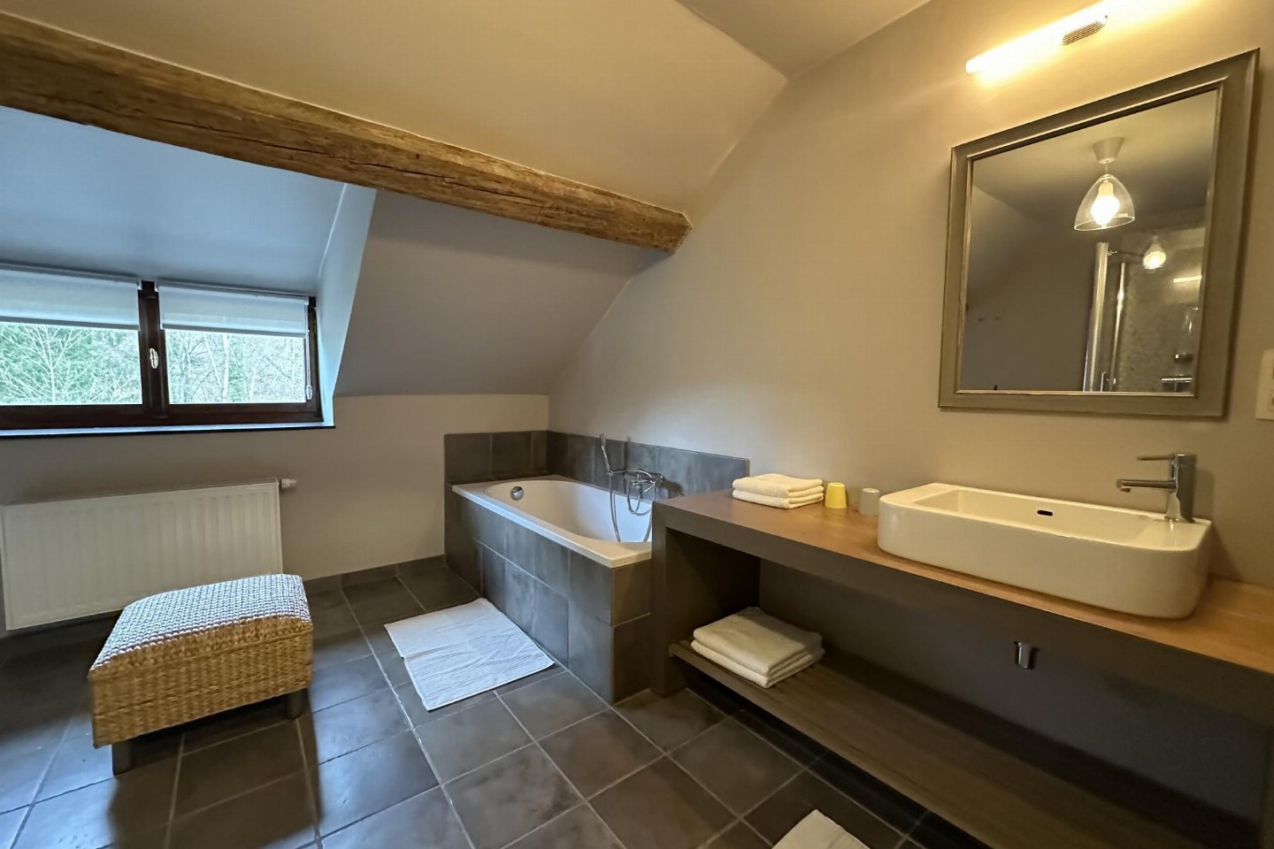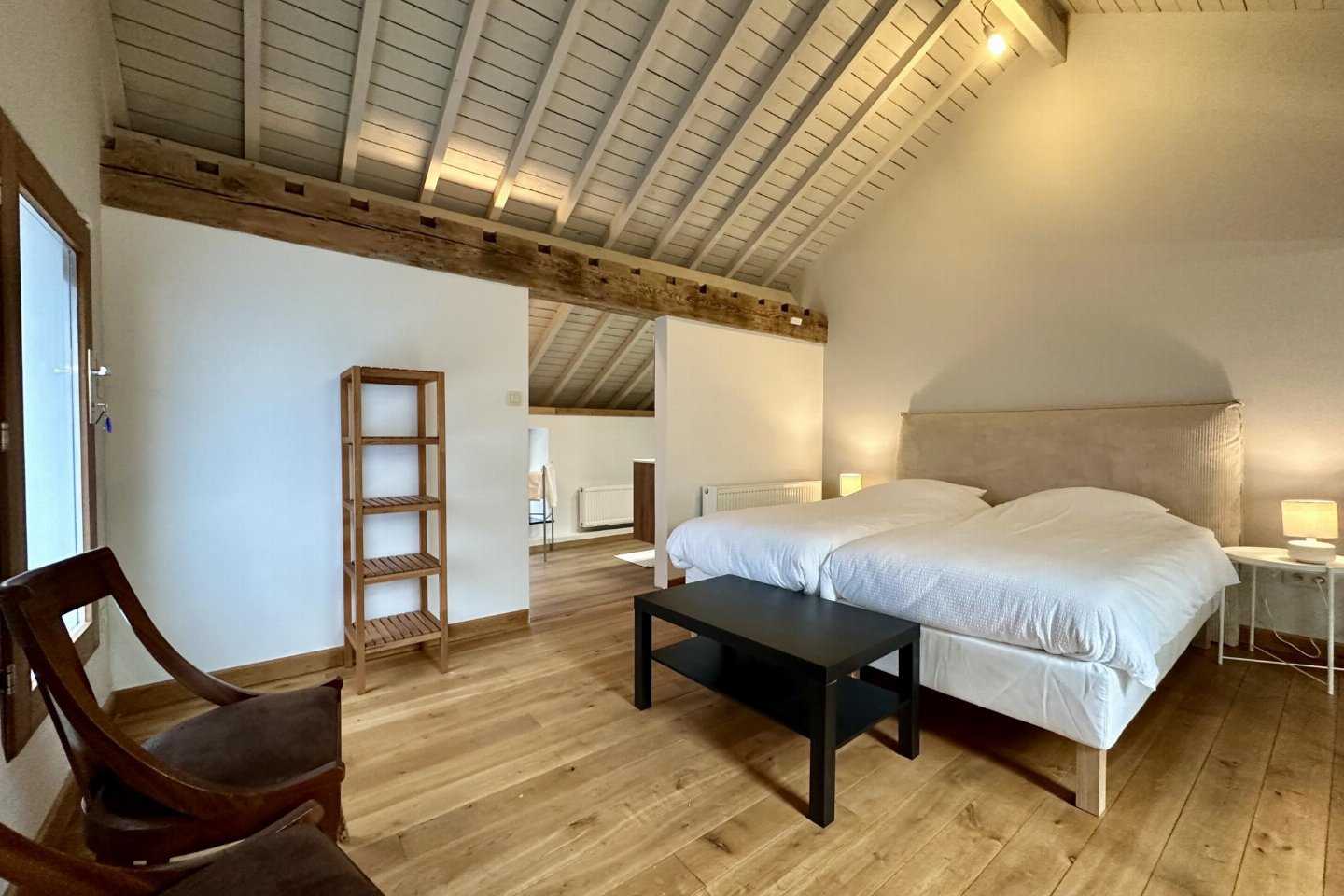 Gastenverblijf Begane grond: slaapkamer met badkamer met 2x 1-pers. bed, douche, 2x wastafel, wc , vide met 2-pers. bed, bad met douche, 2x wastafel
