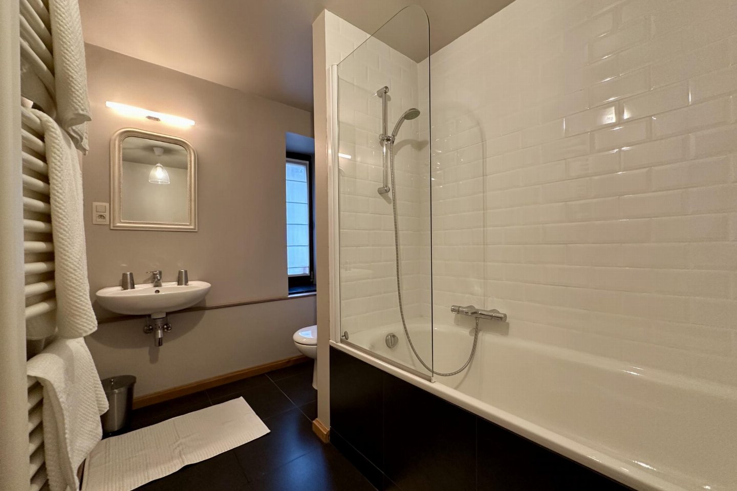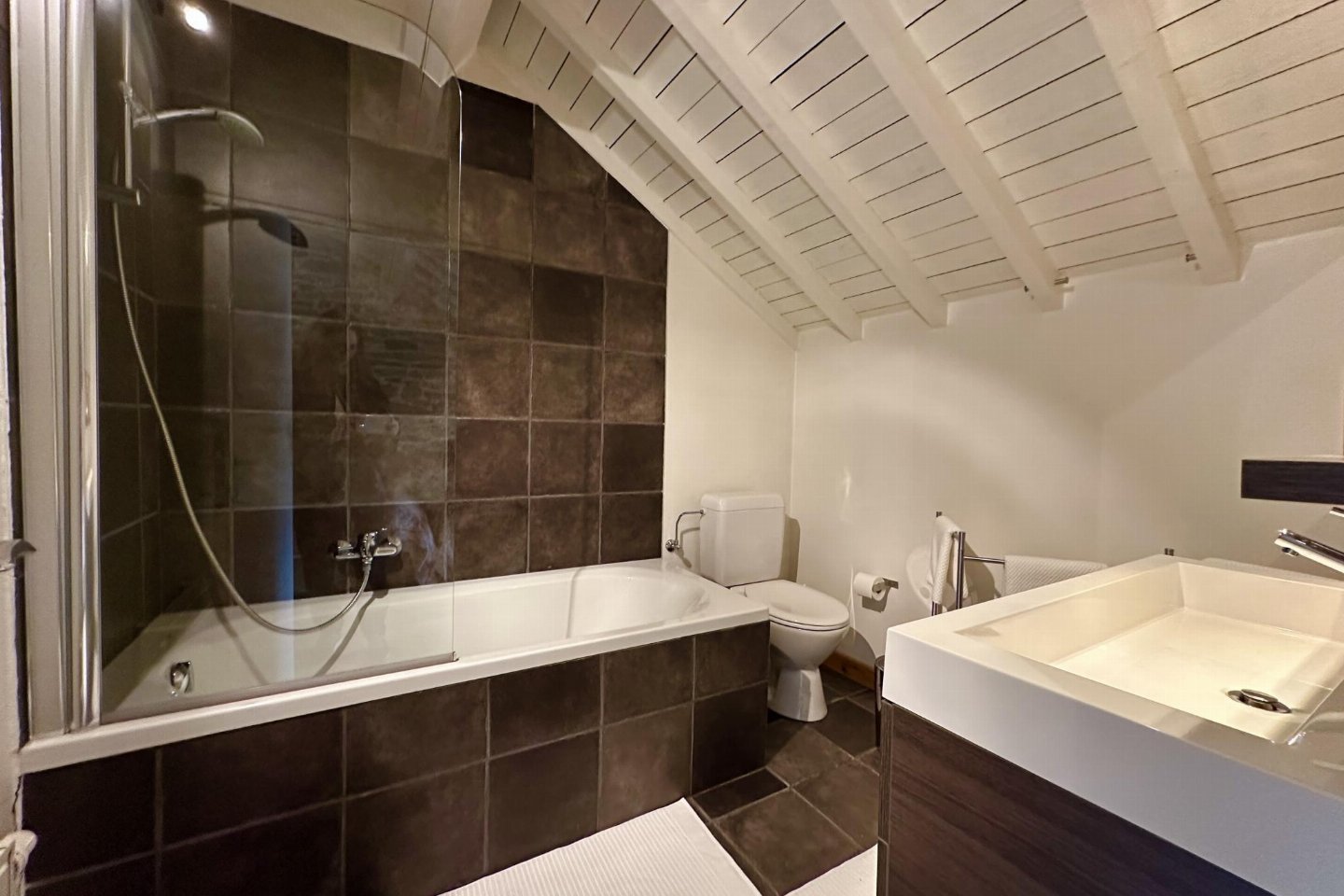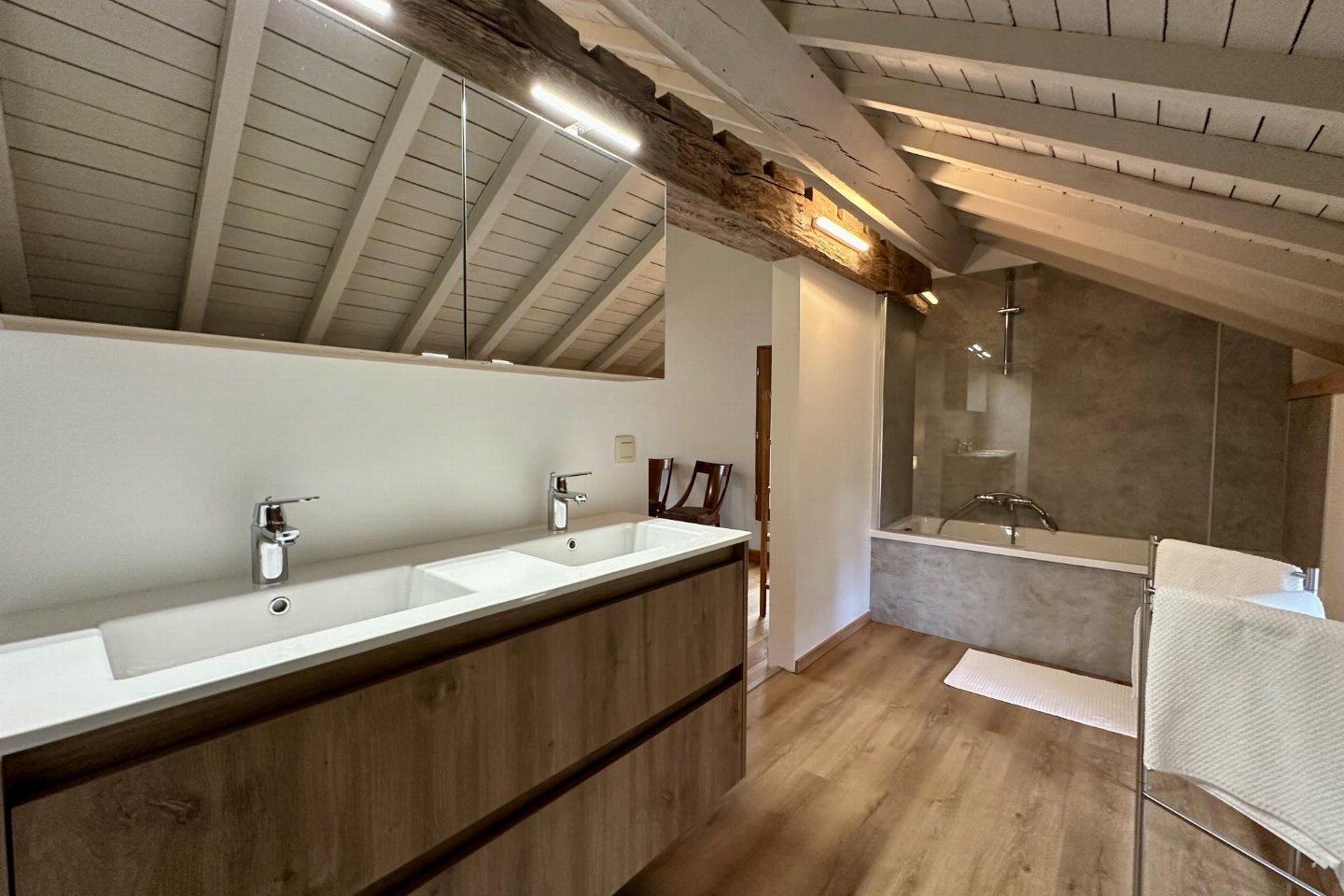 Gastenverblijf Begane grond: slaapkamer met badkamer met 2x 1-pers. bed, douche, 2x wastafel, wc , vide met 2-pers. bed, bad met douche, 2x wastafel
