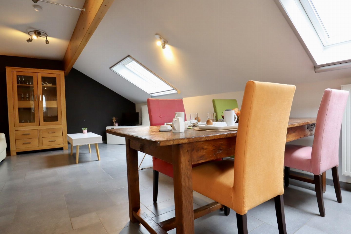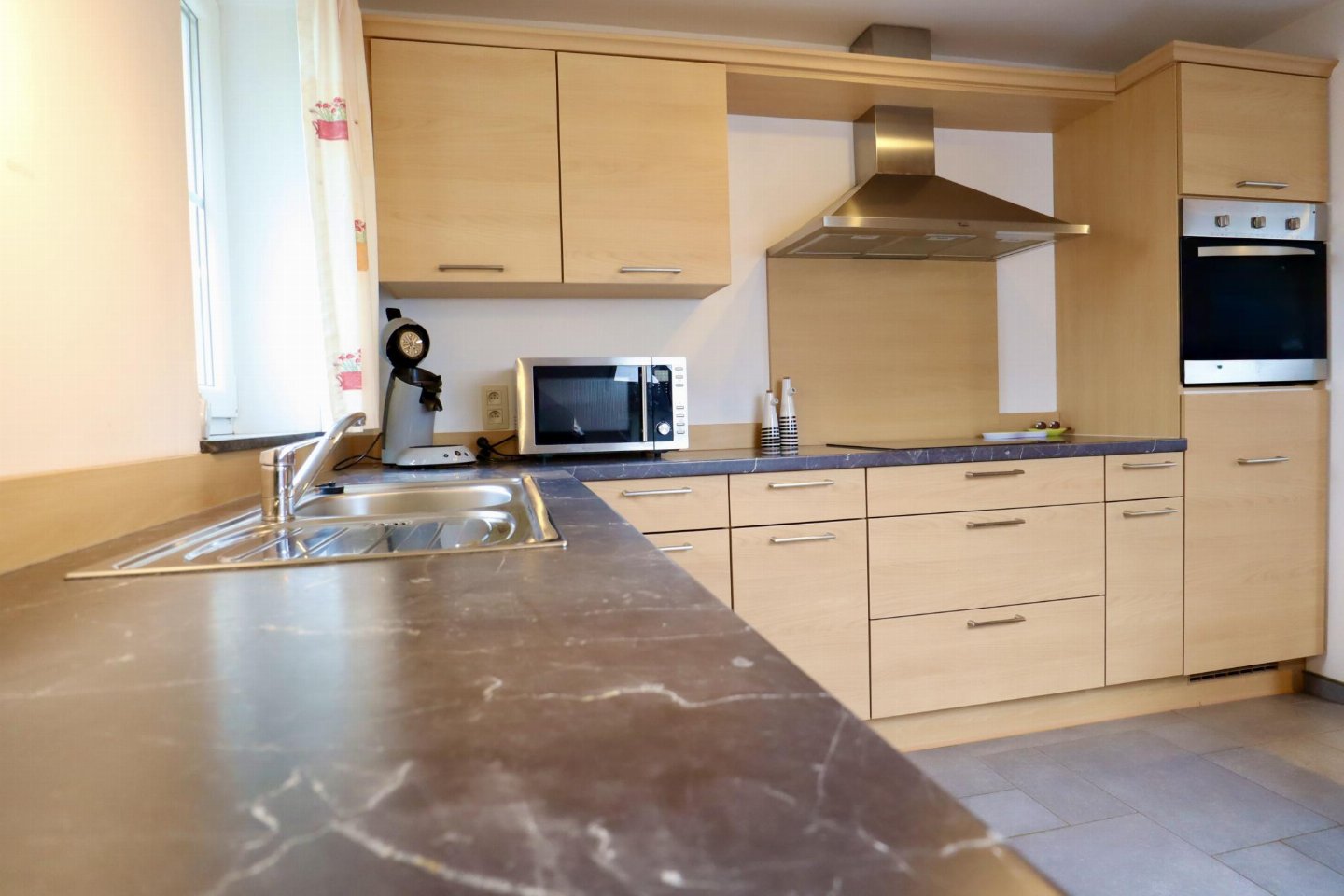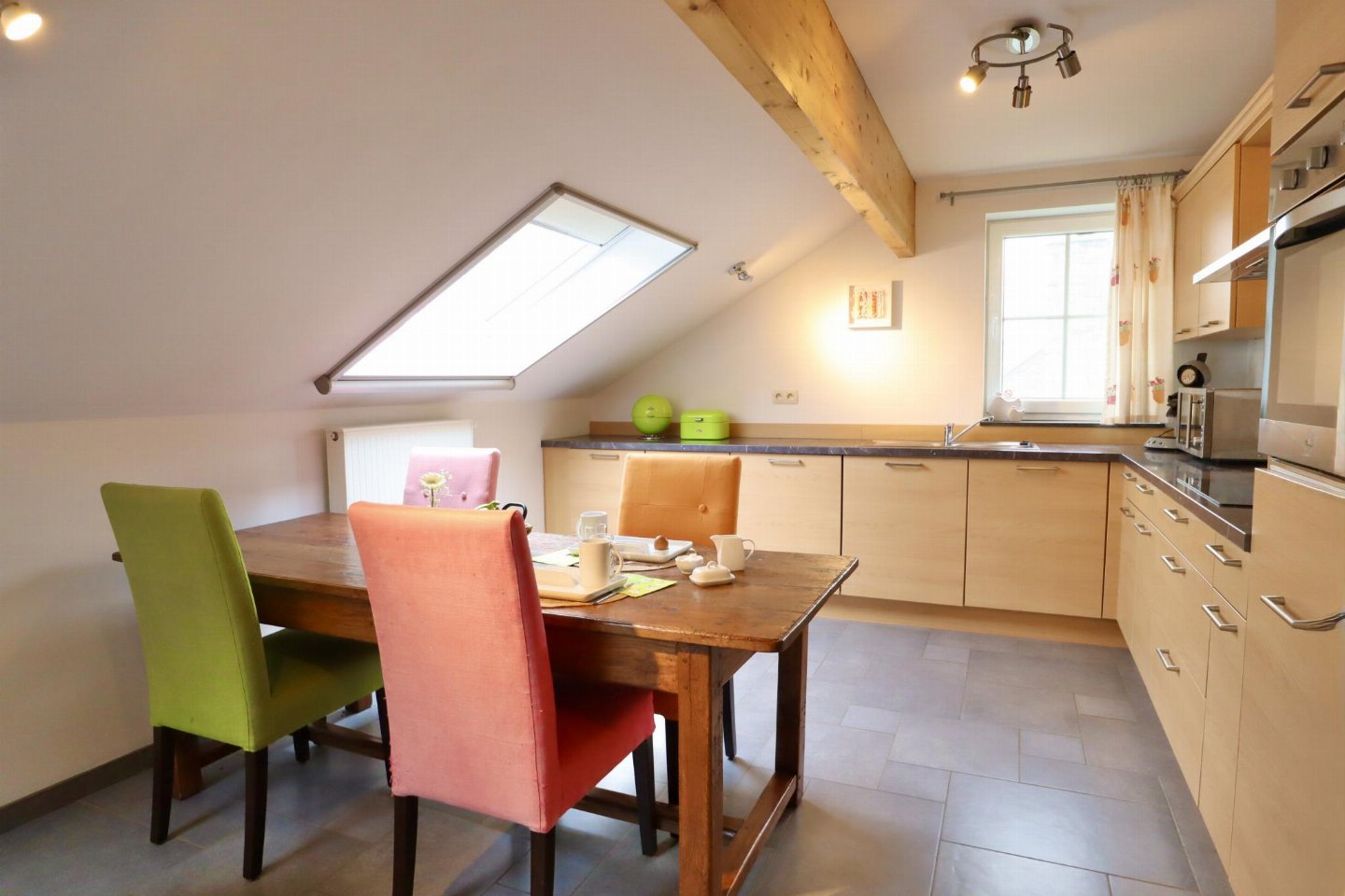 Op de 1e etage: open keuken met kookplaat(4 kookplaten, keramisch), afzuigkap, koffiezetapparaat(senseo pads), oven, magnetron, afwasmachine, koelkast , woon/eetkamer met 2-pers. slaapbank, TV, eettafel(4 personen) , slaapkamer met 2-pers. bed , badkamer met ligbad, douche, wastafel, wc
