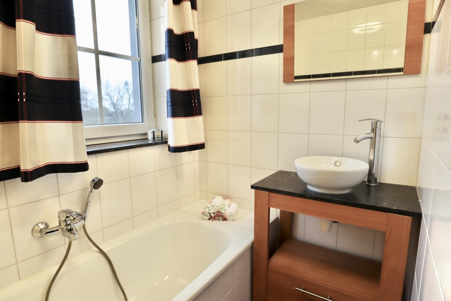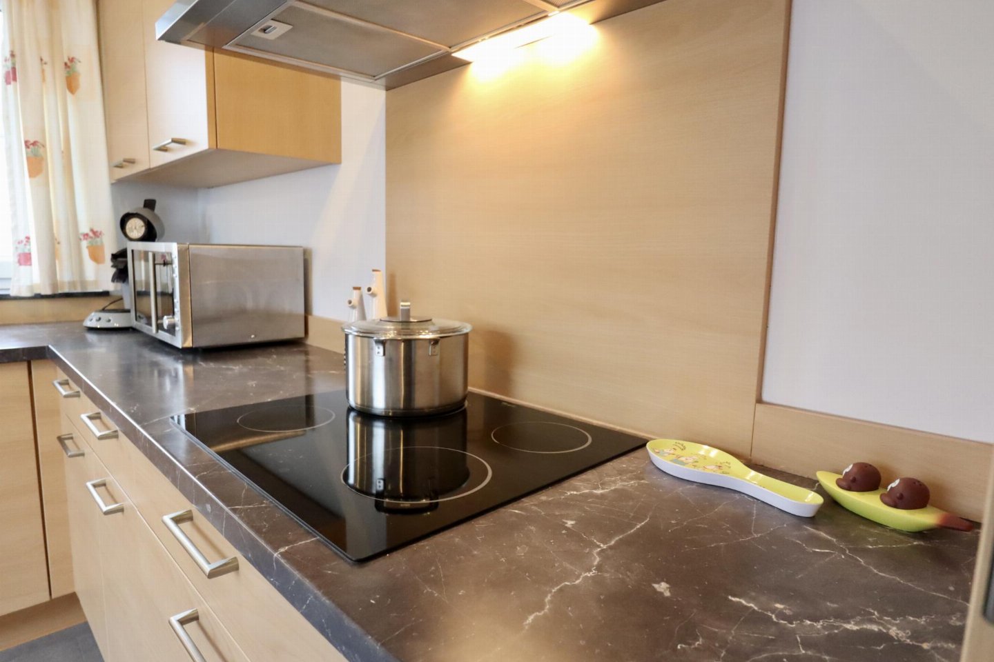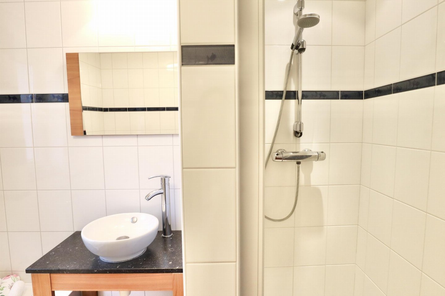 Op de 1e etage: open keuken met kookplaat(4 kookplaten, keramisch), afzuigkap, koffiezetapparaat(senseo pads), oven, magnetron, afwasmachine, koelkast , woon/eetkamer met 2-pers. slaapbank, TV, eettafel(4 personen) , slaapkamer met 2-pers. bed , badkamer met ligbad, douche, wastafel, wc