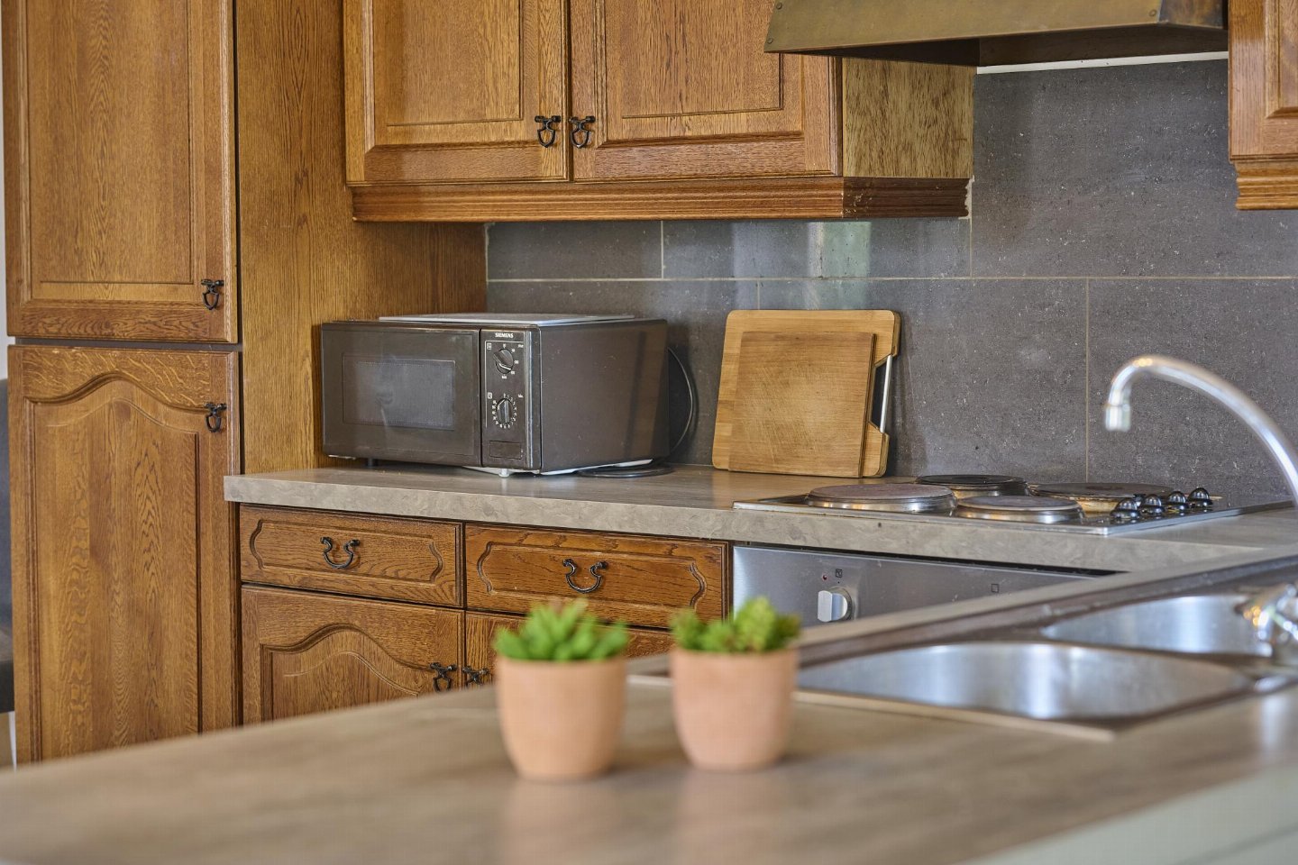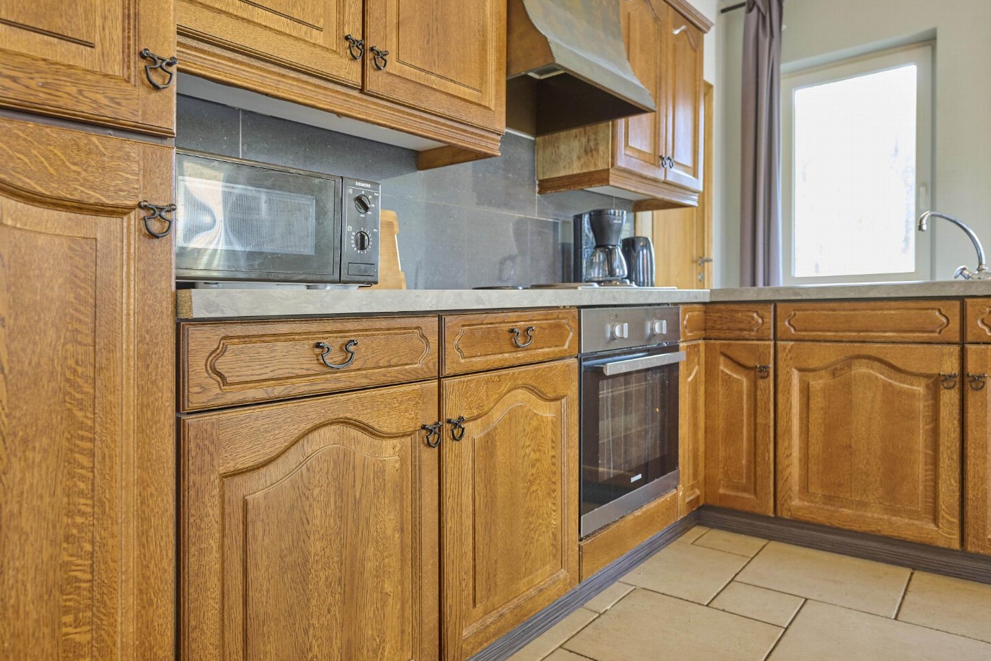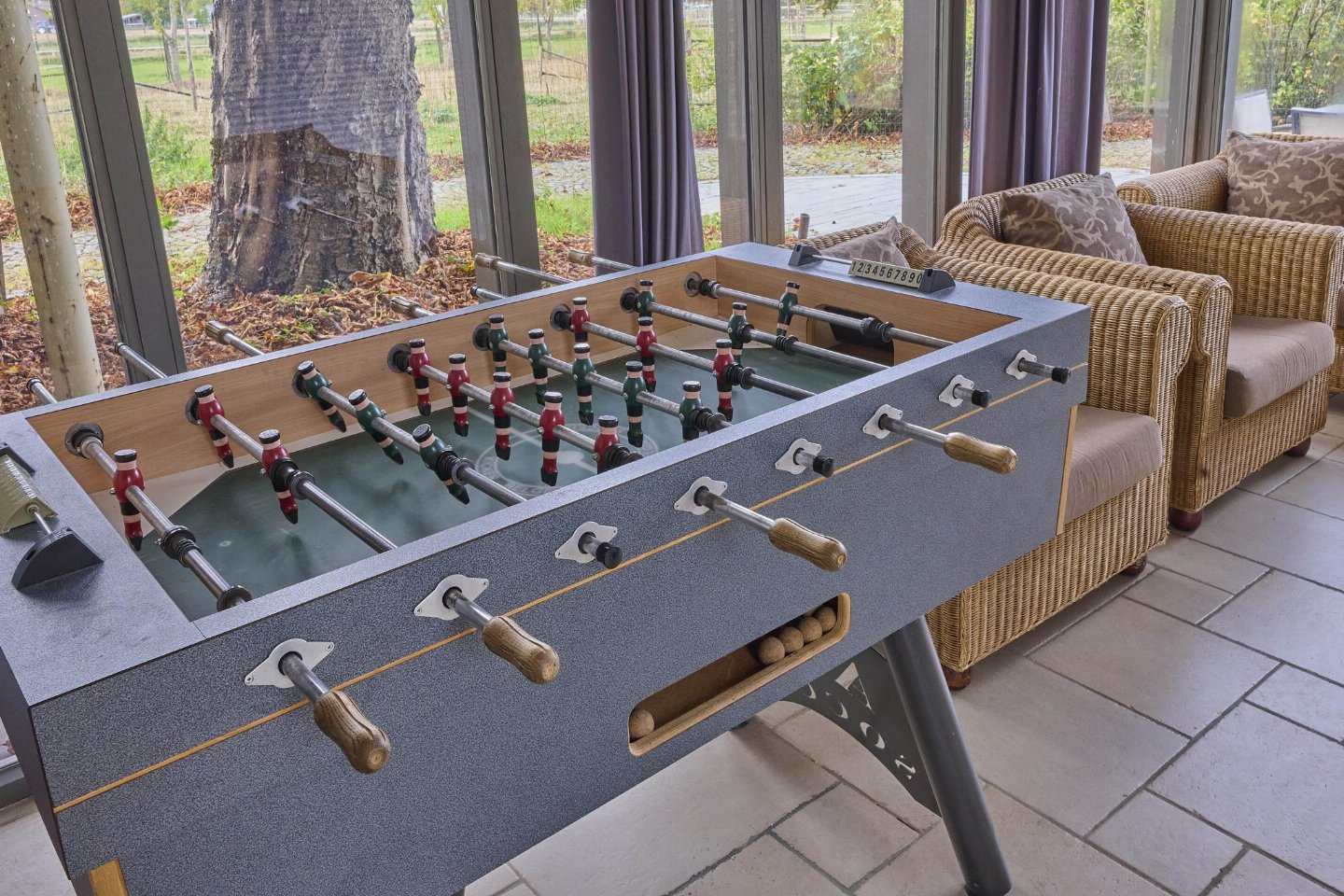 Begane grond: (open keuken met kookplaat (4 kookplaten, elektrisch), waterkoker, afzuigkap, koffiezetapparaat (filtermaling), oven, magnetron, koelkast), woon/eetkamer (TV, eettafel, zithoek), toilet (wc), tafelvoetbal).