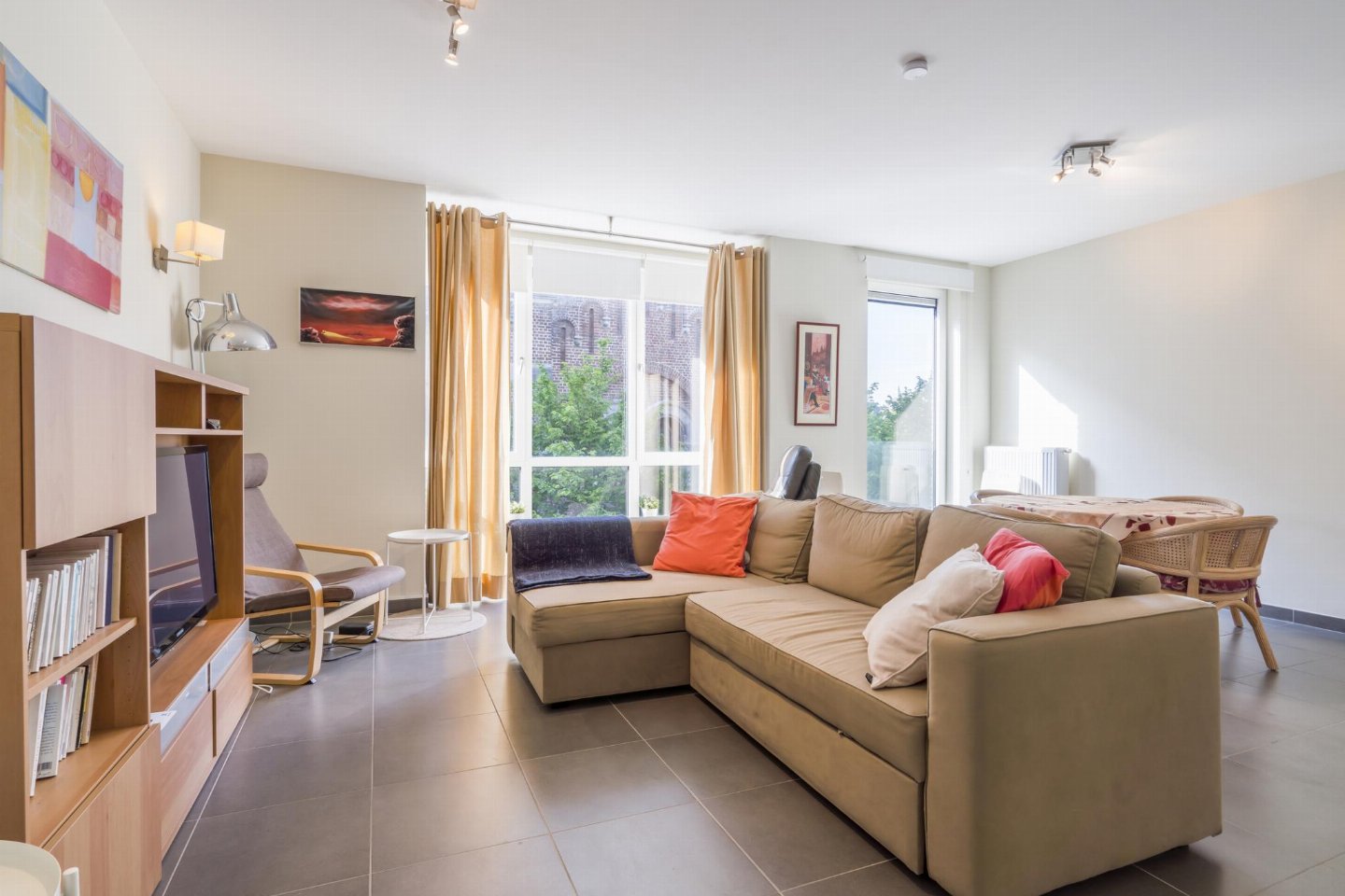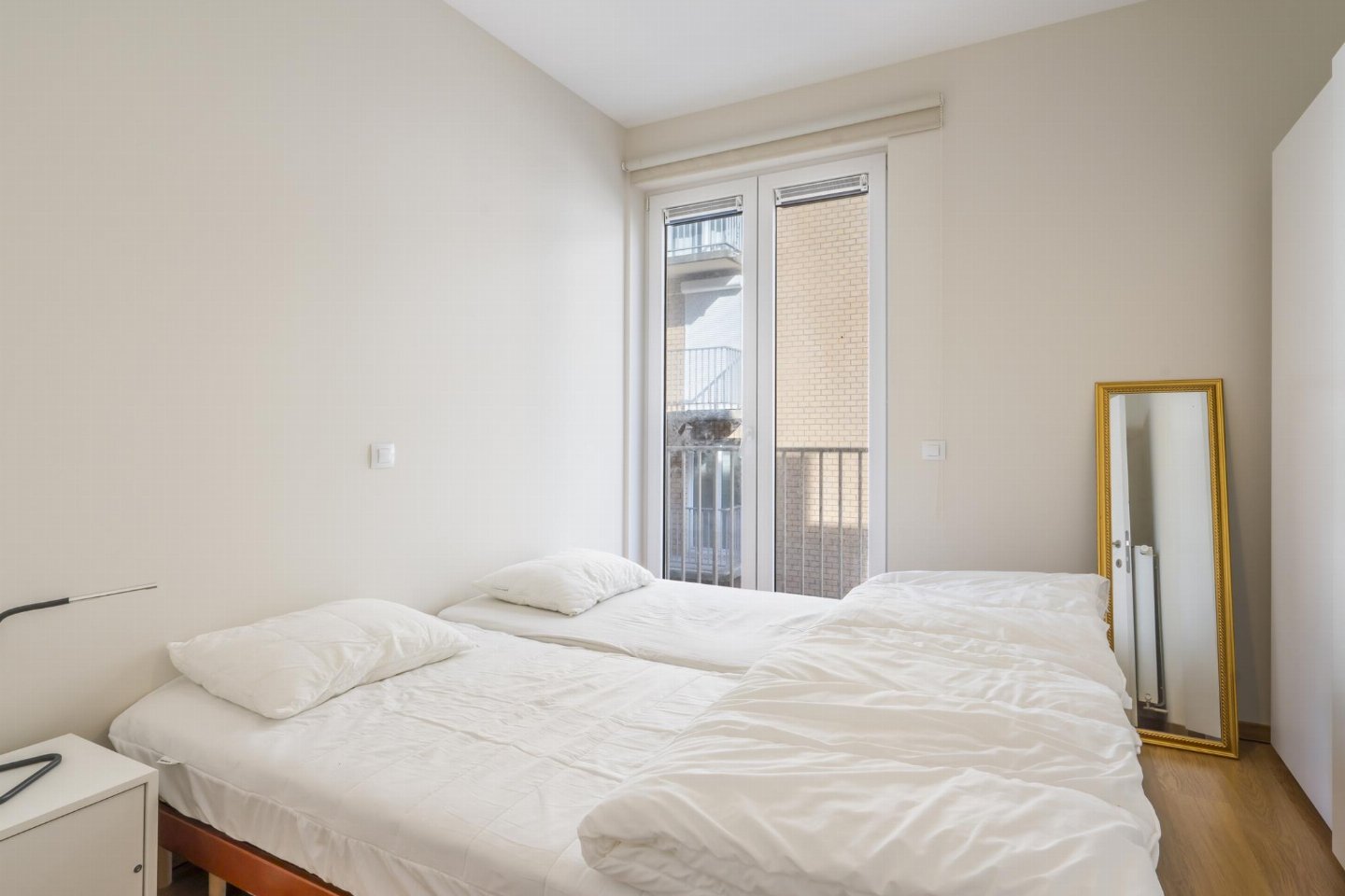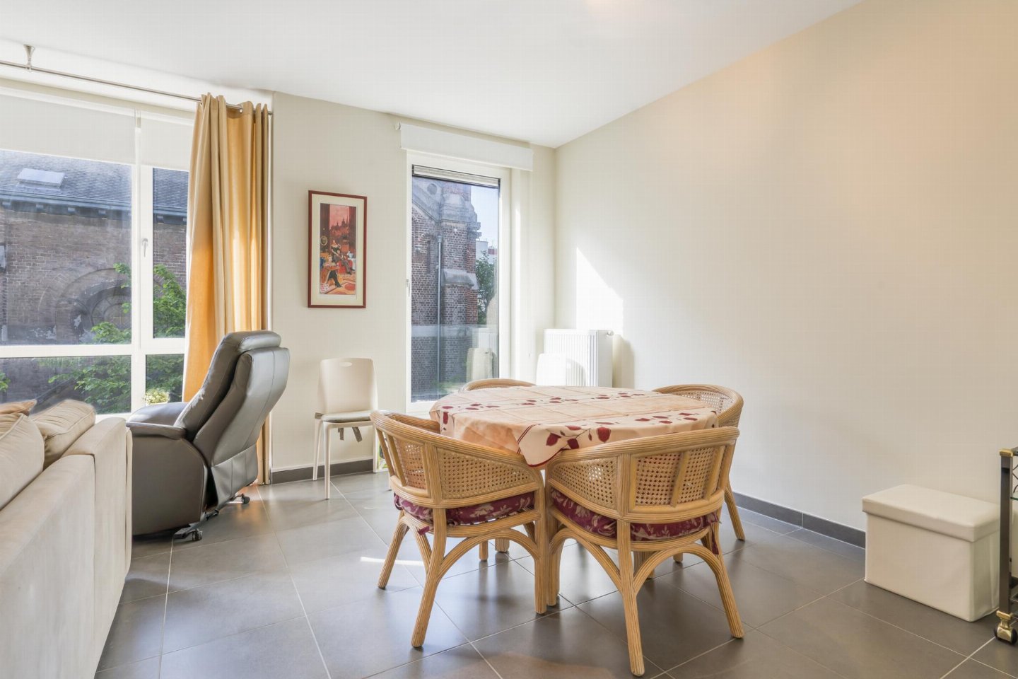 Ruim appartement op het sfeervolle Kerkplein, vlak bij centrum, winkels en terrasjes. Woonkamer met eetgedeelte, uitzicht op de kerk en slaapbank voor 1. Open, volledig uitgeruste keuken. 2 slaapkamers achteraan: één met tweepersoonsbed en één met uittrekbaar tweepersoonsbed.