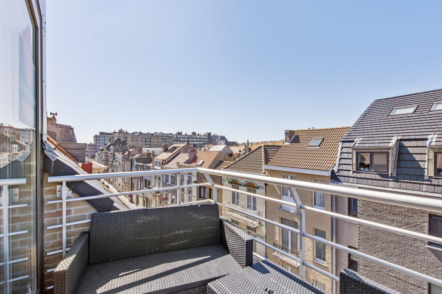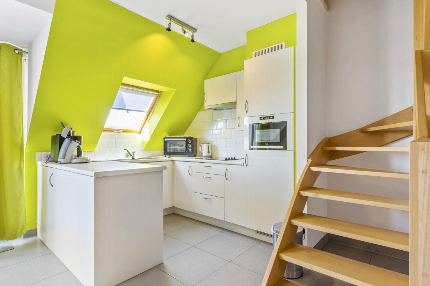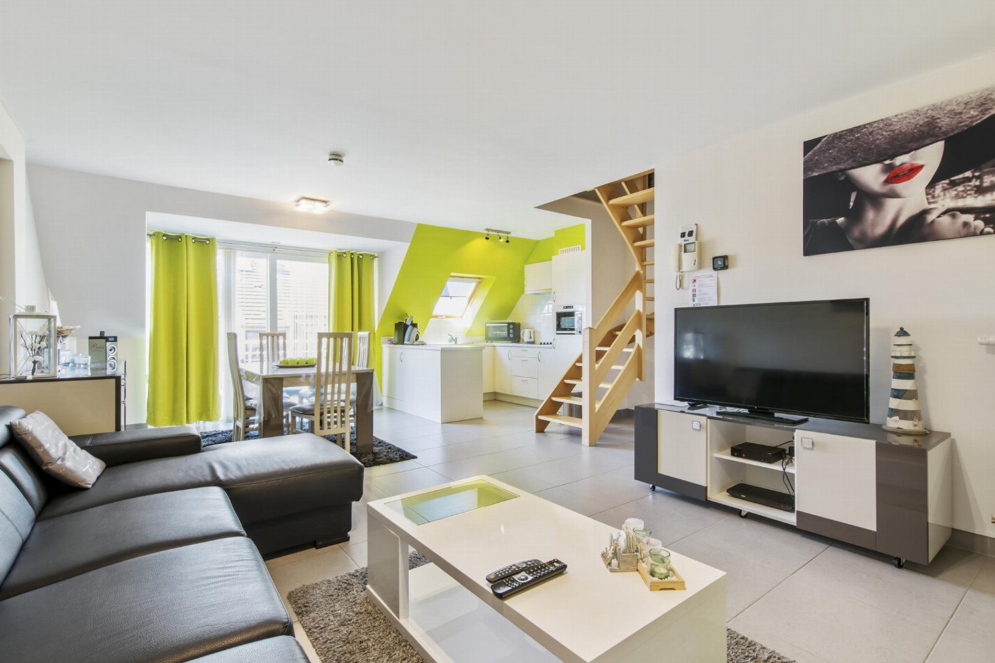 Comfortabele duplex aan de Markt. Op de 4de verdieping: ruime woonkamer met open ingerichte keuken, slaapkamer, dressing, badkamer met inloopdouche, apart toilet en terras met zicht op de Markt. Bovenverdieping: 2de slaapkamer en badkamer met douche en toilet. Gemeenschappelijke fietsenstalling in het gebouw. Autostaanplaats inbegrepen (max. hoogte 1m70). Ideaal voor een zorgeloze vakantie!