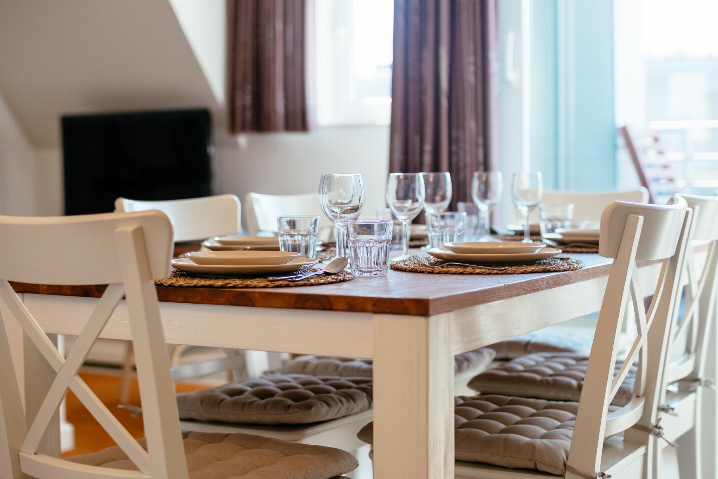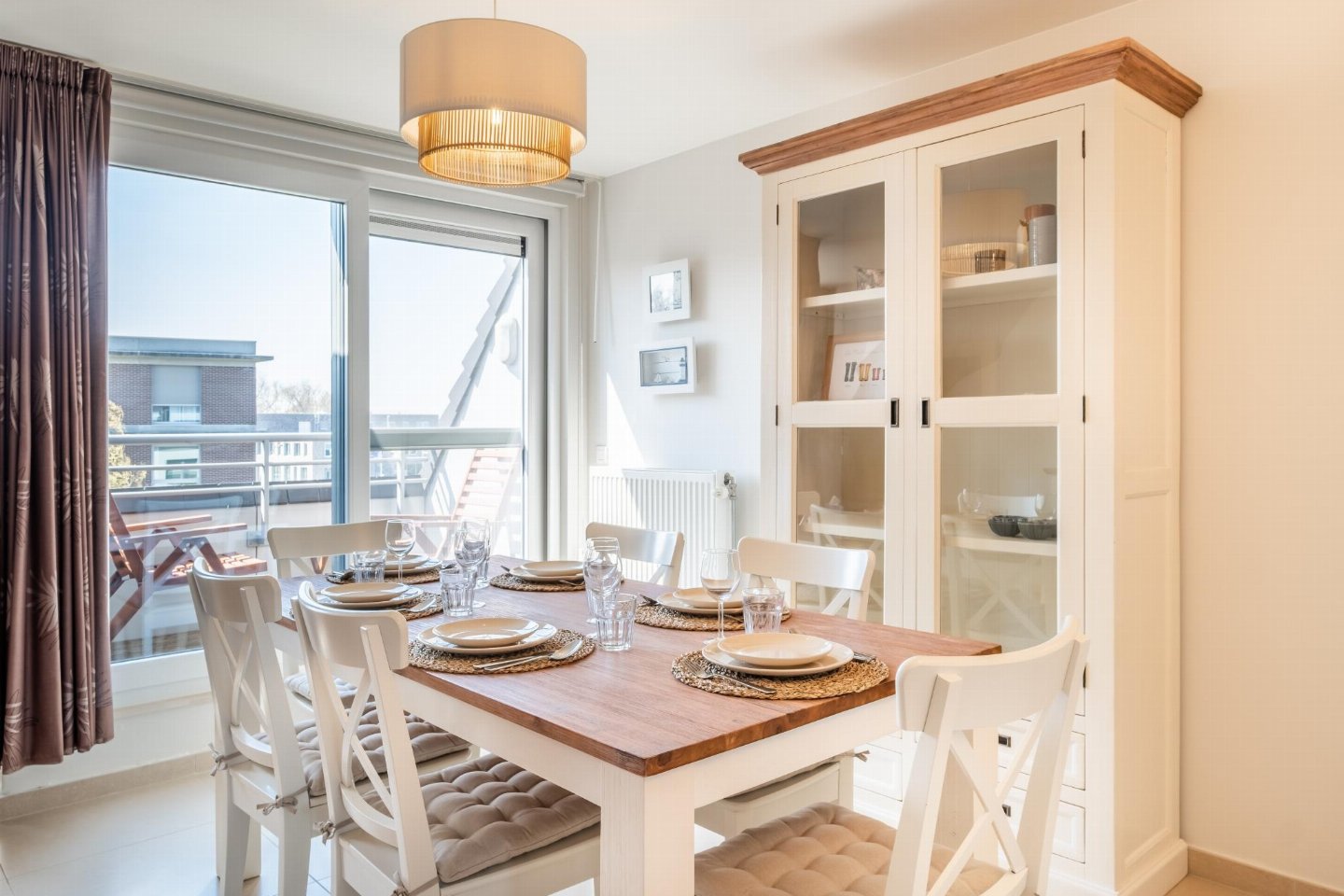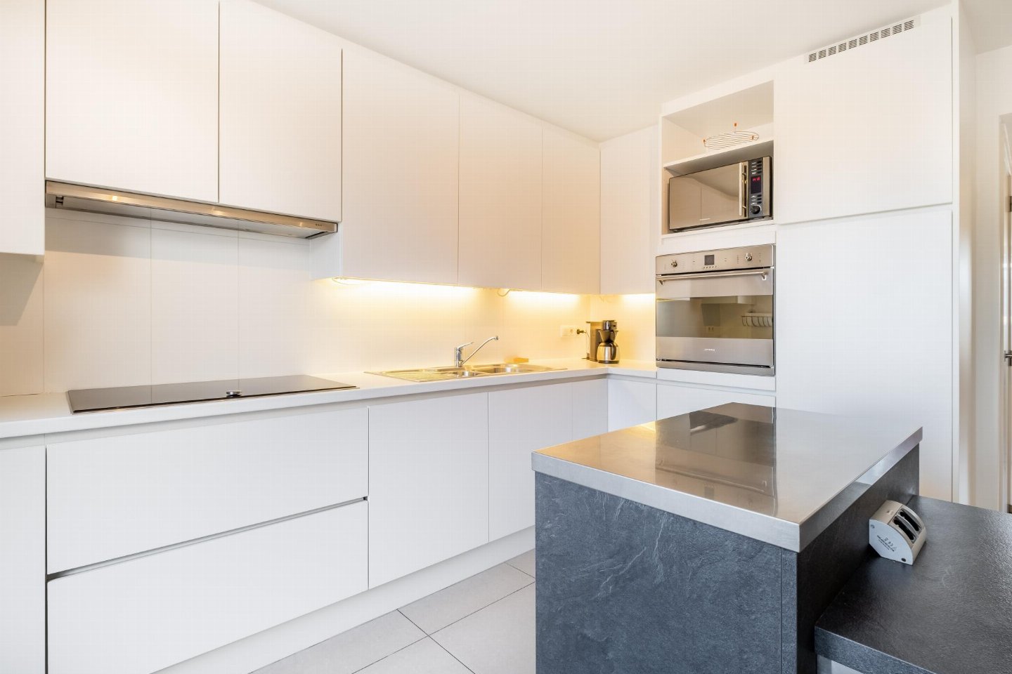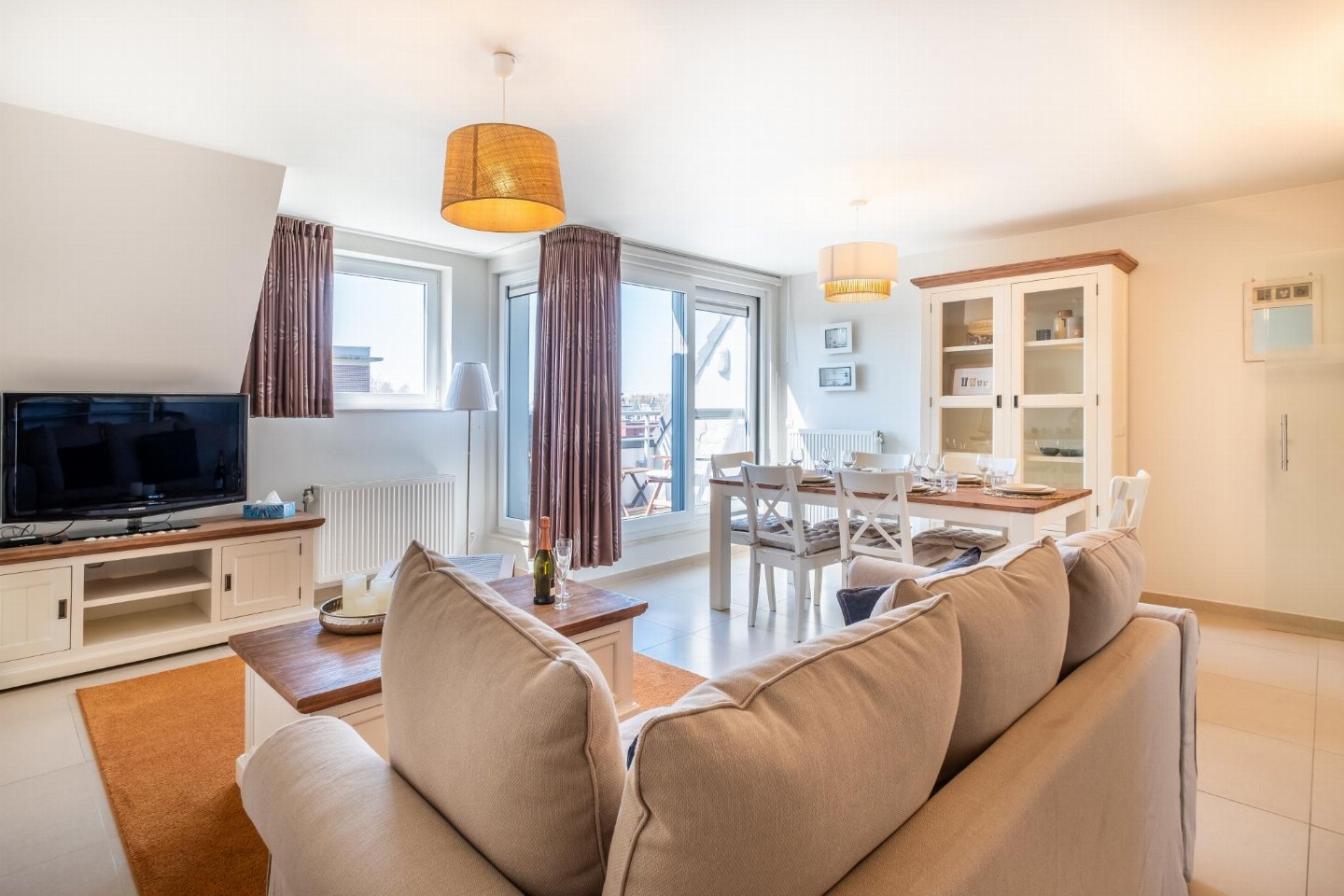 Op de 3e etage: open keuken met kookplaat, waterkoker, broodrooster, afzuigkap, koffiezetapparaat(filtermaling, pads), oven, magnetron, afwasmachine, koelkast, Staafmixer , woon/eetkamer met 2-pers. slaapbank(2 persoons dekbed), TV(flatscreen, digital), eettafel, zithoek , toilet met wc , 2x balkon