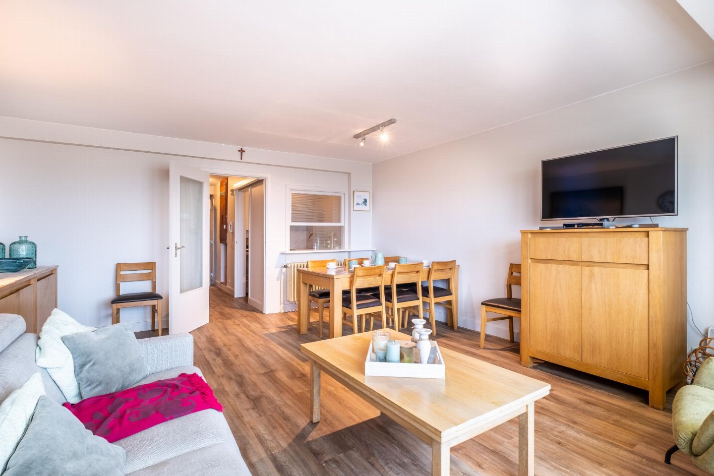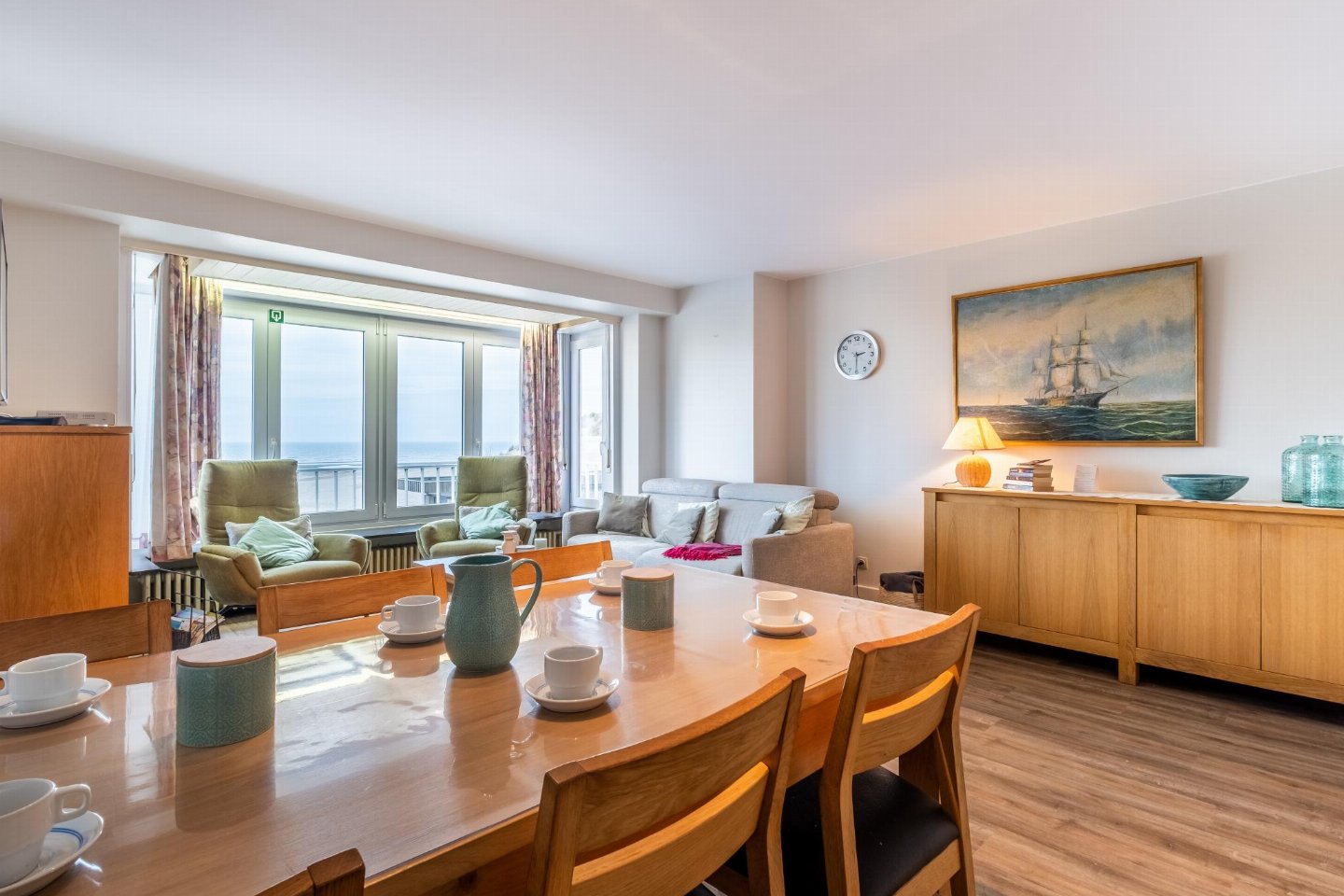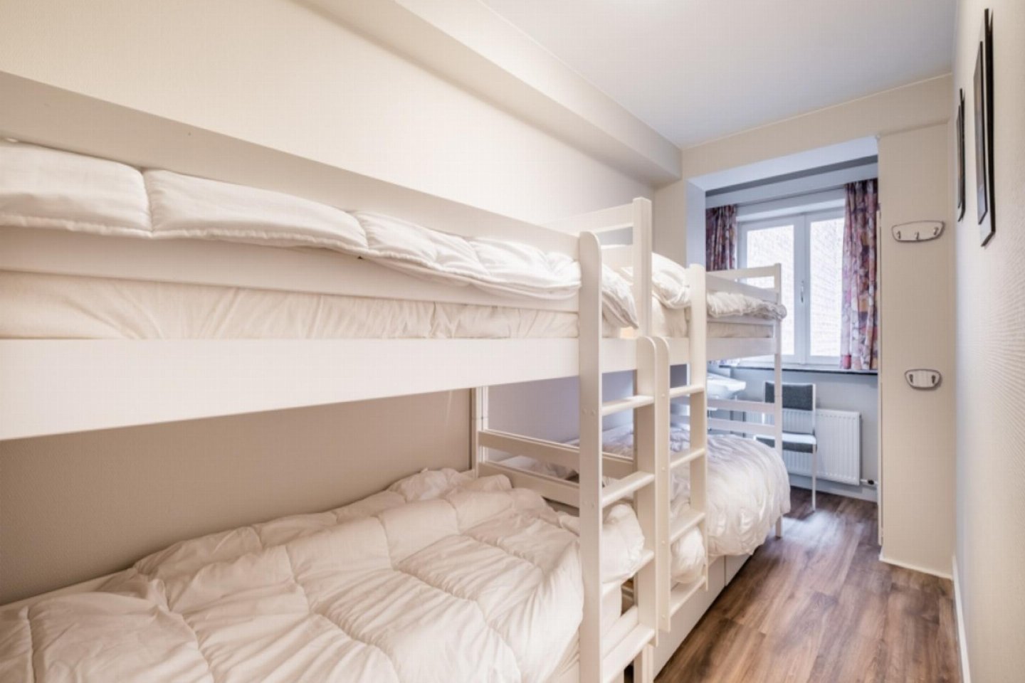 Op de 1e etage: (keuken(kookplaat, waterkoker, afzuigkap, koffiezetapparaat(filtermaling), oven, magnetron, koelkast), woon/eetkamer(TV(flatscreen, digital), eettafel, zithoek), slaapkamer(2-pers. bed(2 persoons dekbed)), slaapkamer(2x stapelbed(dekbed, 90 x 190 cm)), badkamer(bad met douche, wastafel), toilet(wc), stofzuiger, balkon, strijkplank, strijkijzer)