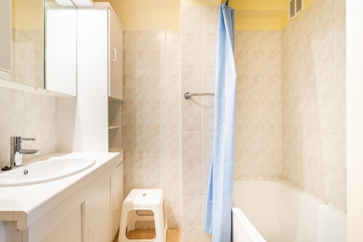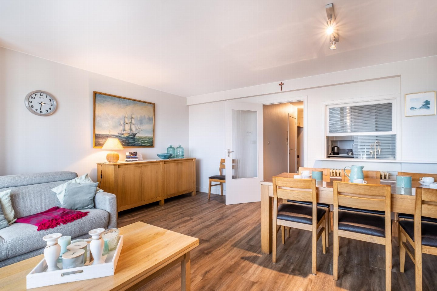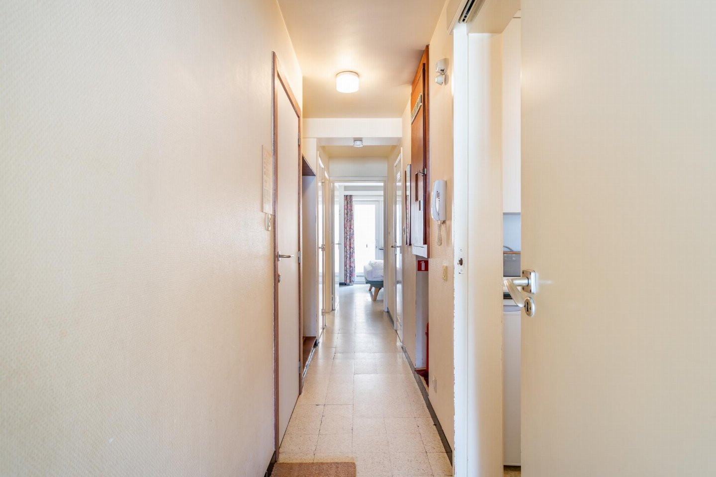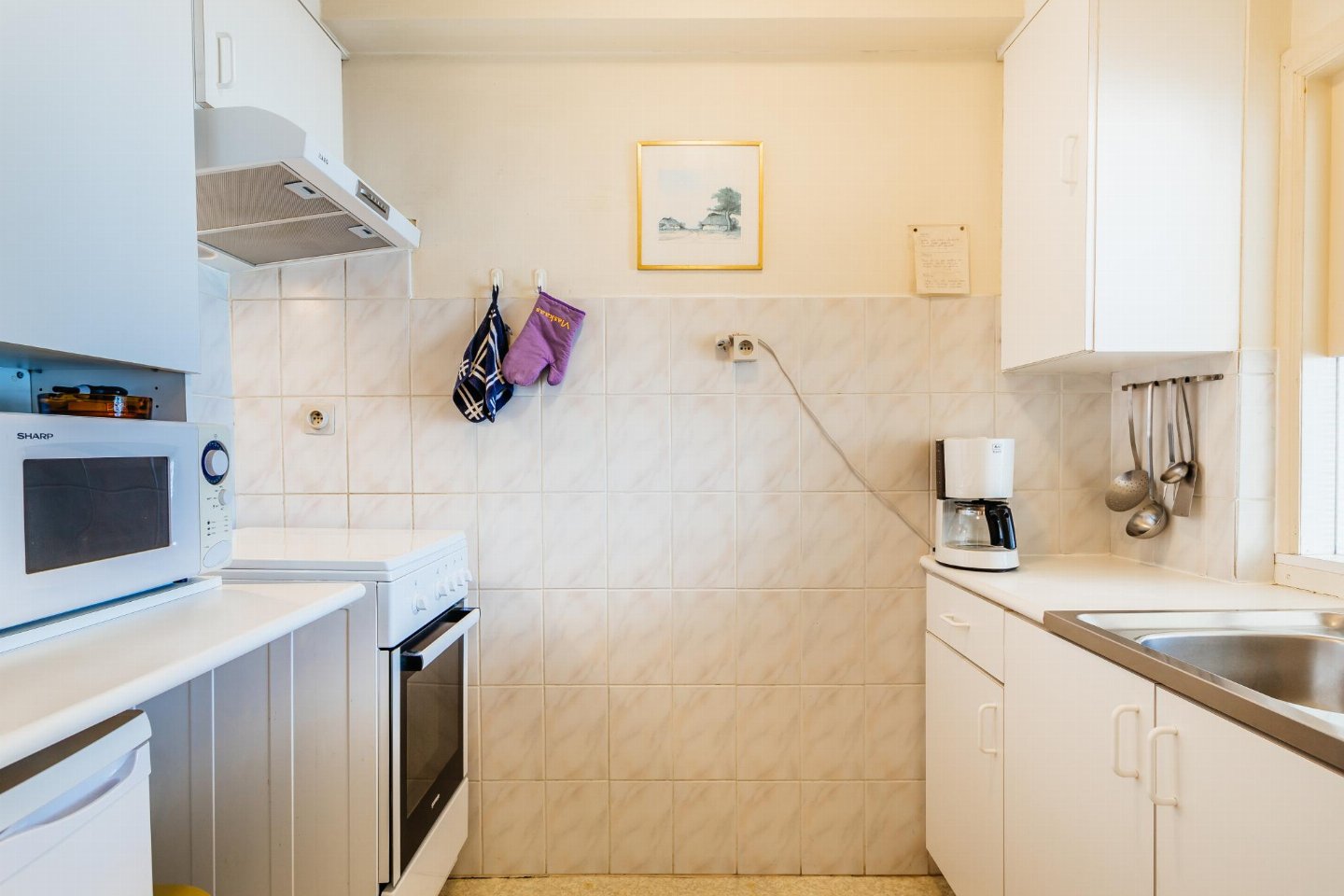 Op de 1e etage: (keuken(kookplaat, waterkoker, afzuigkap, koffiezetapparaat(filtermaling), oven, magnetron, koelkast), woon/eetkamer(TV(flatscreen, digital), eettafel, zithoek), slaapkamer(2-pers. bed(2 persoons dekbed)), slaapkamer(2x stapelbed(dekbed, 90 x 190 cm)), badkamer(bad met douche, wastafel), toilet(wc), stofzuiger, balkon, strijkplank, strijkijzer)