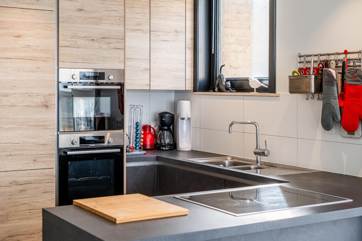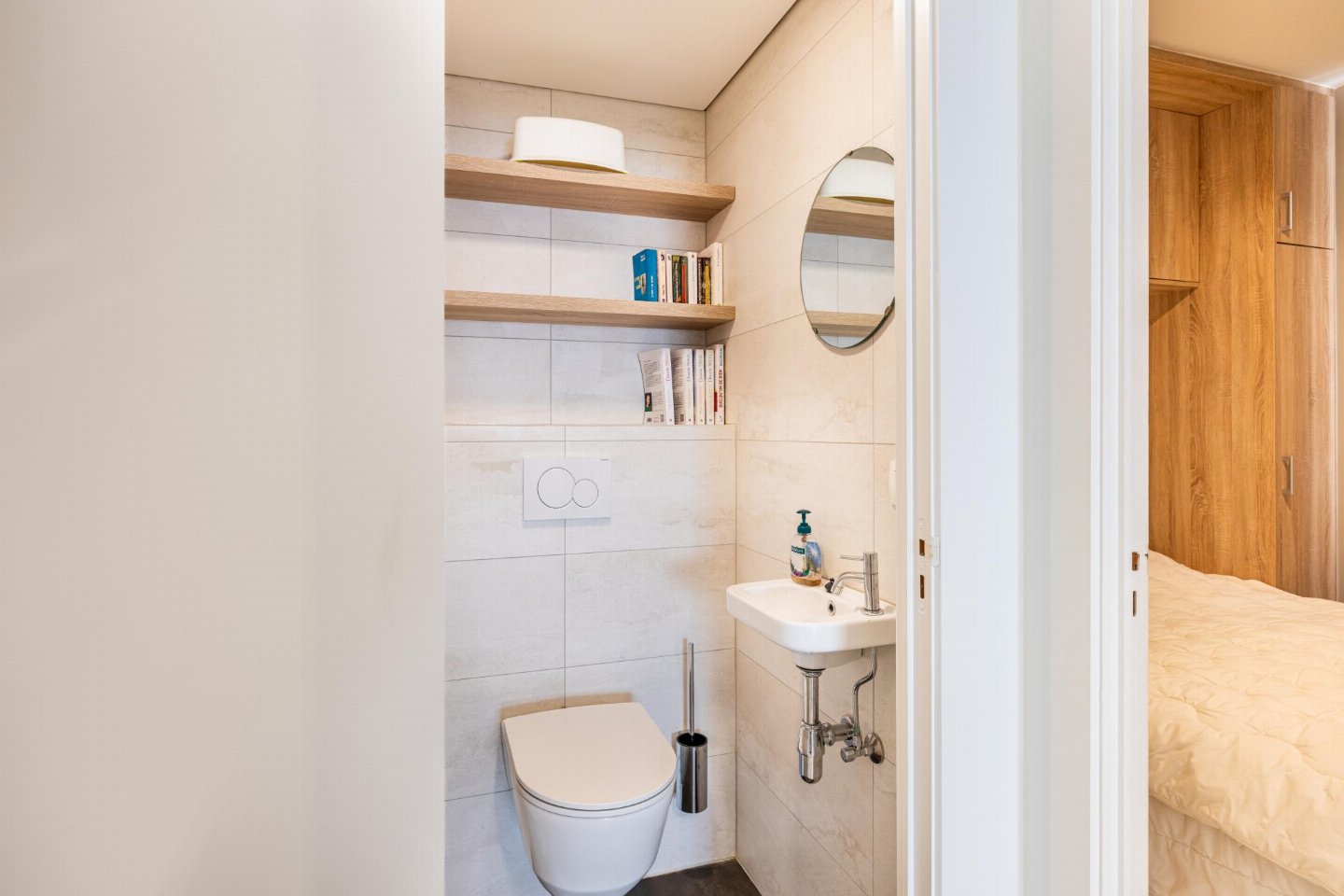 Op de 1e etage: (open keuken(kookplaat(keramisch), waterkoker, broodrooster, afzuigkap, koffiezetapparaat(filtermaling, nespresso cups), oven(hetelucht), magnetron, afwasmachine, koel-/vriescombinatie), woon/eetkamer(2-pers. slaapbank(2 persoons dekbed), TV(flatscreen, digital), eettafel, zithoek), 2x slaapkamer(2-pers. bed(2 persoons dekbed)), slaapkamer(stapelbed(dekbed)), badkamer(douche(inloopdouche), 2x wastafel), toilet(wc), stofzuiger, balkon, tuinmeubilair(2 personen))