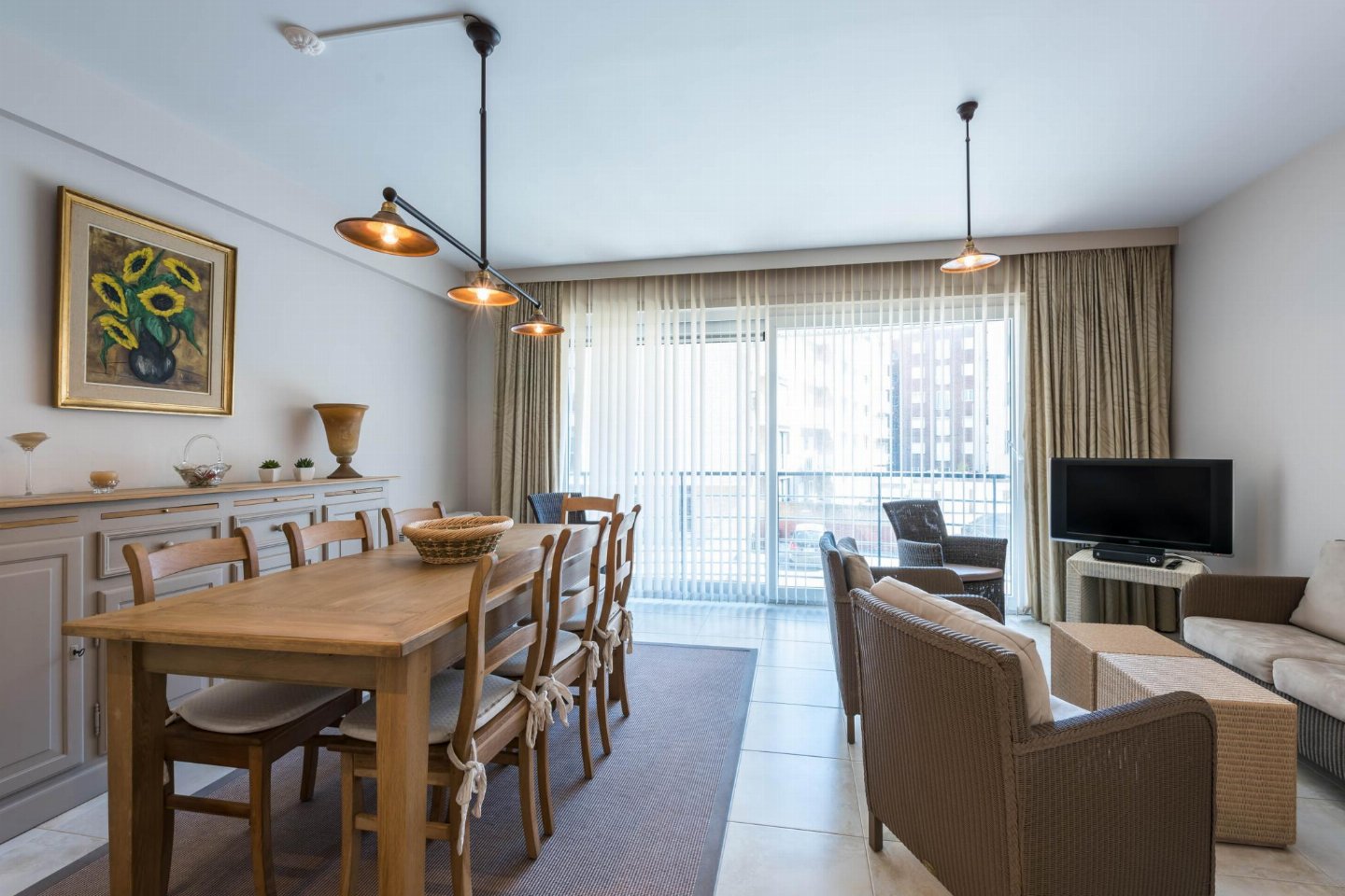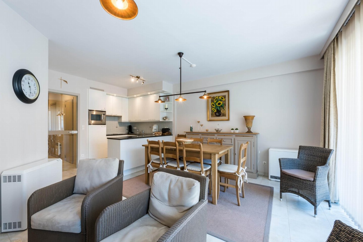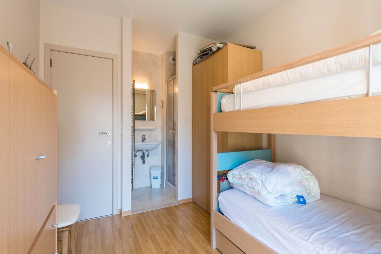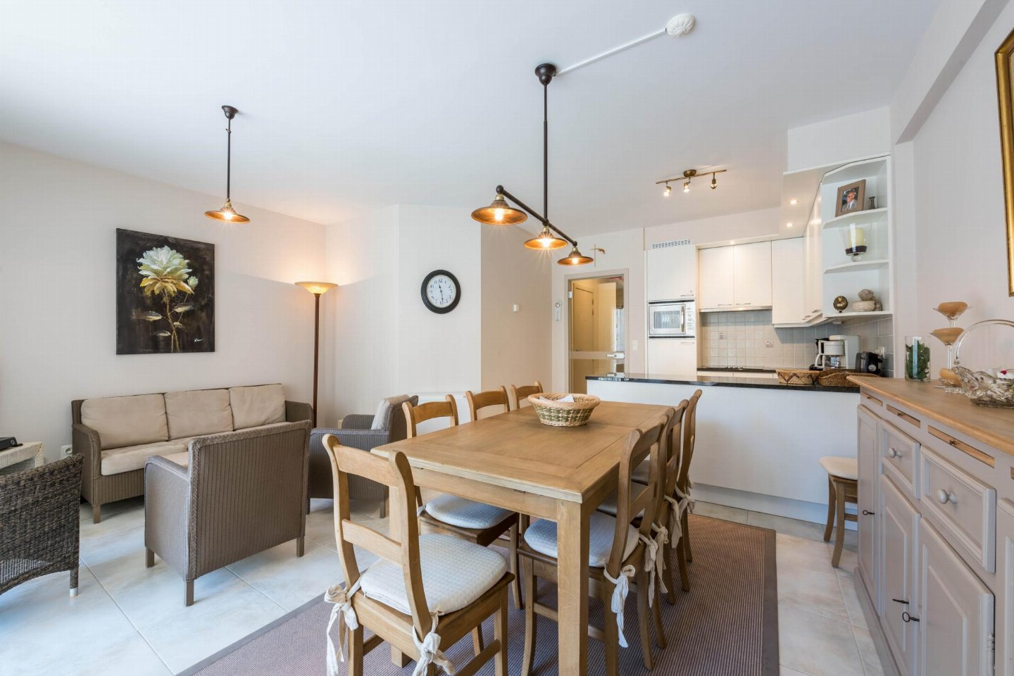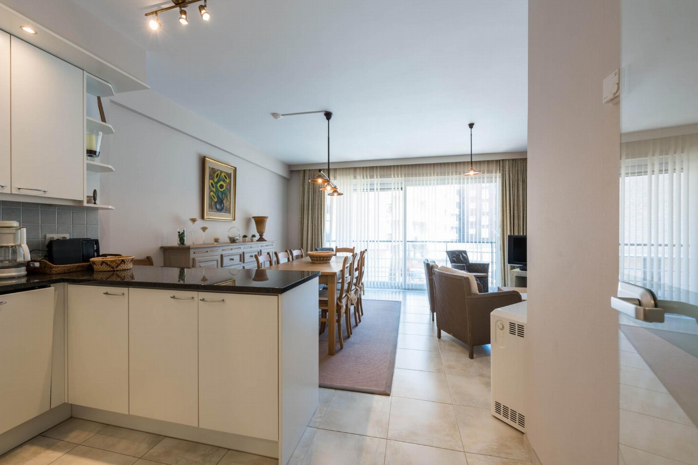 Op de 1e etage: (open keuken(kookplaat(keramisch), koffiezetapparaat(filtermaling, senseo pads), combimagnetron, afwasmachine, koelkast( vriesvak), Staafmixer), woon/eetkamer(TV(flatscreen, digital), eettafel, zithoek, radio), slaapkamer(2-pers. bed(2 persoons dekbed)), slaapkamer met badkamer(1-pers. onderschuifbed(dekbed), stapelbed(dekbed), douche, wastafel), badkamer(ligbad, 2x wastafel), toilet(wc), wasdroger, wasmachine, stofzuiger, 2x balkon, tuinmeubilair, strijkplank, strijkijzer)