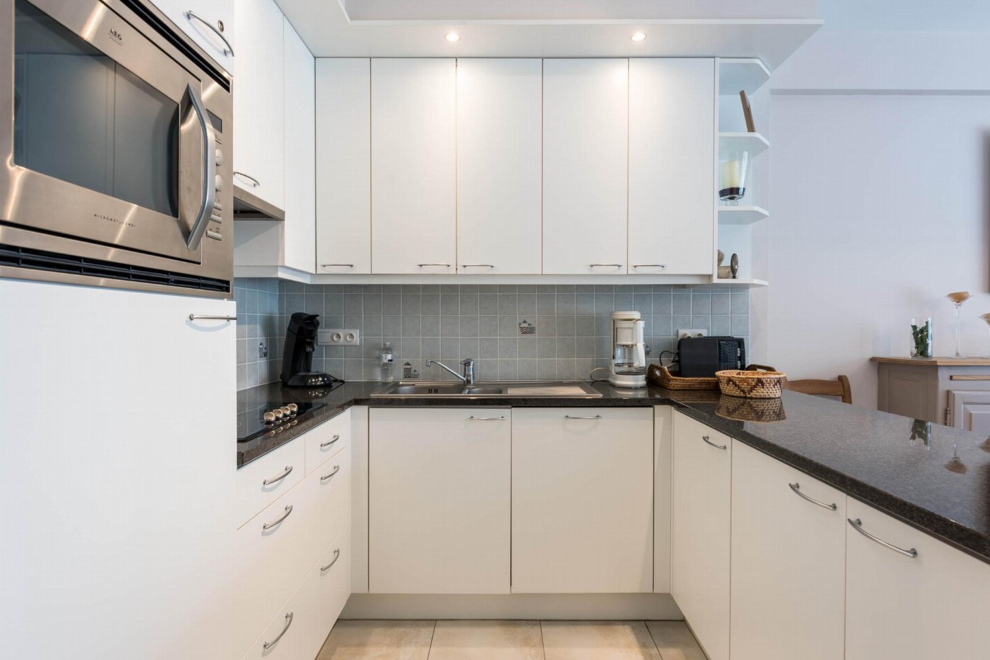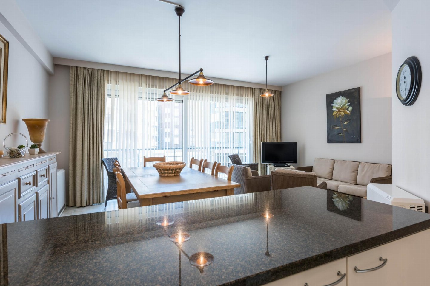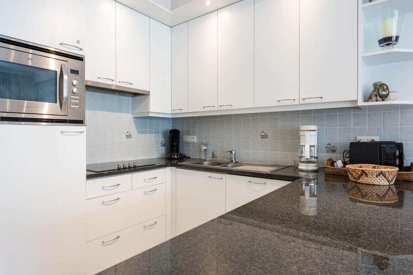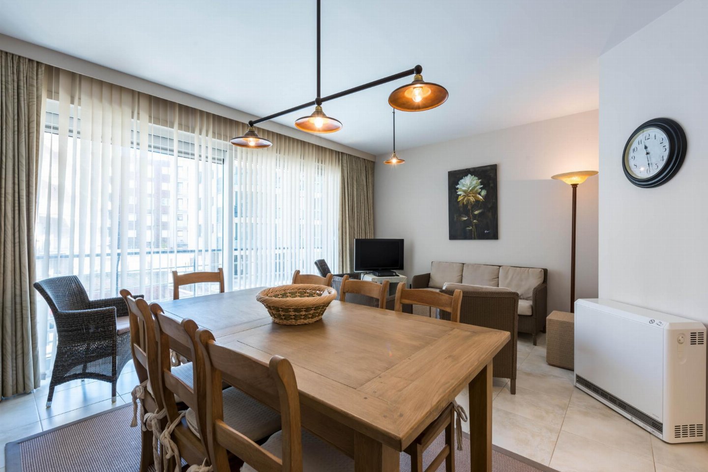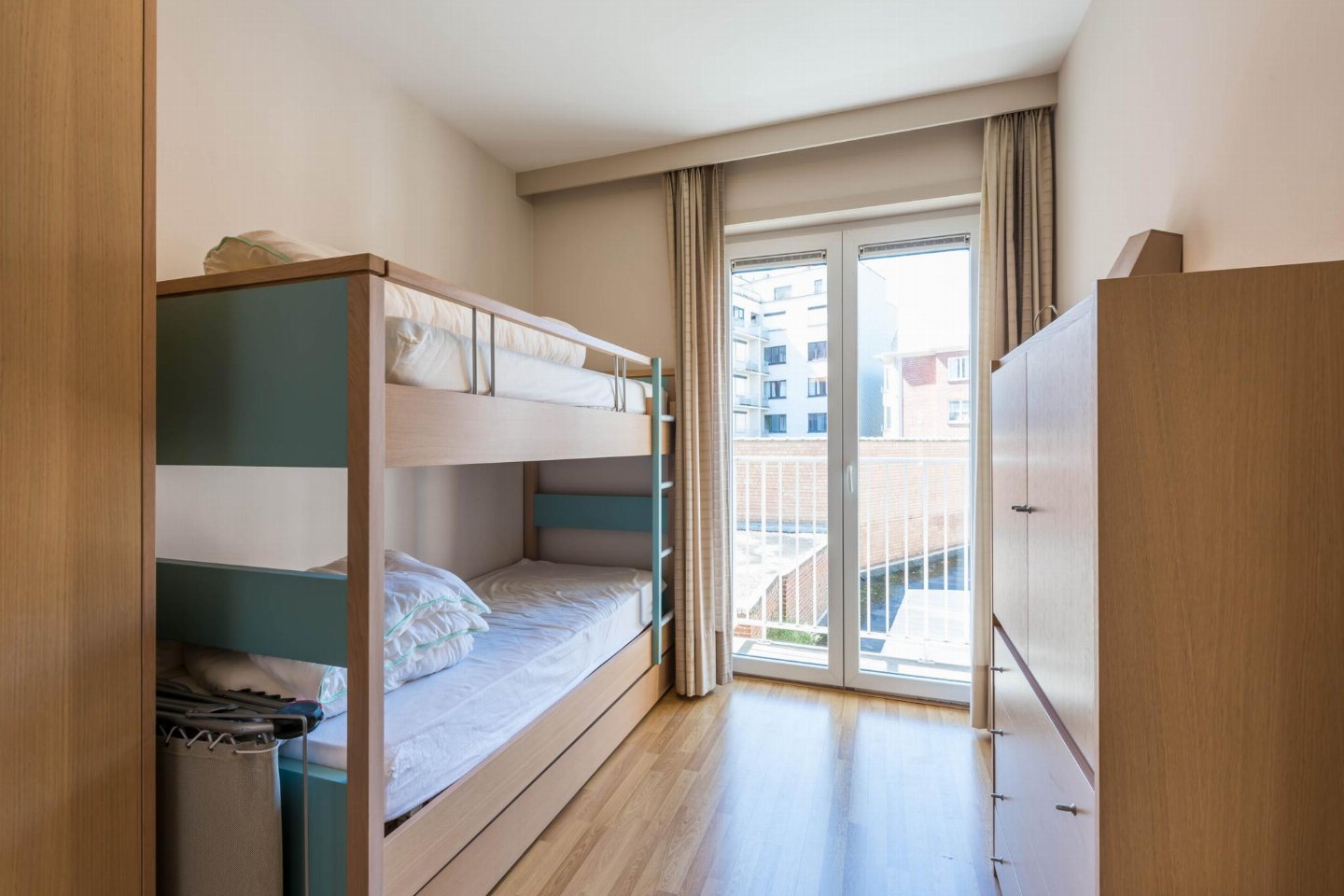 Op de 1e etage: (open keuken(kookplaat(keramisch), koffiezetapparaat(filtermaling, senseo pads), combimagnetron, afwasmachine, koelkast( vriesvak), Staafmixer), woon/eetkamer(TV(flatscreen, digital), eettafel, zithoek, radio), slaapkamer(2-pers. bed(2 persoons dekbed)), slaapkamer met badkamer(1-pers. onderschuifbed(dekbed), stapelbed(dekbed), douche, wastafel), badkamer(ligbad, 2x wastafel), toilet(wc), wasdroger, wasmachine, stofzuiger, 2x balkon, tuinmeubilair, strijkplank, strijkijzer)
