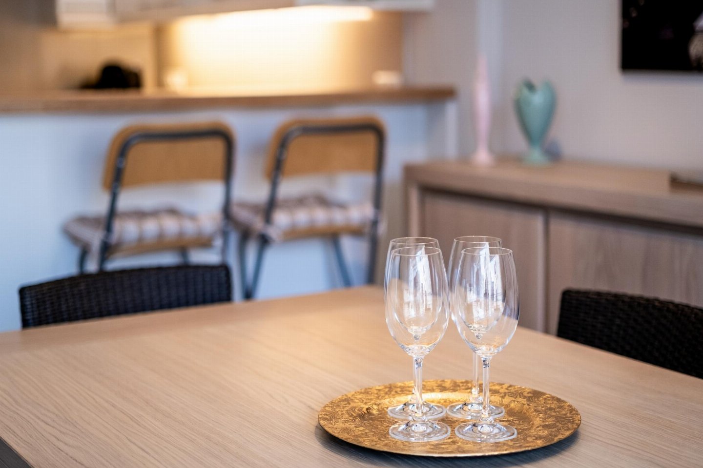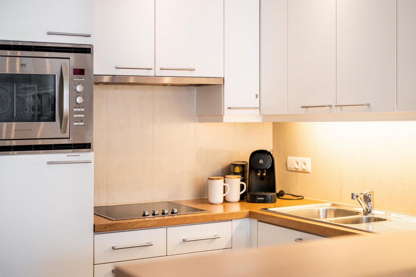 Op de 2e etage: (open keuken(kookplaat(keramisch), waterkoker, broodrooster, koffiezetapparaat(nespresso cups), combimagnetron, afwasmachine, koelkast( vriesvak), Staafmixer), woon/eetkamer(1-pers. vouwbed(dekbed, 80 x 200 cm), TV(flatscreen, digital, smart TV), eettafel, zithoek, radio), slaapkamer(2-pers. bed(2 persoons dekbed)), slaapkamer met badkamer(2-pers. bed(2 persoons dekbed), douche, wastafel), badkamer(ligbad, 2x wastafel), toilet(wc), wasmachine, stofzuiger, 2x balkon, tuinmeubilair, 1x kinderbed (excl. beddengoed), strijkplank, strijkijzer, gezelschapsspellen)