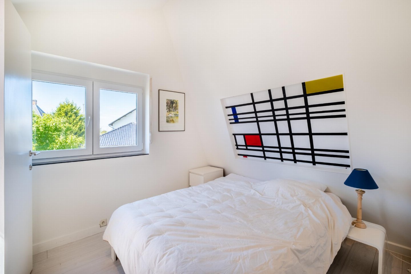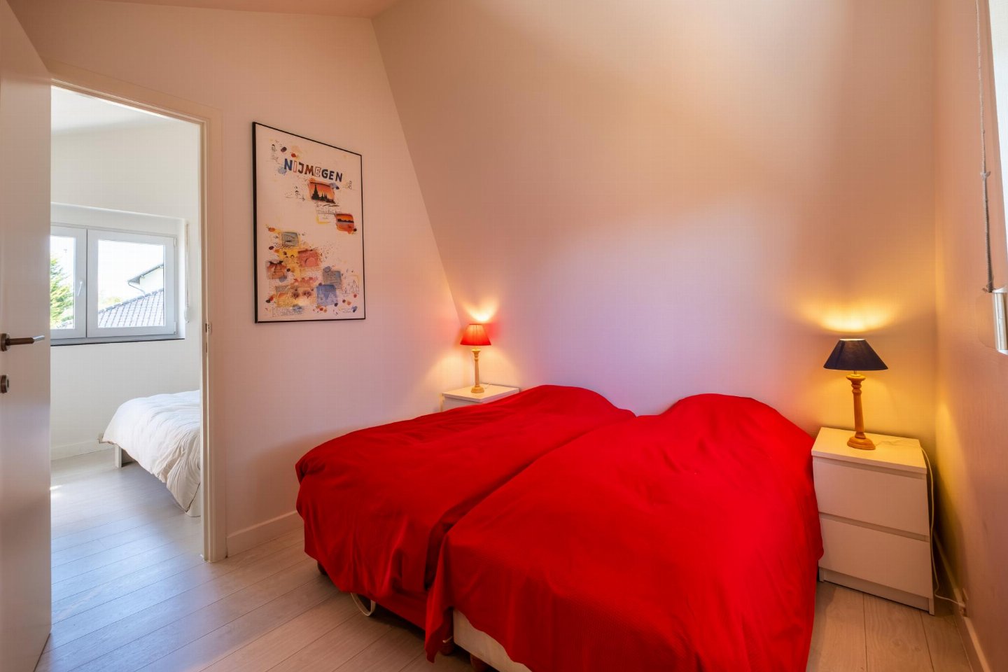 Op de 1e etage: (doorloop slaapkamer(2-pers. bed(2 persoons dekbed)), doorloop kamer(2x 1-pers. bed(dekbed)), badkamer(ligbad, douche, wastafel, wc))