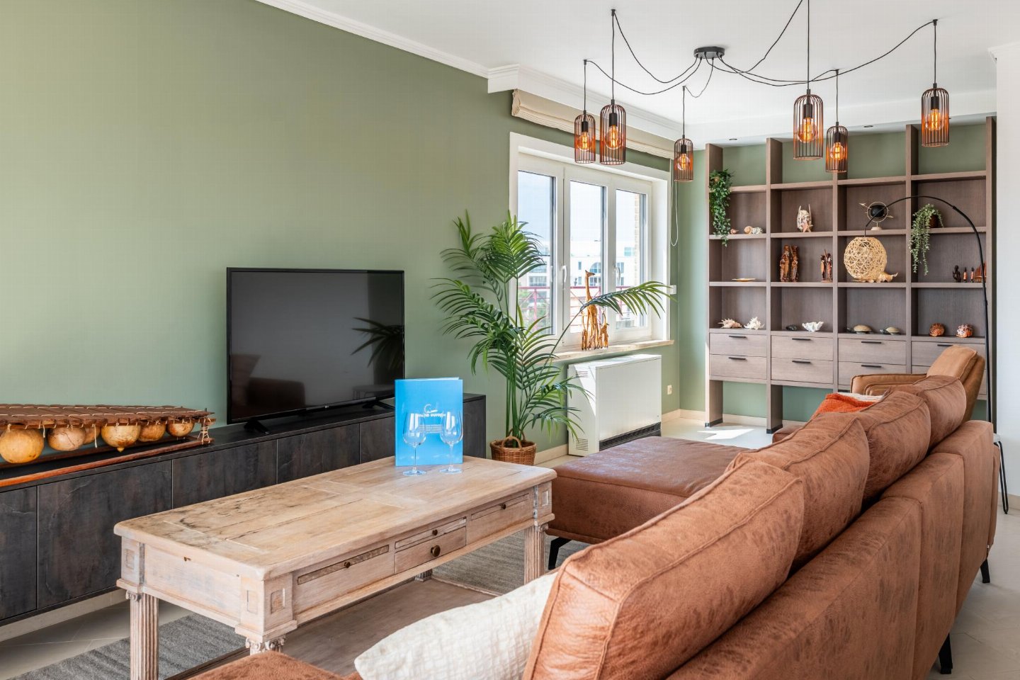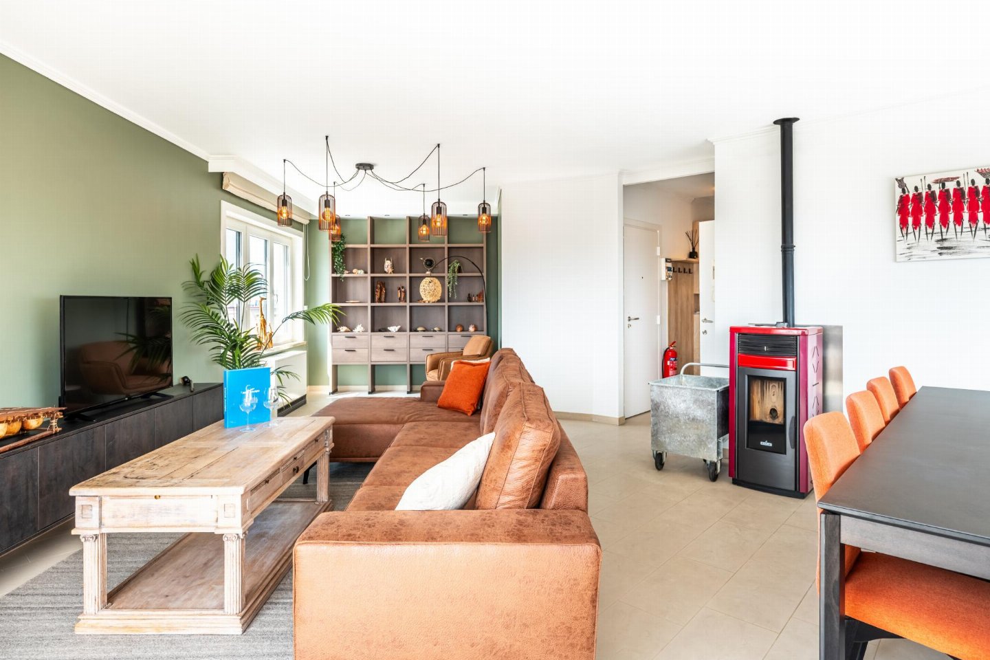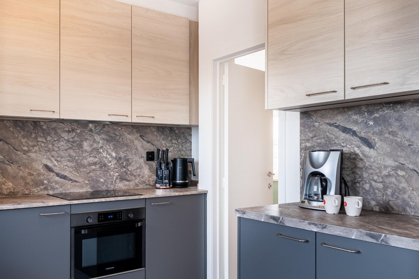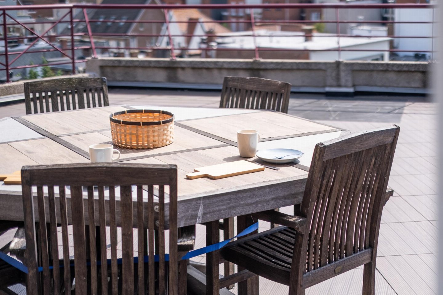 Op de 5e etage: (keuken(eettafel, kookplaat(keramisch), waterkoker, broodrooster, afzuigkap, koffiezetapparaat(filtermaling), combimagnetron, afwasmachine, koelkast( ijsmachine, vriesvak, Amerikaans), Staafmixer), woon/eetkamer(TV(flatscreen, digital), eettafel, kachel(Pellet), zithoek), 2x slaapkamer(2-pers. bed(2 persoons dekbed)), slaapkamer(1-pers. bed(dekbed), stapelbed(dekbed)), badkamer(douche, wastafel), badkamer(wasdroger, ligbad, douche, 2x wastafel, wasmachine), toilet(wc), 2x stofzuiger, dakterras, tuinmeubilair, 1x kinderbed (excl. beddengoed))