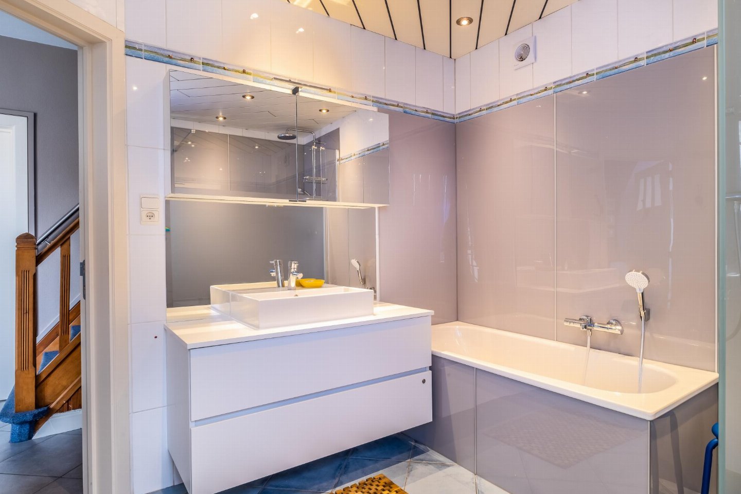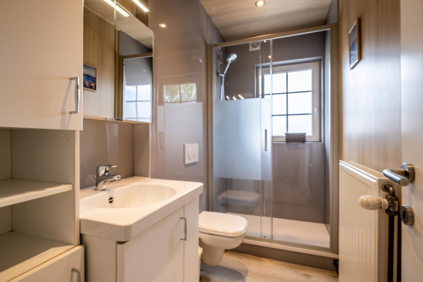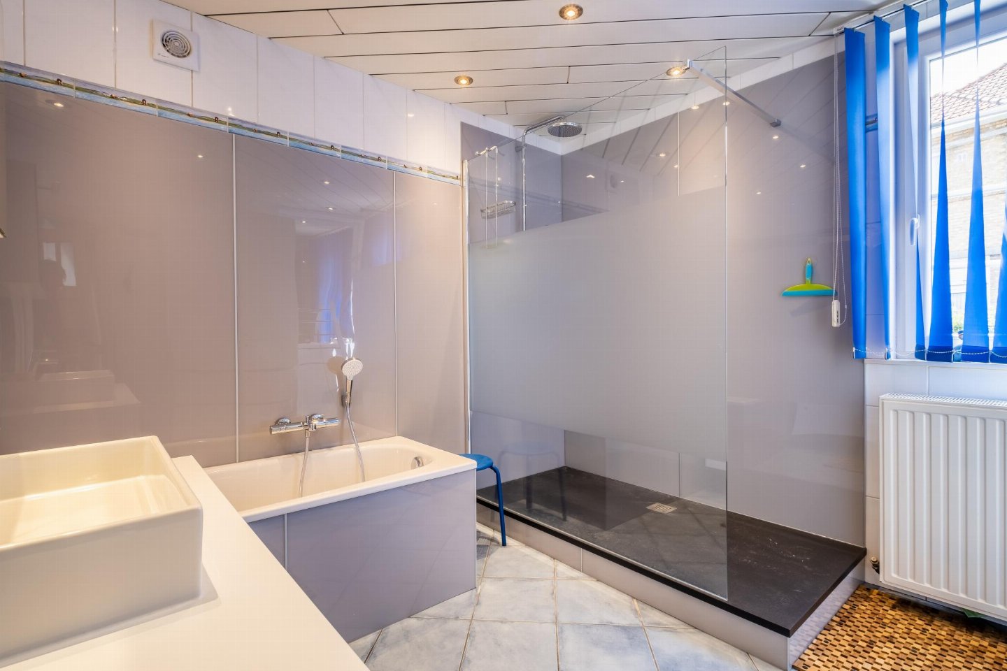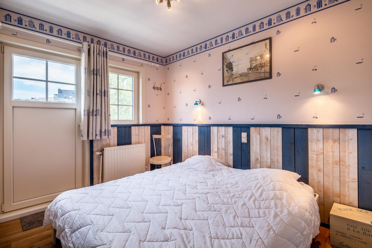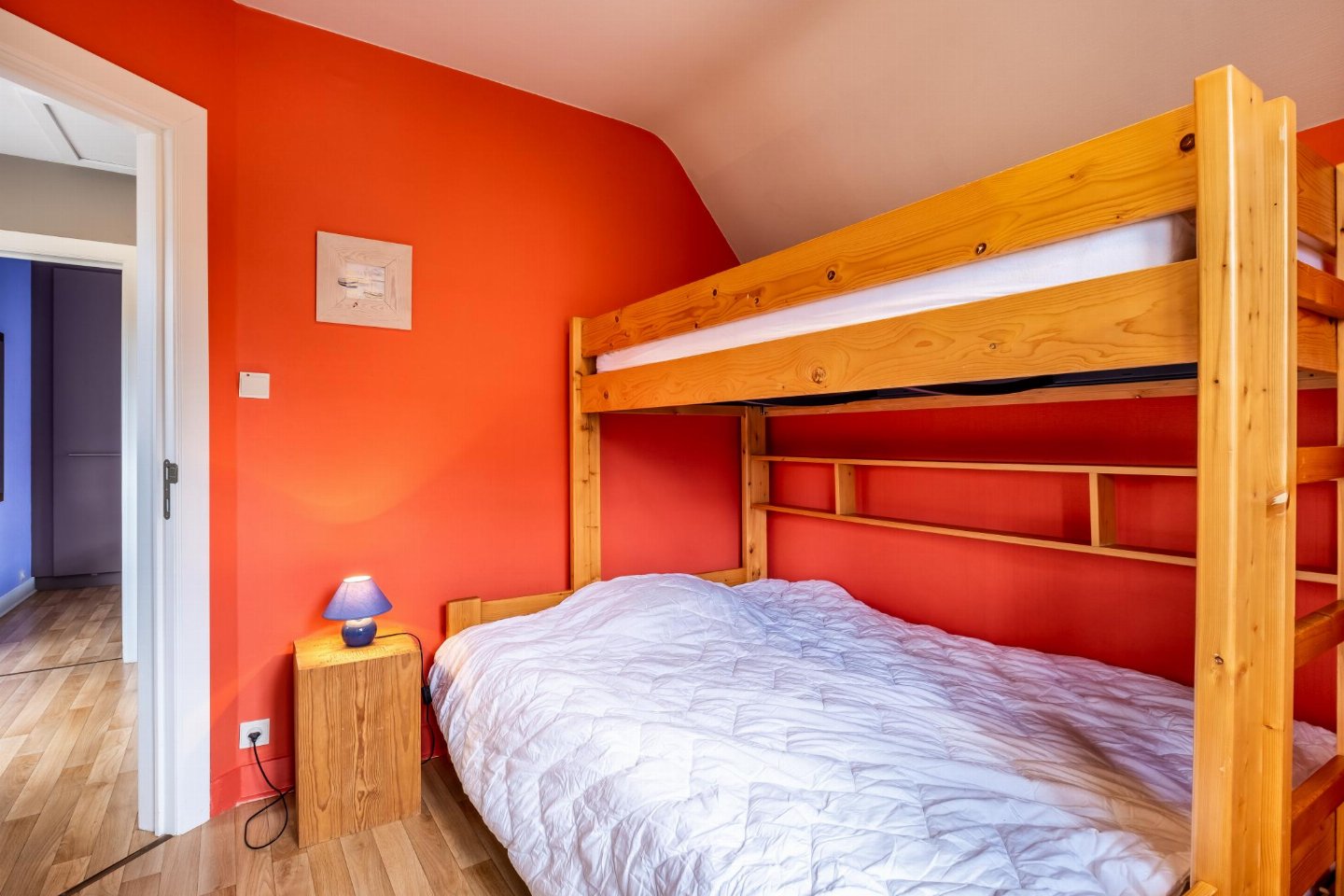 Op de 1e etage: (slaapkamer(2-pers. bed(2 persoons dekbed)), slaapkamer(2x 1-pers. bed(dekbed)), slaapkamer(3-pers. stapelbed(dekbed)), badkamer(douche, wc))