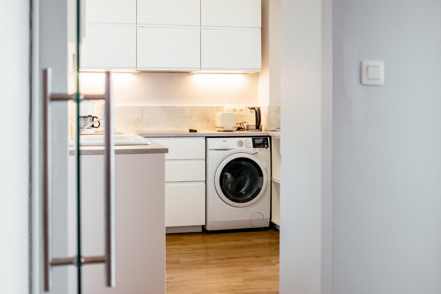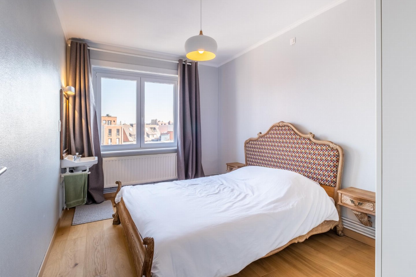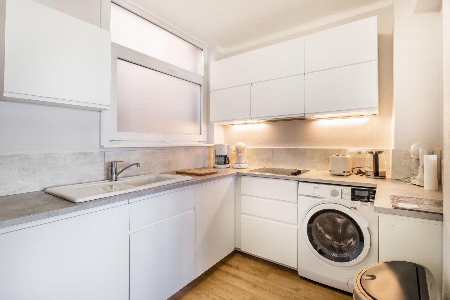 Op de 5e etage: (keuken(kookplaat(keramisch), waterkoker, broodrooster, afzuigkap, koffiezetapparaat(filtermaling, senseo pads), oven, magnetron, afwasmachine, koel-/vriescombinatie, wasmachine, Staafmixer), woon/eetkamer(TV(flatscreen, digital), eettafel, zithoek), slaapkamer(2-pers. bed(2 persoons dekbed)), 2x slaapkamer(2x 1-pers. bed(dekbed)), badkamer(bad met douche, wastafel), toilet(wc), stofzuiger)