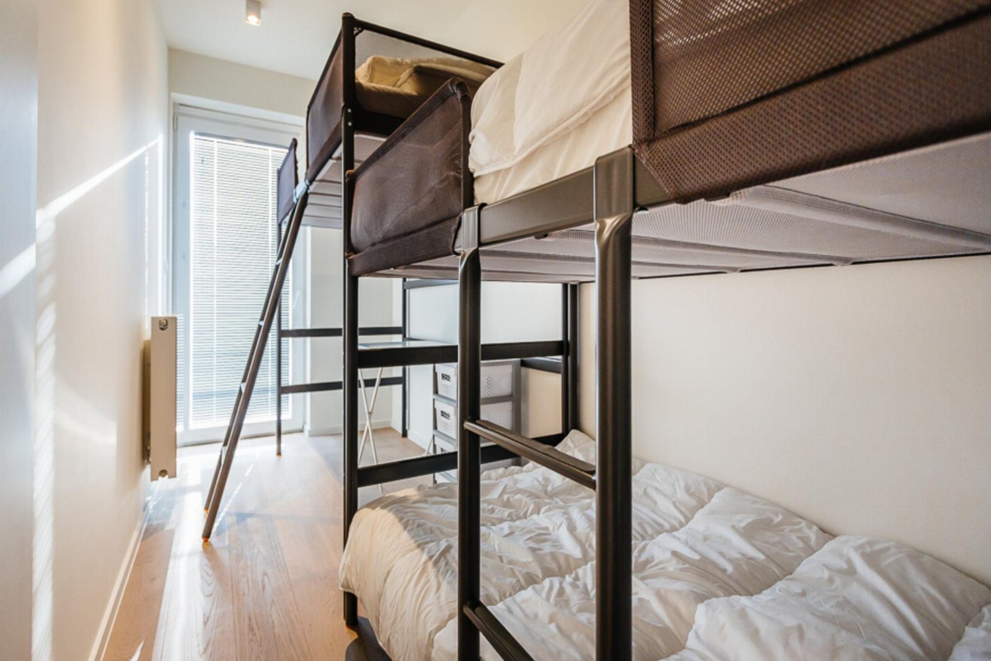 Op de 4e etage: open keuken met kookplaat(keramisch), afzuigkap, koffiezetapparaat(filtermaling), oven, afwasmachine, koelkast( vriesvak), Staafmixer , woon/eetkamer met TV(flatscreen, digital), eettafel, zithoek , slaapkamer met 2-pers. bed(2 persoons dekbed) , slaapkamer met 1-pers. hoogslaper(dekbed), stapelbed(dekbed) , badkamer met douche(inloopdouche), wastafel, haardroger , toilet met wc , stofzuiger, 2x balkon