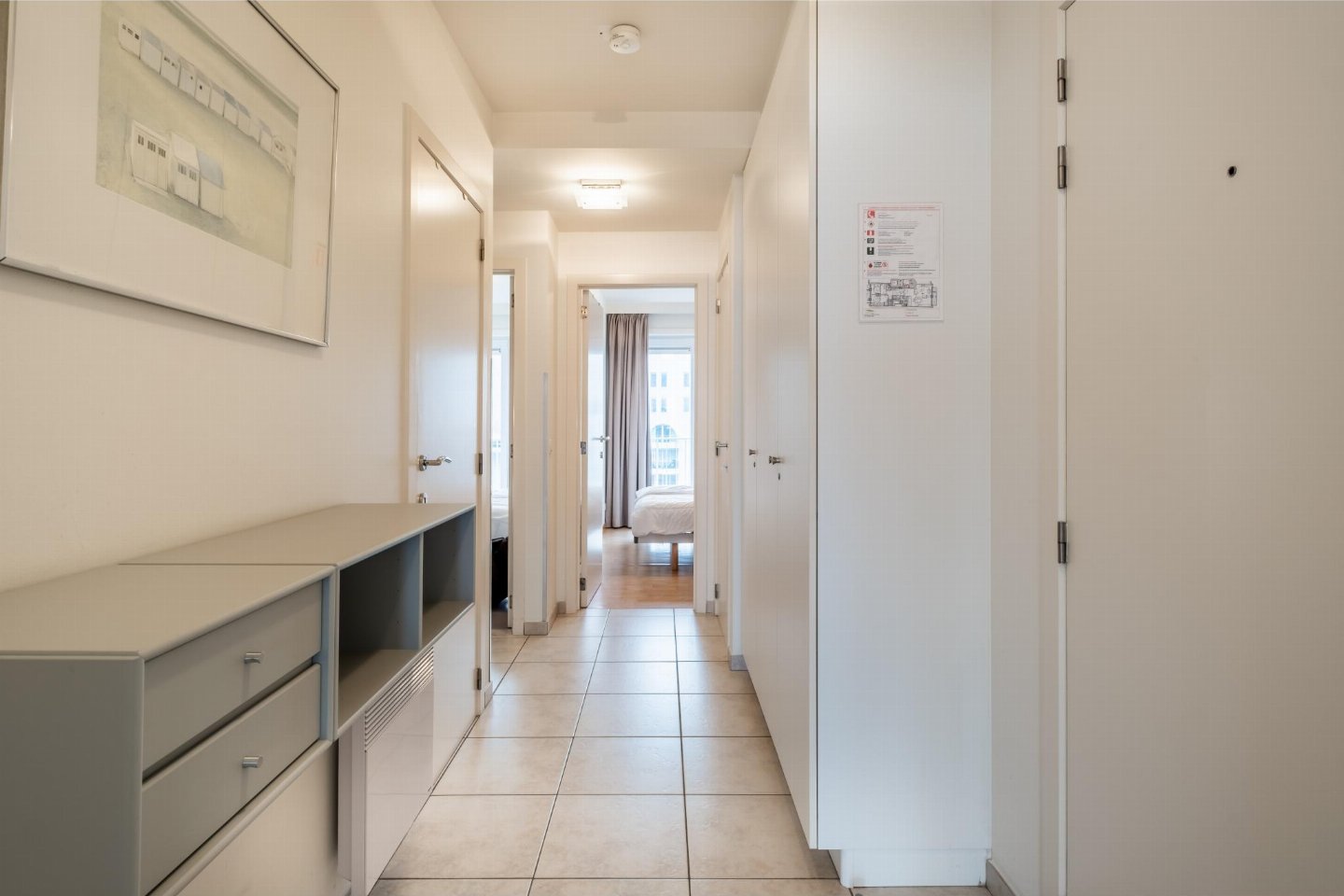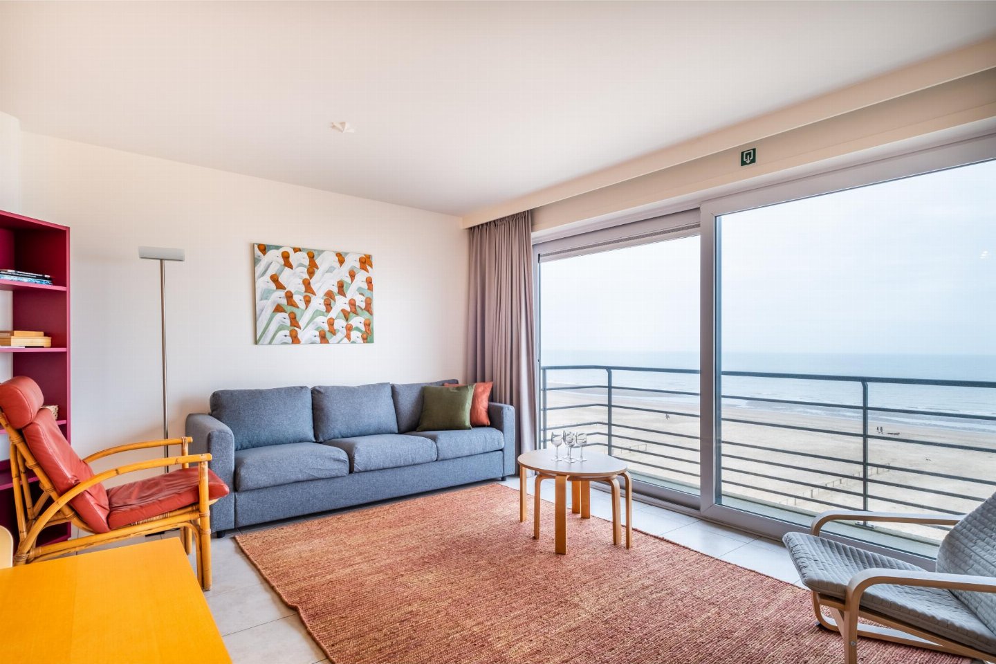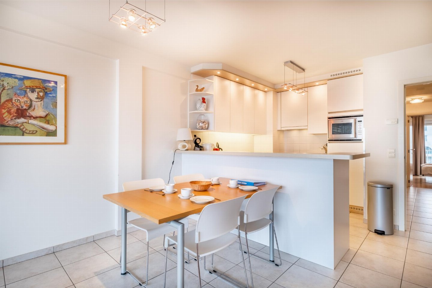 Op de 4e etage: (open keuken(kookplaat(keramisch), waterkoker, broodrooster, afzuigkap, koffiezetapparaat(filtermaling, senseo pads), combimagnetron, afwasmachine, koelkast, Staafmixer), woon/eetkamer(TV(flatscreen, digital), eettafel, zithoek, DVD-speler, radio), slaapkamer(2-pers. bed(2 éénpersoonsbedden, 2 x 1 persoons dekbed)), slaapkamer met badkamer(2-pers. bed(2 éénpersoonsbedden, 2 x 1 persoons dekbed), douche, wastafel), badkamer(bad met douche, wastafel), toilet(wc), stofzuiger, 2x balkon, tuinmeubilair, ligbedden)