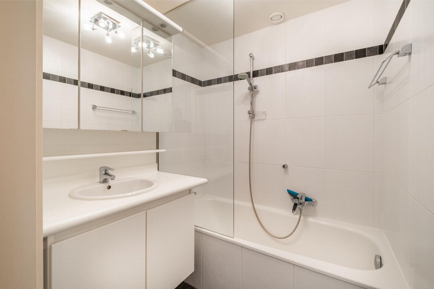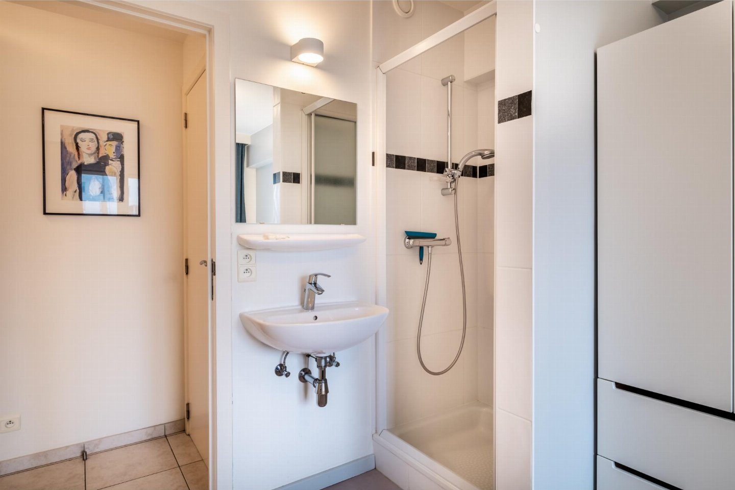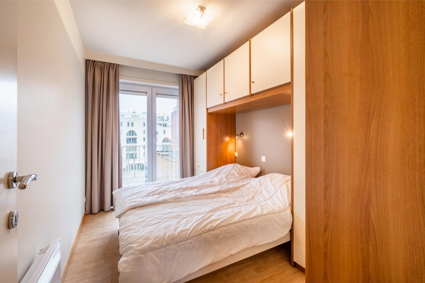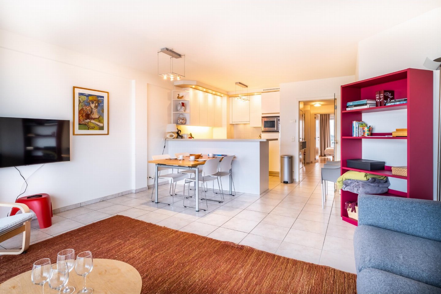 Op de 4e etage: (open keuken(kookplaat(keramisch), waterkoker, broodrooster, afzuigkap, koffiezetapparaat(filtermaling, senseo pads), combimagnetron, afwasmachine, koelkast, Staafmixer), woon/eetkamer(TV(flatscreen, digital), eettafel, zithoek, DVD-speler, radio), slaapkamer(2-pers. bed(2 éénpersoonsbedden, 2 x 1 persoons dekbed)), slaapkamer met badkamer(2-pers. bed(2 éénpersoonsbedden, 2 x 1 persoons dekbed), douche, wastafel), badkamer(bad met douche, wastafel), toilet(wc), stofzuiger, 2x balkon, tuinmeubilair, ligbedden)