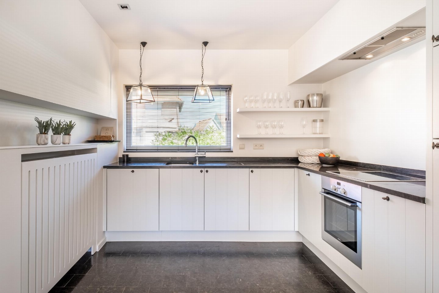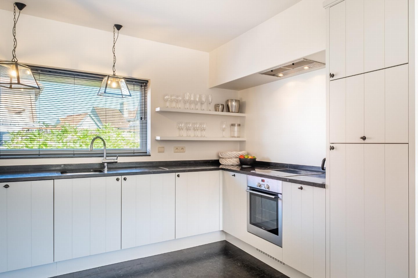Begane grond: (hal, open keuken(kookplaat(keramisch), waterkoker, afzuigkap, koffiezetapparaat(filtermaling), oven, magnetron, afwasmachine, koelkast( vriesvak), vriezer, Staafmixer), woon/eetkamer(TV(flatscreen, digital), eettafel, zithoek), badkamer(douche(Regen), wastafel), toilet(wc), 1x garage(1 parkeerplaats), stofzuiger, 1x parking)