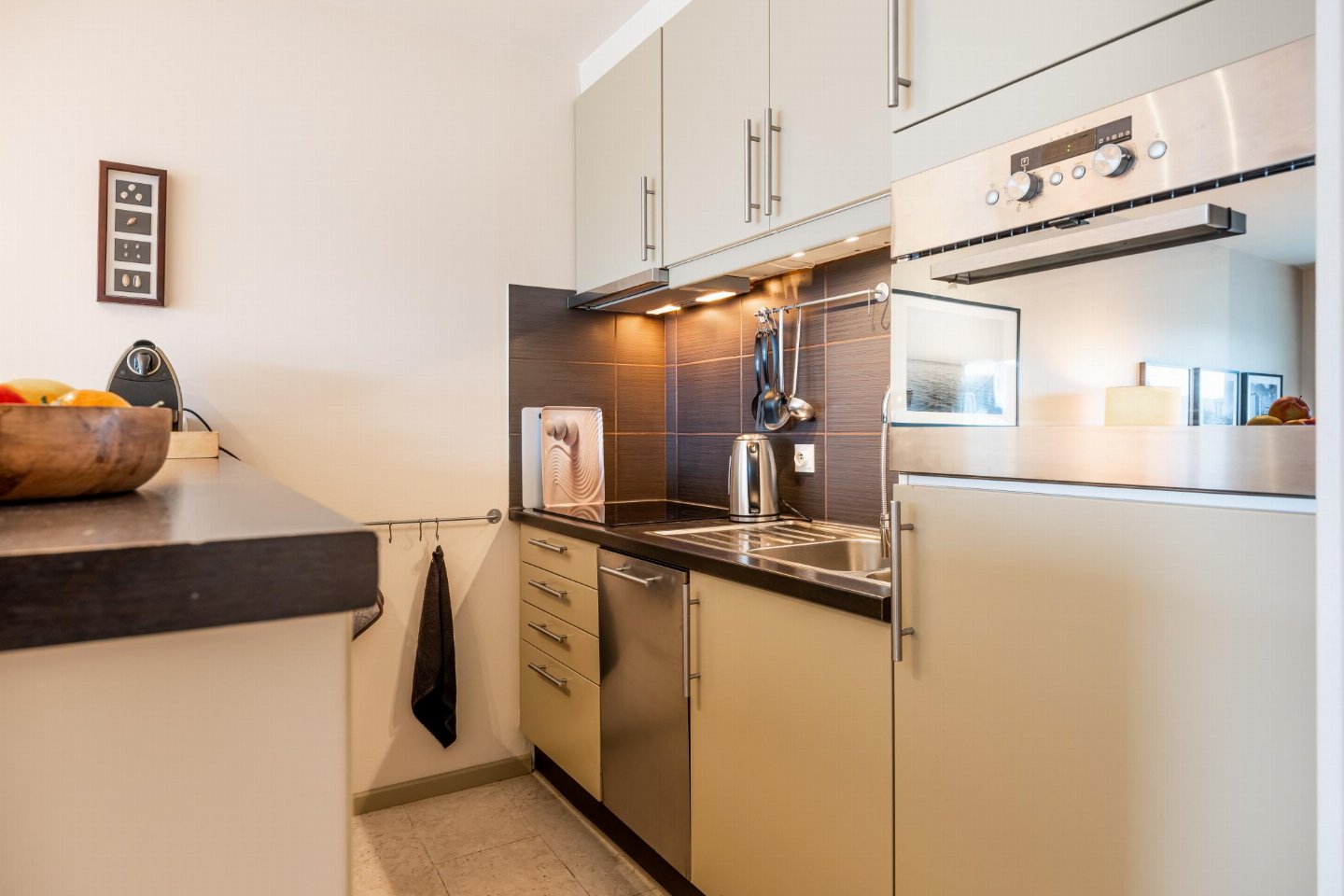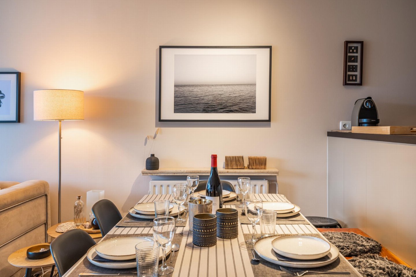 Op de 2e etage: keuken met kookplaat(keramisch), waterkoker, afzuigkap, koffiezetapparaat(filtermaling, nespresso cups), oven, magnetron, afwasmachine, koel-/vriescombinatie , woon/eetkamer met TV(flatscreen, digital), eettafel, zithoek , slaapkamer met 2-pers. bed(2 éénpersoonsbedden, 2 x 1 persoons dekbed) , slaapkamer met 3-pers. stapelbed(dekbed) , badkamer met bad met douche, wastafel, wc, haardroger , stofzuiger, balkon