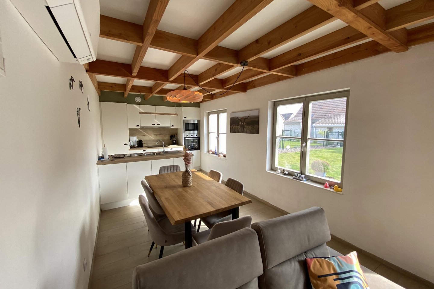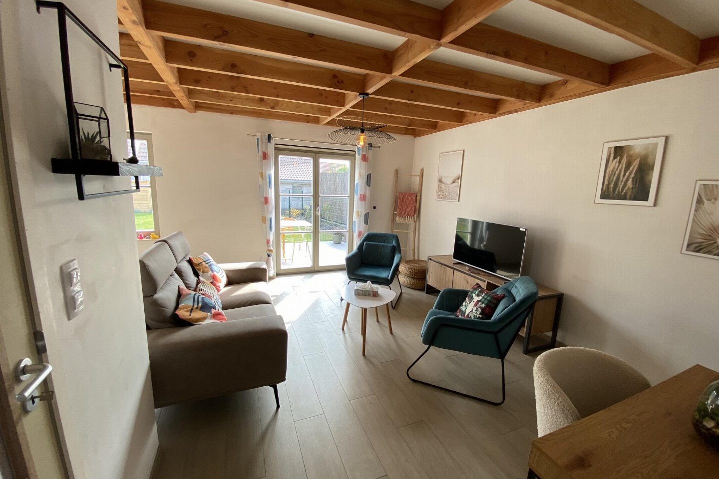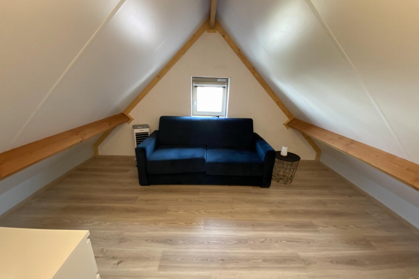 Begane grond: (open keuken(kookplaat, koffiezetapparaat(filtermaling, nespresso cups), oven, magnetron, afwasmachine, koelkast( vriesvak)), woon/eetkamer(TV(flatscreen, digital, smart TV), eettafel, zithoek), slaapkamer(2-pers. bed(2 persoons dekbed, 160 x 200 cm)), badkamer(douche(inloopdouche), wastafel, haardroger), toilet(wc), berging(1x kinderbed (excl. beddengoed), 1x kinderstoel), airconditioning, BBQ(houtskool))
