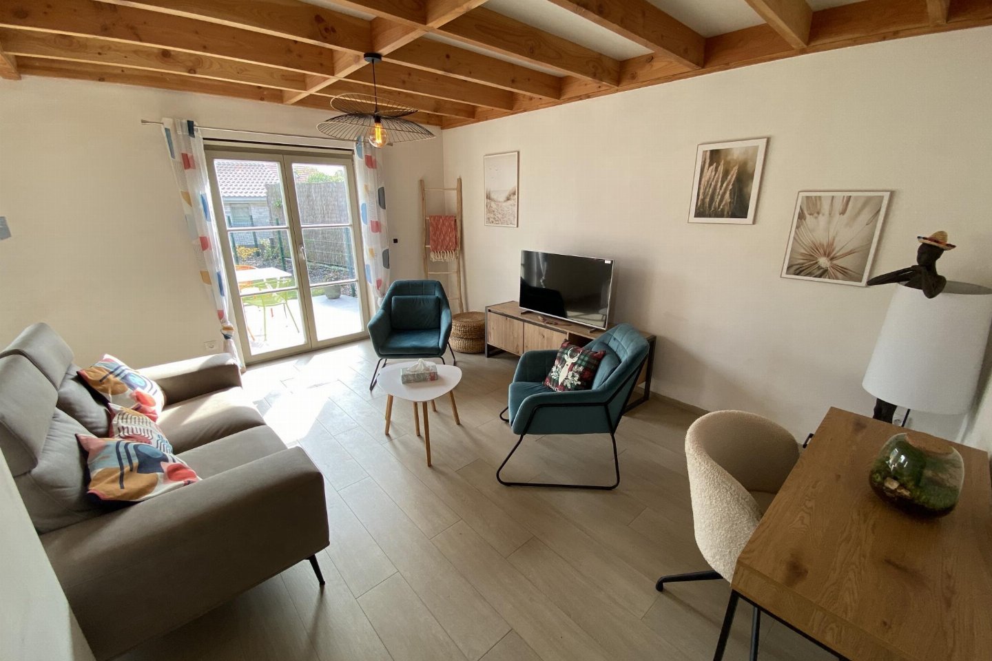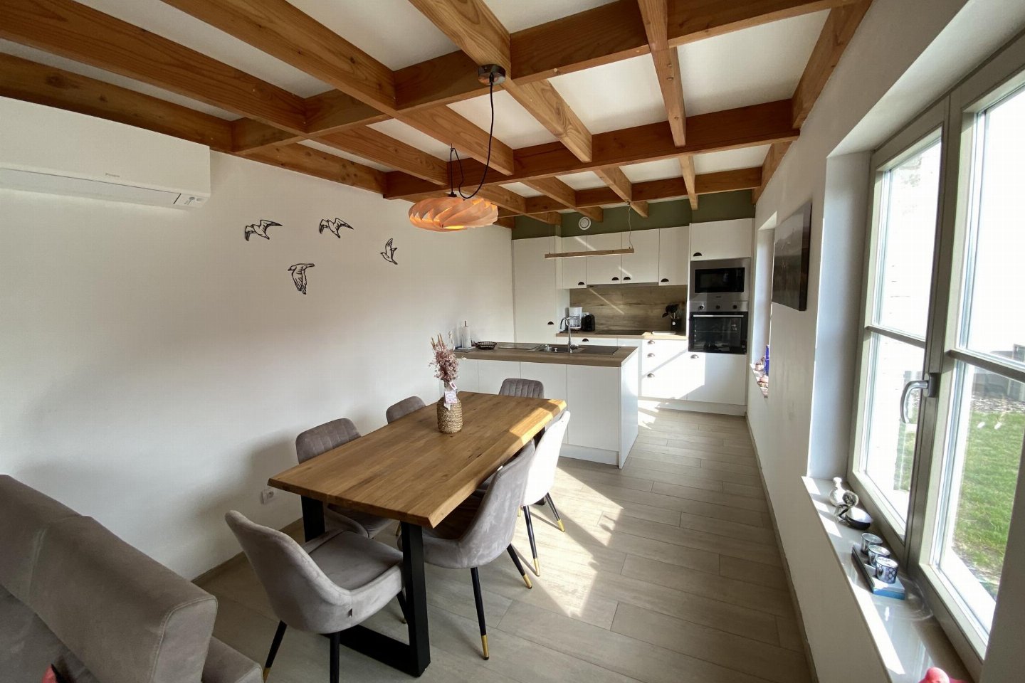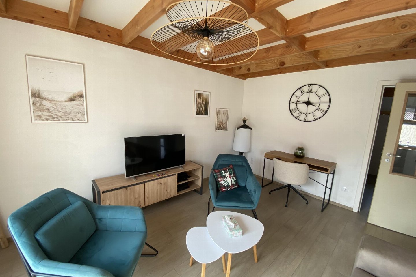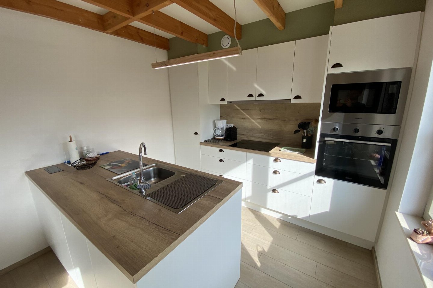 Begane grond: (open keuken(kookplaat, koffiezetapparaat(filtermaling, nespresso cups), oven, magnetron, afwasmachine, koelkast( vriesvak)), woon/eetkamer(TV(flatscreen, digital, smart TV), eettafel, zithoek), slaapkamer(2-pers. bed(2 persoons dekbed, 160 x 200 cm)), badkamer(douche(inloopdouche), wastafel, haardroger), toilet(wc), berging(1x kinderbed (excl. beddengoed), 1x kinderstoel), airconditioning, BBQ(houtskool))