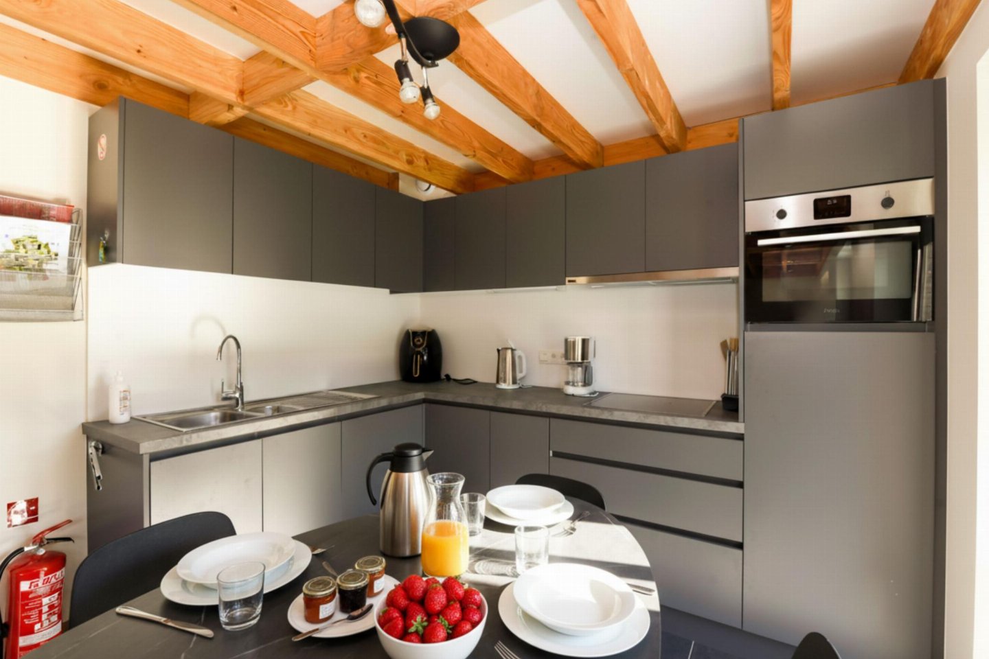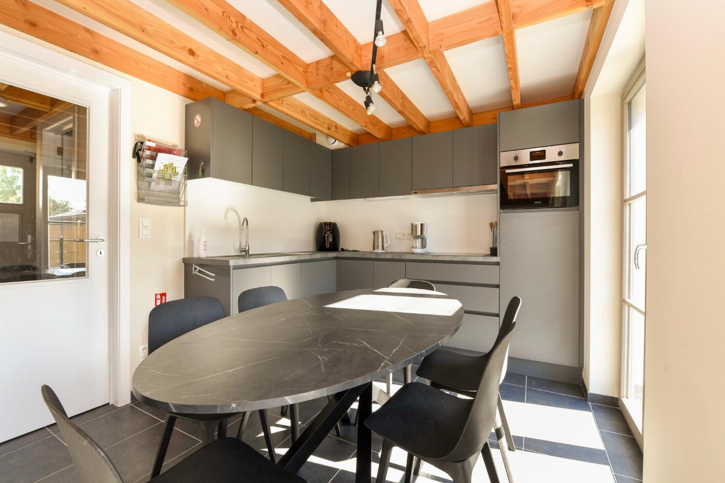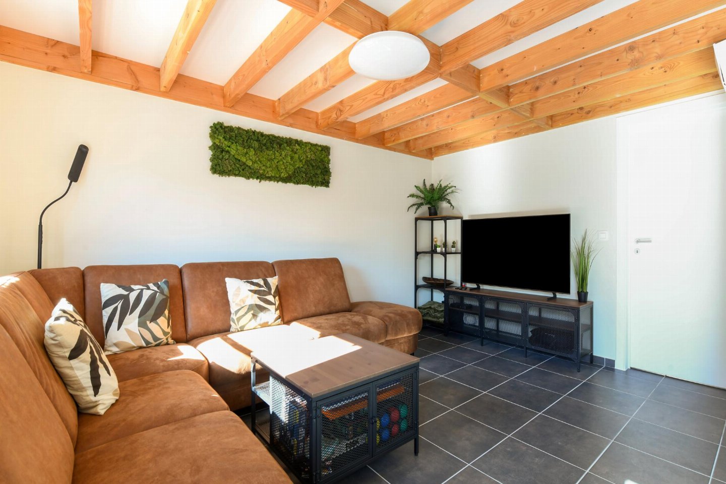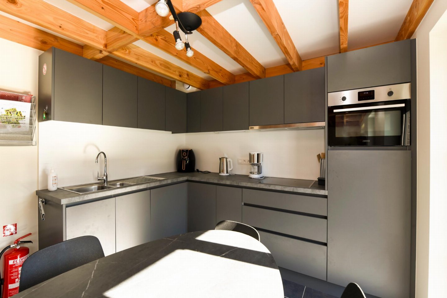 Begane grond: (open keuken(kookplaat, waterkoker, koffiezetapparaat(filtermaling, senseo pads), oven, magnetron, afwasmachine, koelkast( vriesvak)), woon/eetkamer(TV(flatscreen, digital, smart TV), eettafel, zithoek), slaapkamer(2-pers. bed(2 persoons dekbed, 180 x 200 cm)), badkamer(douche(inloopdouche), wastafel), toilet(wc), berging(1x kinderstoel), airconditioning)