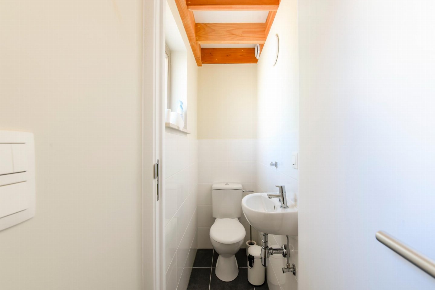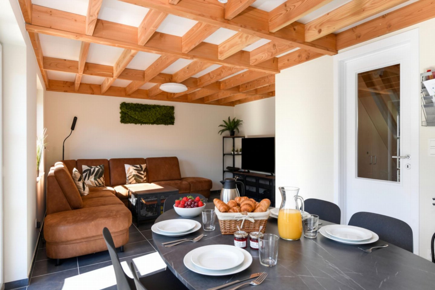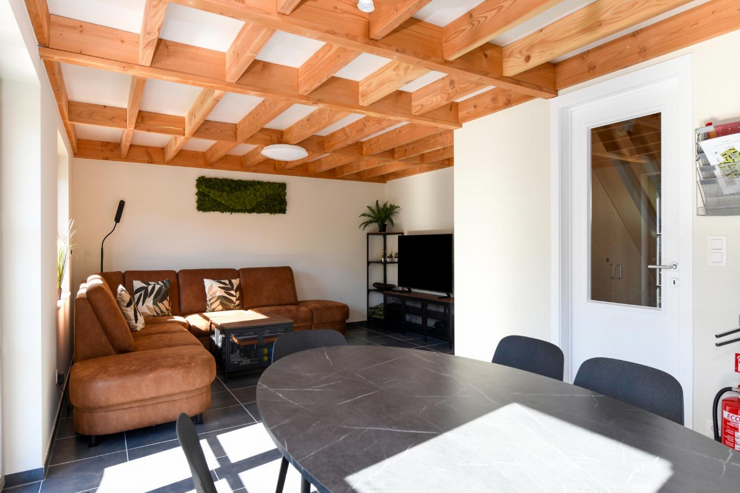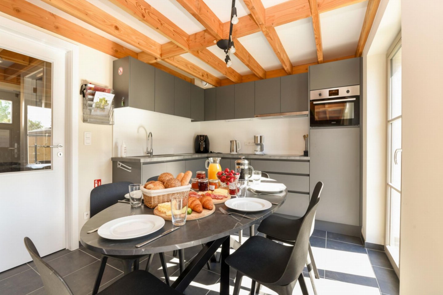 Begane grond: (open keuken(kookplaat, waterkoker, koffiezetapparaat(filtermaling, senseo pads), oven, magnetron, afwasmachine, koelkast( vriesvak)), woon/eetkamer(TV(flatscreen, digital, smart TV), eettafel, zithoek), slaapkamer(2-pers. bed(2 persoons dekbed, 180 x 200 cm)), badkamer(douche(inloopdouche), wastafel), toilet(wc), berging(1x kinderstoel), airconditioning)