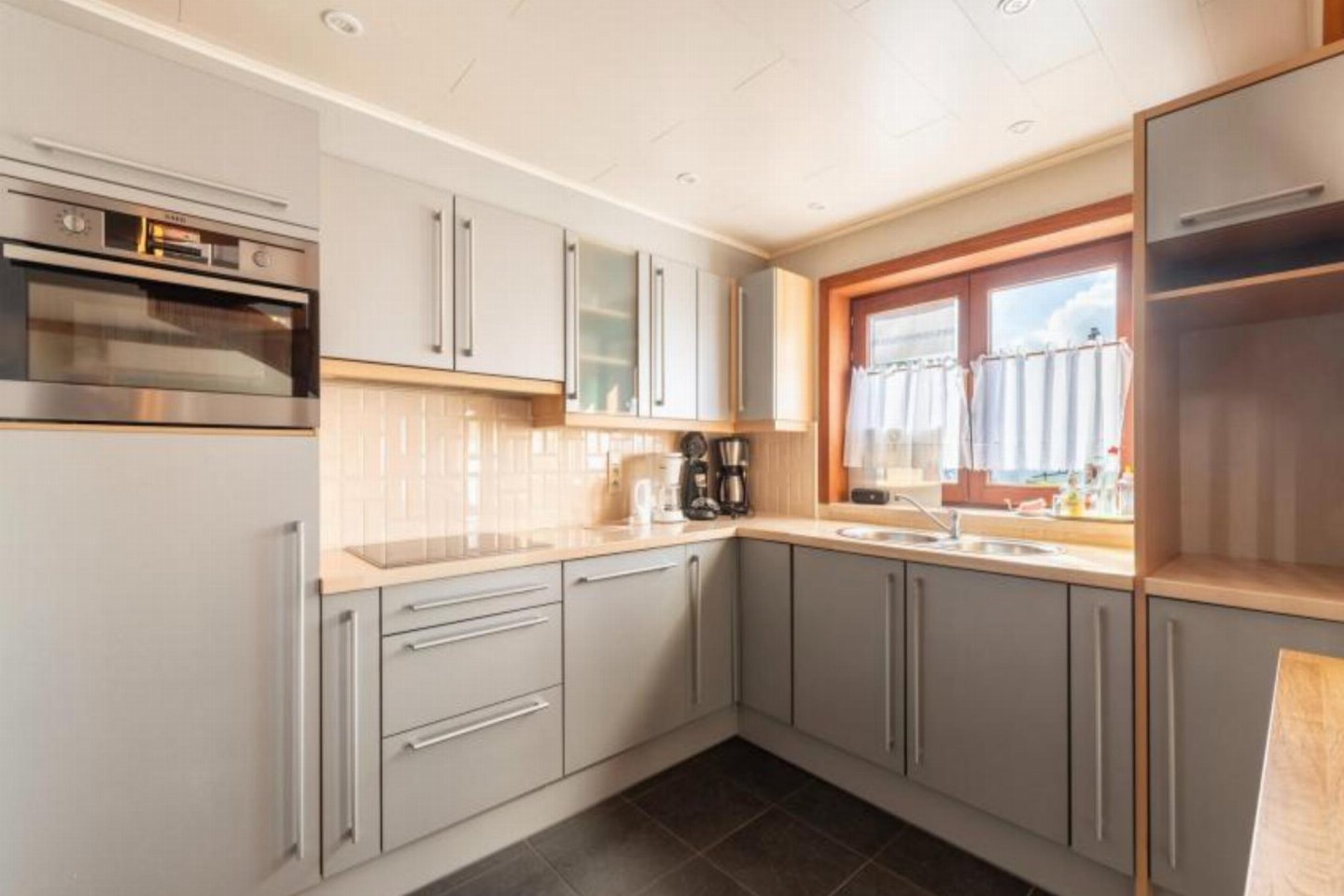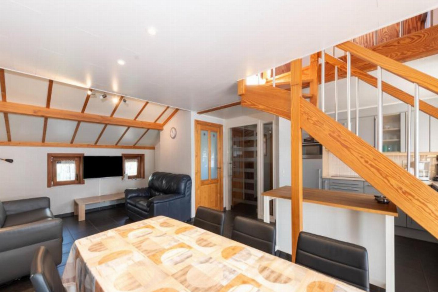 Begane grond: (open keuken(kookplaat, waterkoker, afzuigkap, koffiezetapparaat(senseo pads), oven, magnetron, koelkast( vriesvak)), woon/eetkamer(TV(flatscreen, digital), eettafel, zithoek), slaapkamer(2-pers. bed(2 persoons dekbed, 160 x 200 cm)), badkamer(massagedouche, wastafel), toilet(wc))