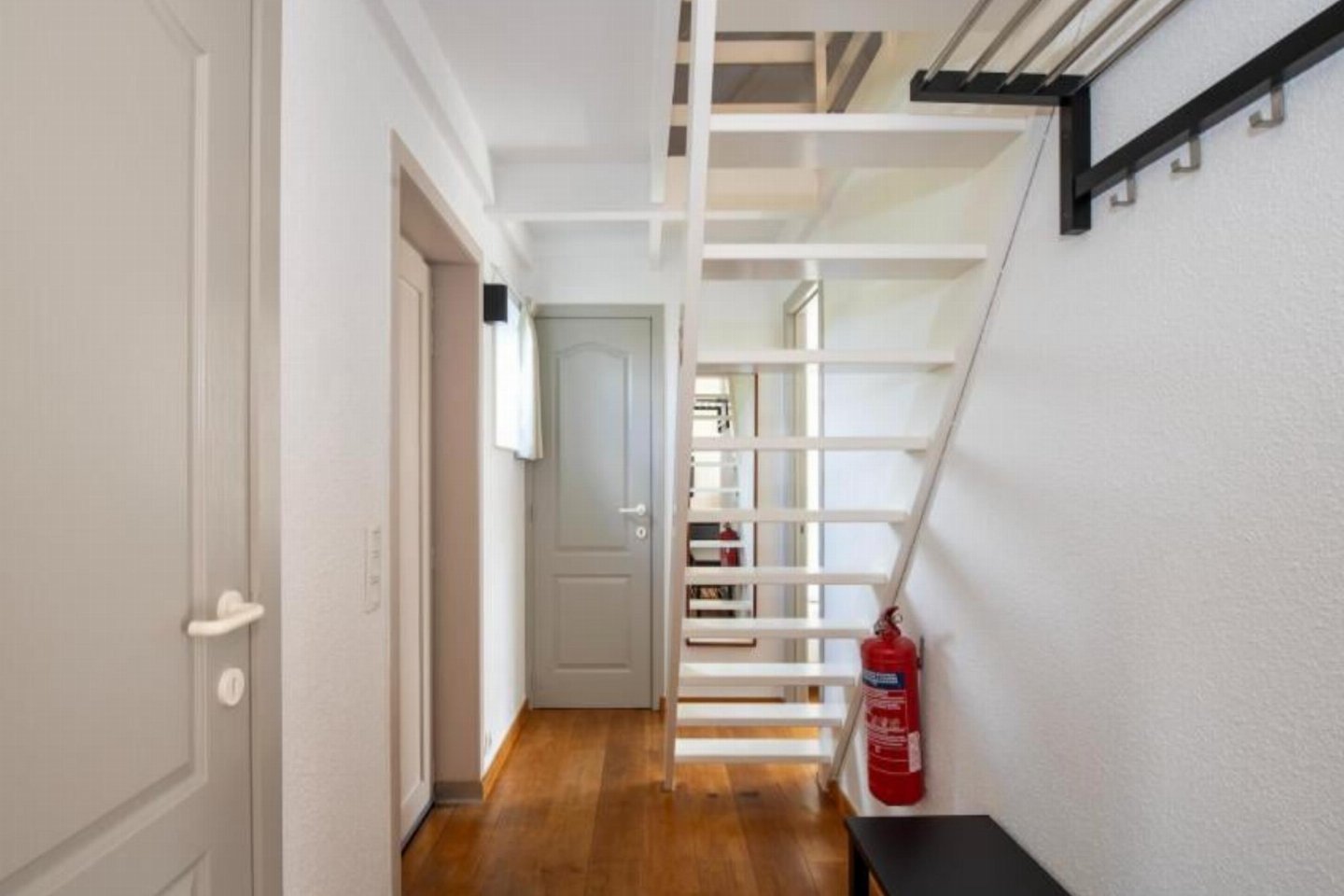 Op de 1e etage(via steile trap): (slaapkamer(2x 1-pers. bed(dekbed, 90 x 200 cm)))