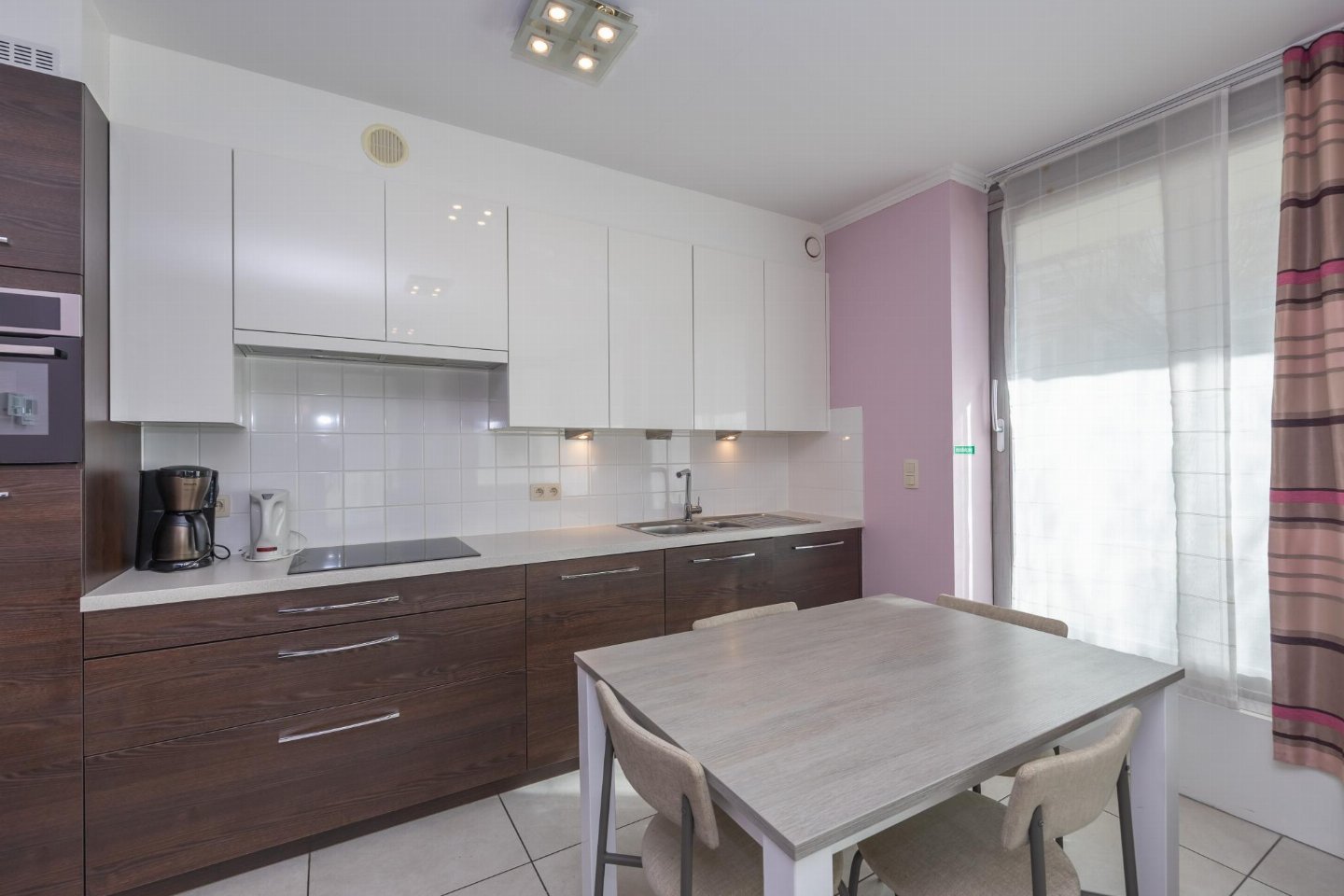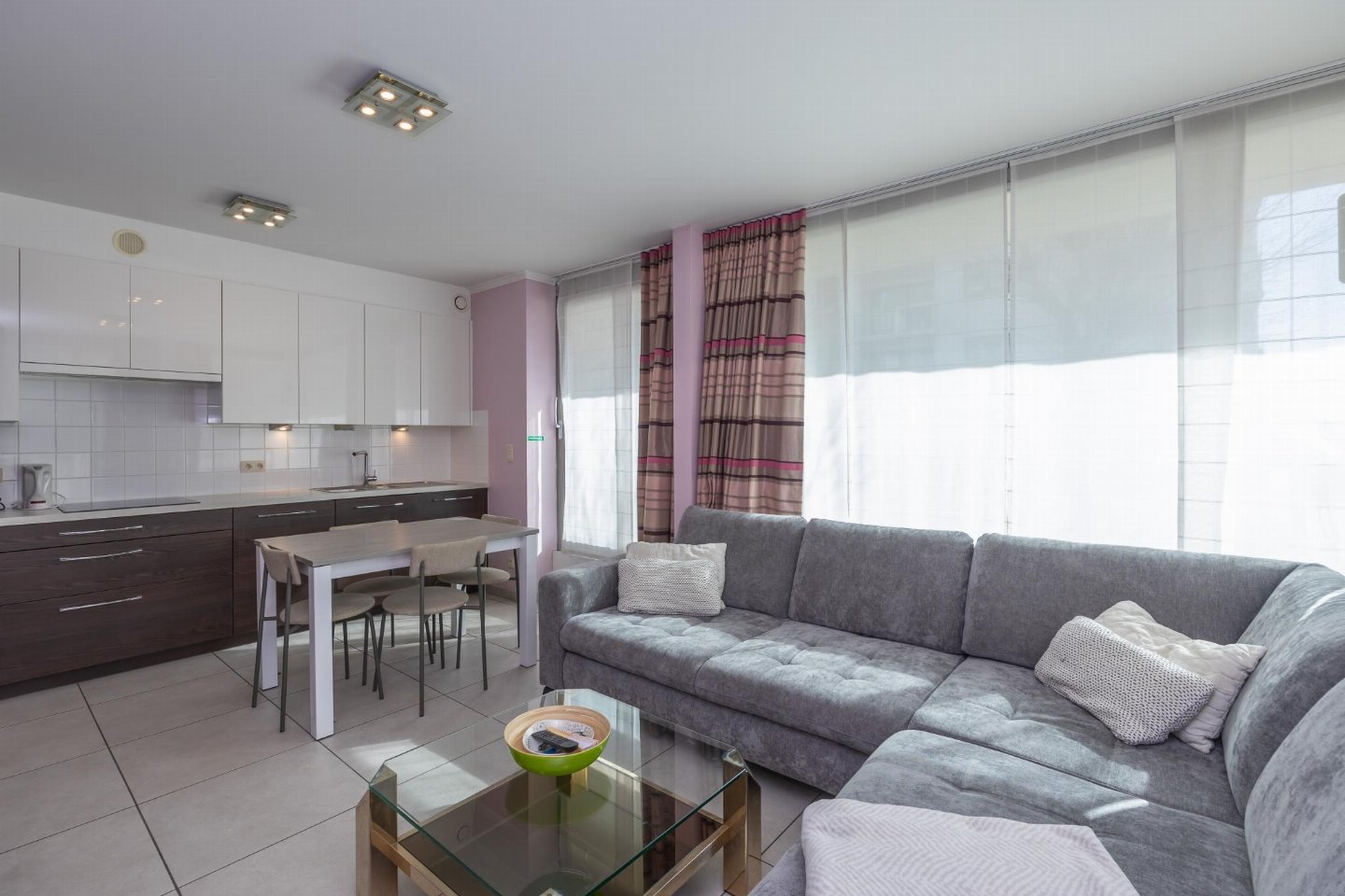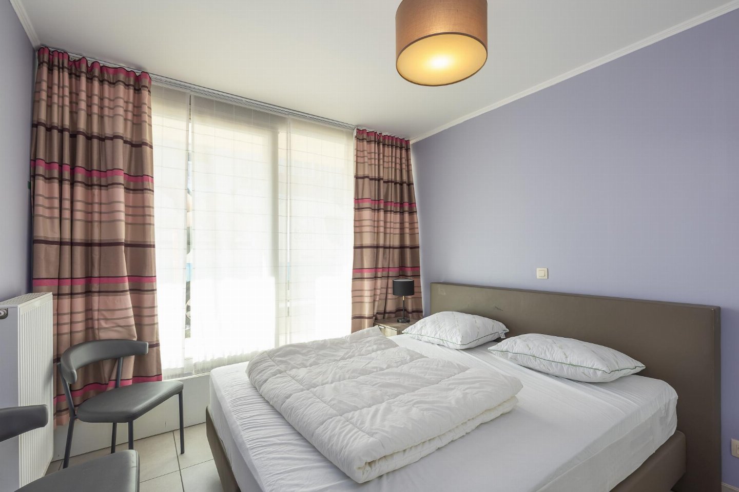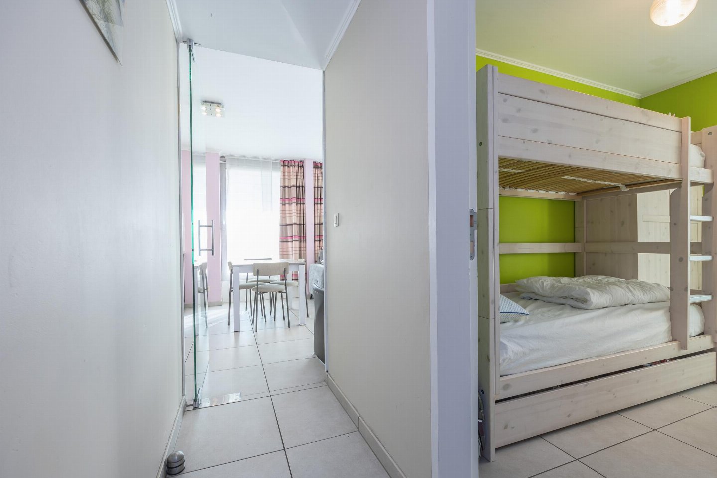 Hoekappartement op het gelijkvloers, ideaal voor een zorgeloos verblijf en geschikt voor minder mobiele personen. 2 slaapkamers: één met dubbel bed en één met stapelbed. Gezellige woonkamer met zetelbed voor 2 personen. Veel licht dankzij grote ramen. Open, volledig ingerichte keuken. Badkamer met inloopdouche en apart toilet. Centrale ligging nabij Casinoplein, Zeedijk, winkels en tram.