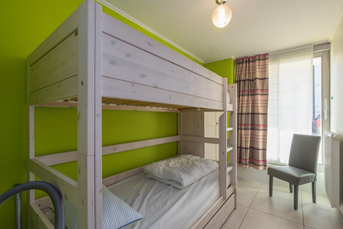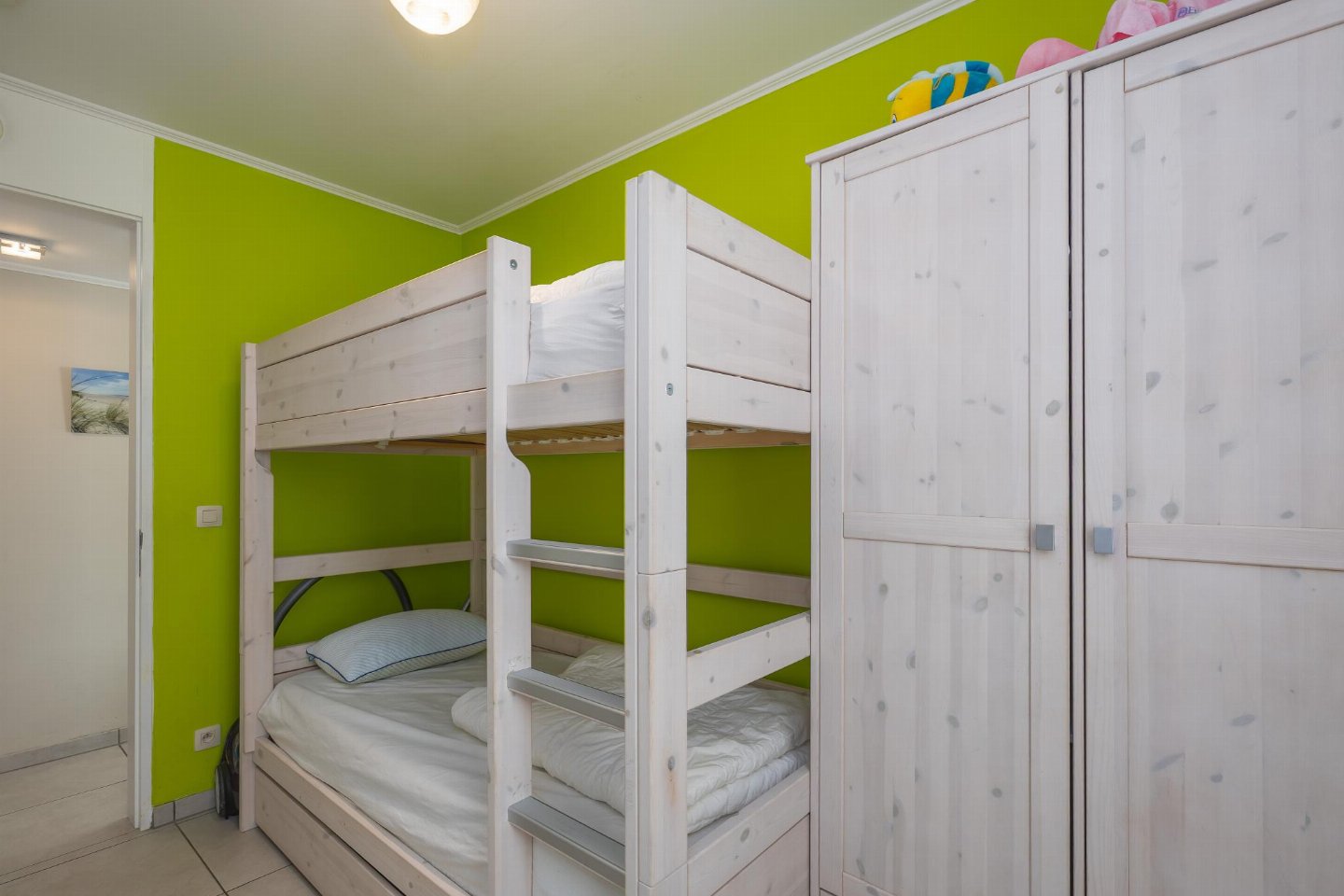 Hoekappartement op het gelijkvloers, ideaal voor een zorgeloos verblijf en geschikt voor minder mobiele personen. 2 slaapkamers: één met dubbel bed en één met stapelbed. Gezellige woonkamer met zetelbed voor 2 personen. Badkamer met inloopdouche en apart toilet.