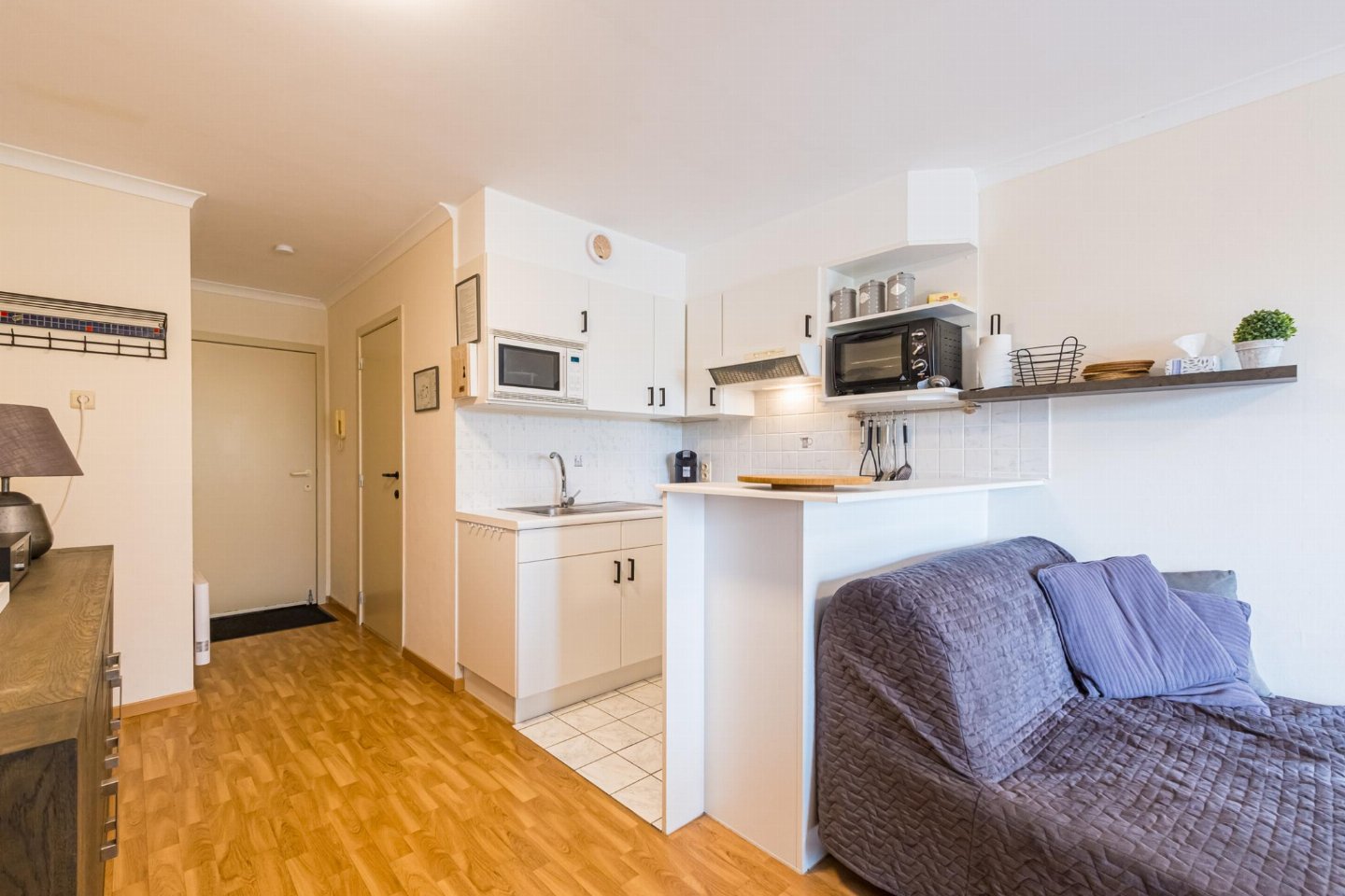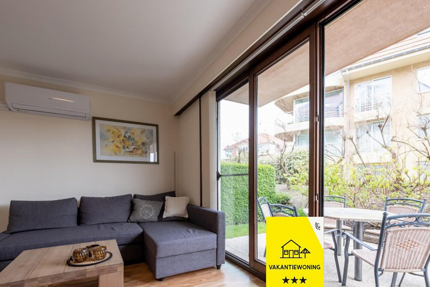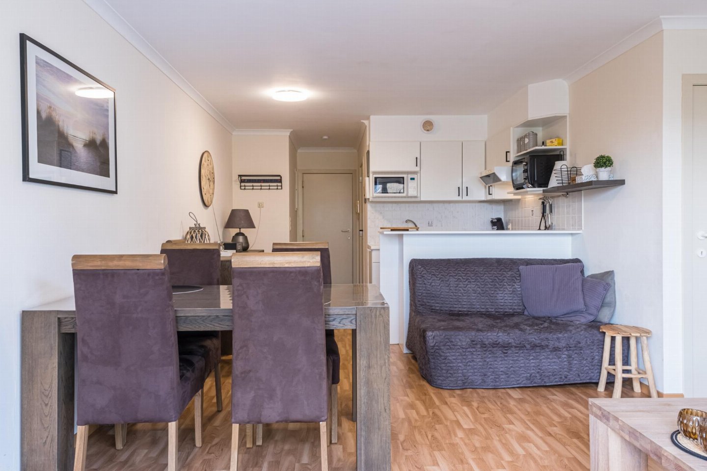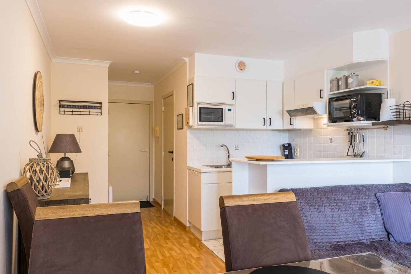 Charmant gelijkvloers appartement met 1 slaapkamer (dubbel bed) en woonkamer met zetelbed voor 2. Open, volledig ingerichte keuken en volledig vernieuwde badkamer met toilet. Ruim terras om te ontbijten of van de zon te genieten.