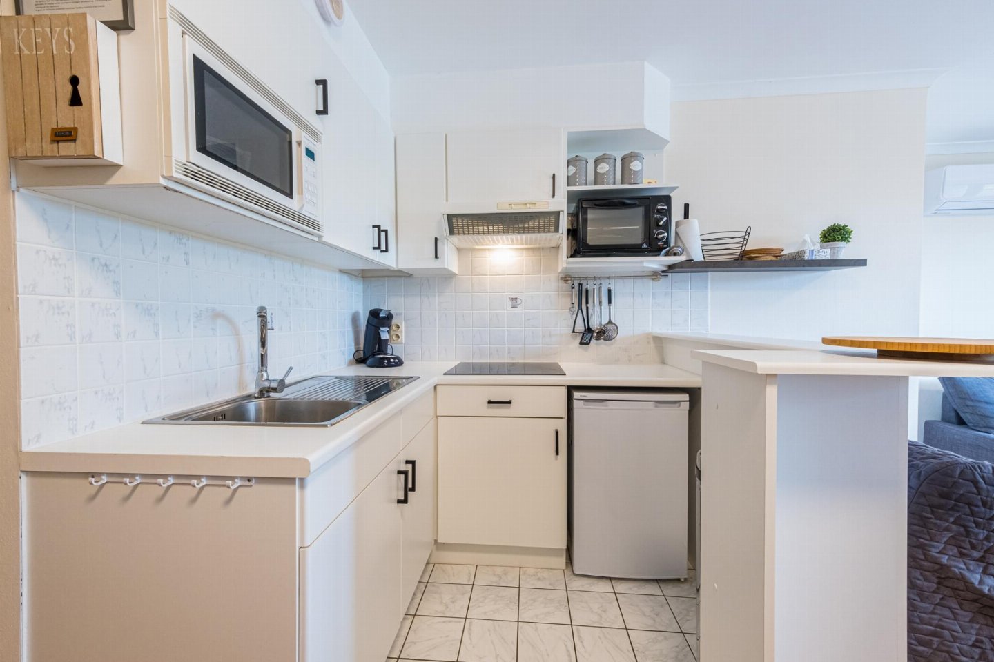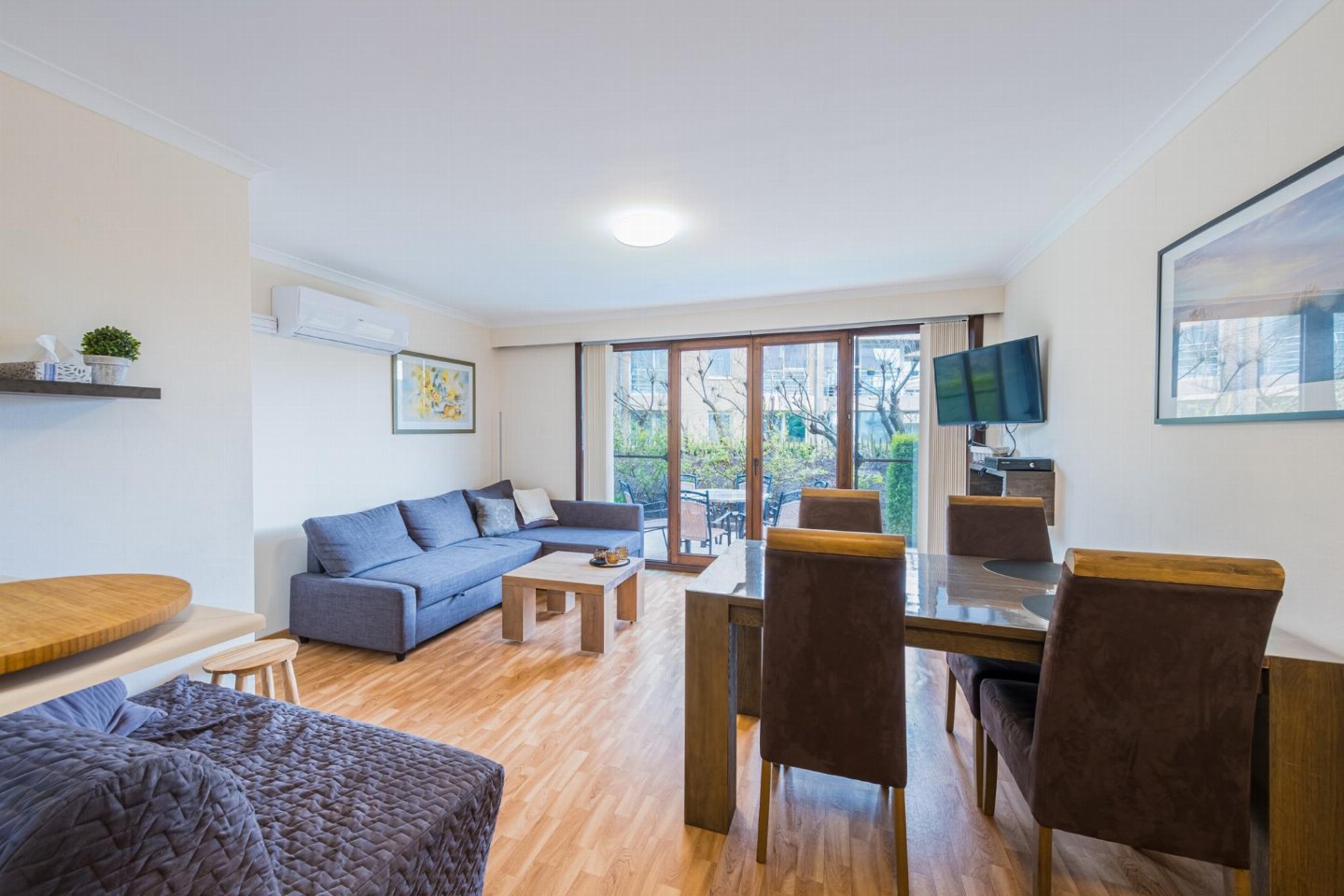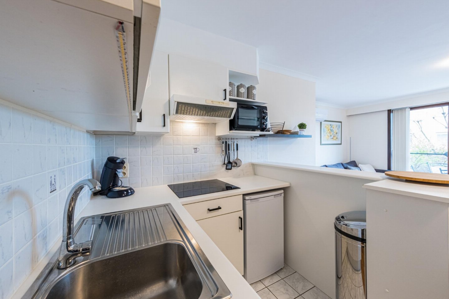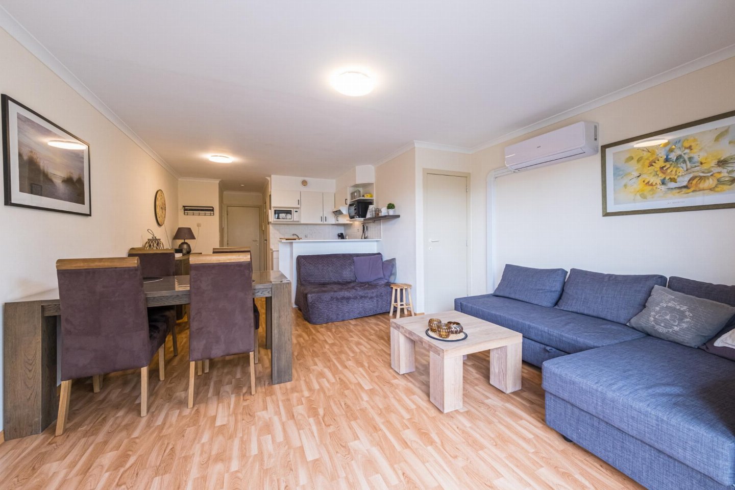 Charmant gelijkvloers appartement met 1 slaapkamer (dubbel bed) en woonkamer met zetelbed voor 2. Open, volledig ingerichte keuken en volledig vernieuwde badkamer met toilet. Ruim terras om te ontbijten of van de zon te genieten.
