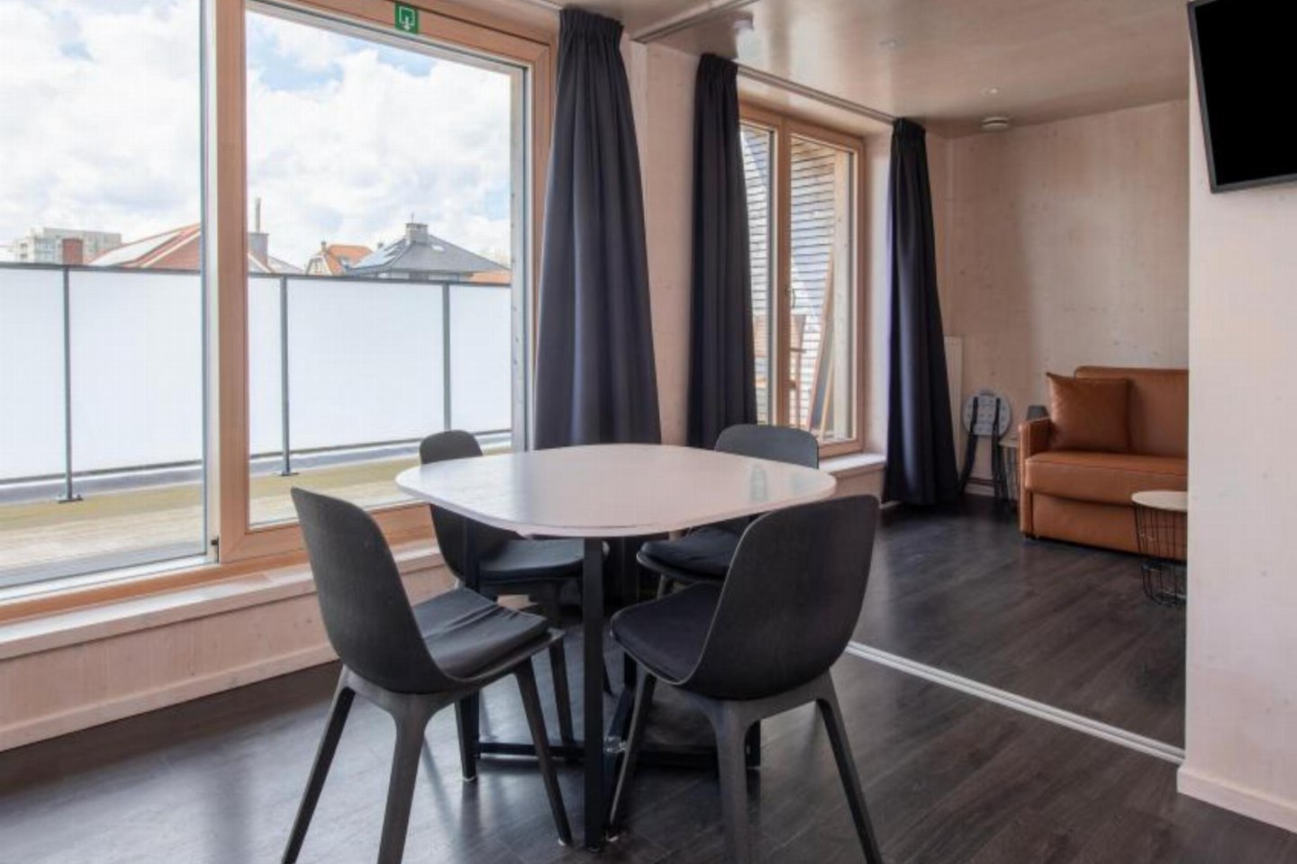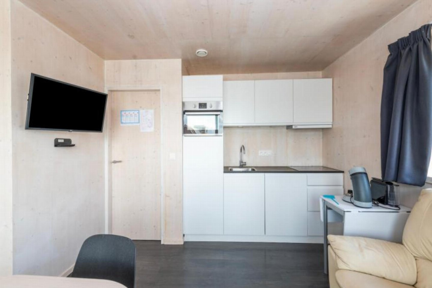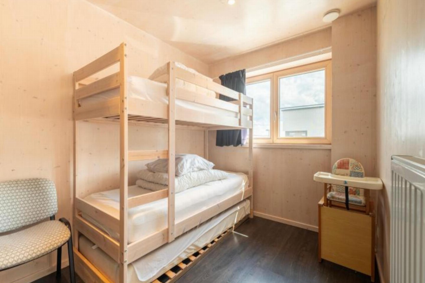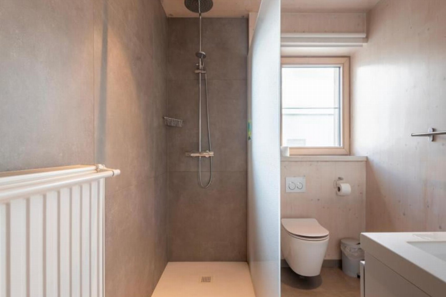 Op de 1e etage: (open keuken(kookplaat, waterkoker, afzuigkap, koffiezetapparaat(senseo pads), magnetron, afwasmachine), woon/eetkamer(TV(flatscreen, digital), eettafel, zithoek), slaapkamer(1-pers. onderschuifbed(dekbed, 90 x 200 cm), stapelbed(dekbed, 90 x 200 cm)), slaapcabine(2-pers. slaapbank(2 persoons dekbed, 160 x 200 cm)), badkamer(douche(inloopdouche), wastafel, wc, haardroger), balkon of terras, 1x kinderbed (excl. beddengoed), 1x kinderstoel)