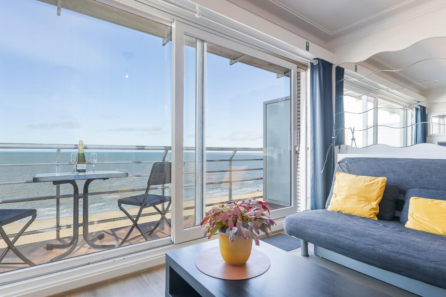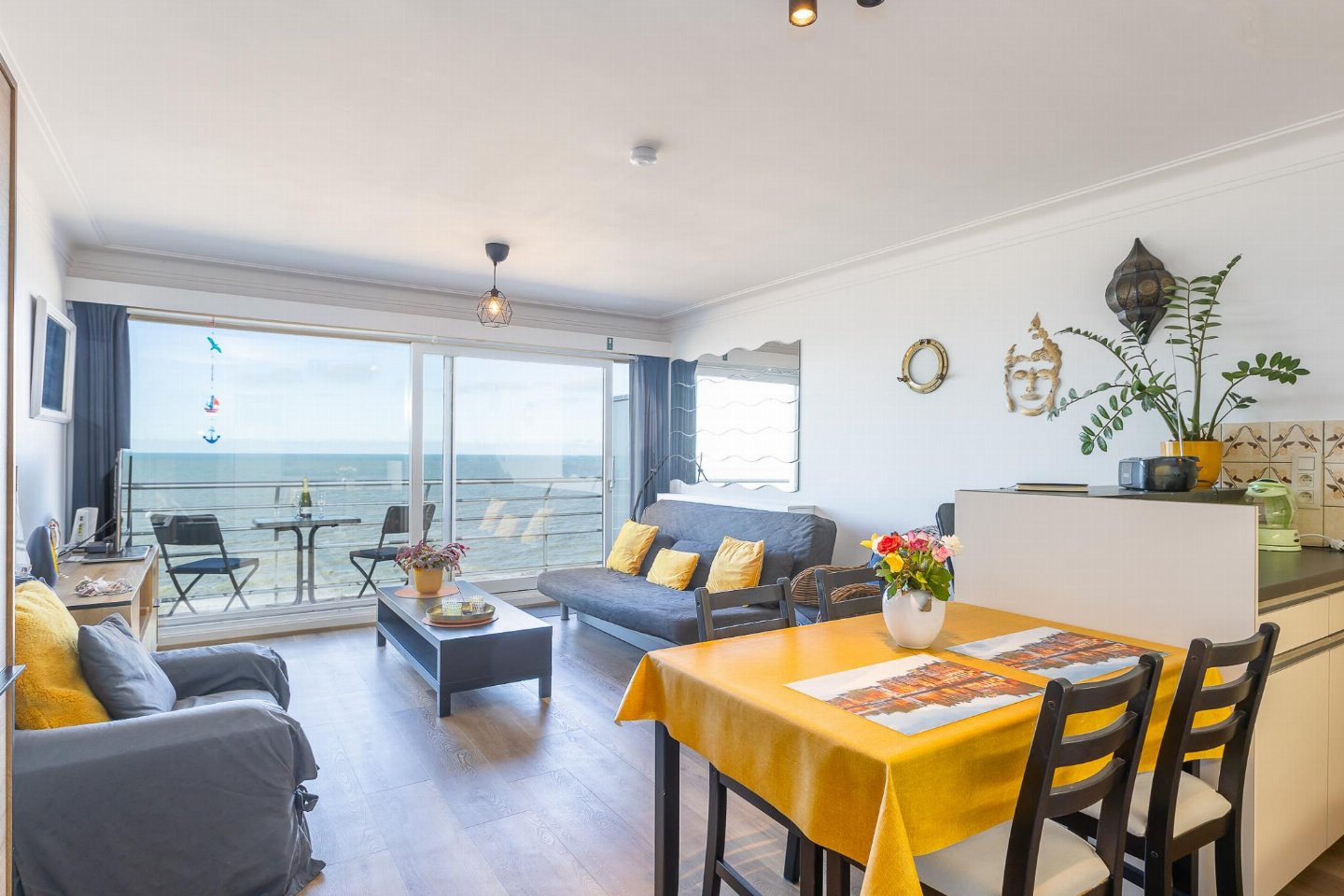 Modern appartement op de 6de verdieping, ideaal voor koppels of kleine gezinnen. 1 slaapkamer met tweepersoonsbed en woonkamer met zetelbed voor 2. Kamerhoge ramen geven uit op terras met schitterend zeezicht. Open, volledig ingerichte keuken. Vernieuwde badkamer met inloopdouche en toilet. Perfect voor een comfortabel verblijf aan zee.