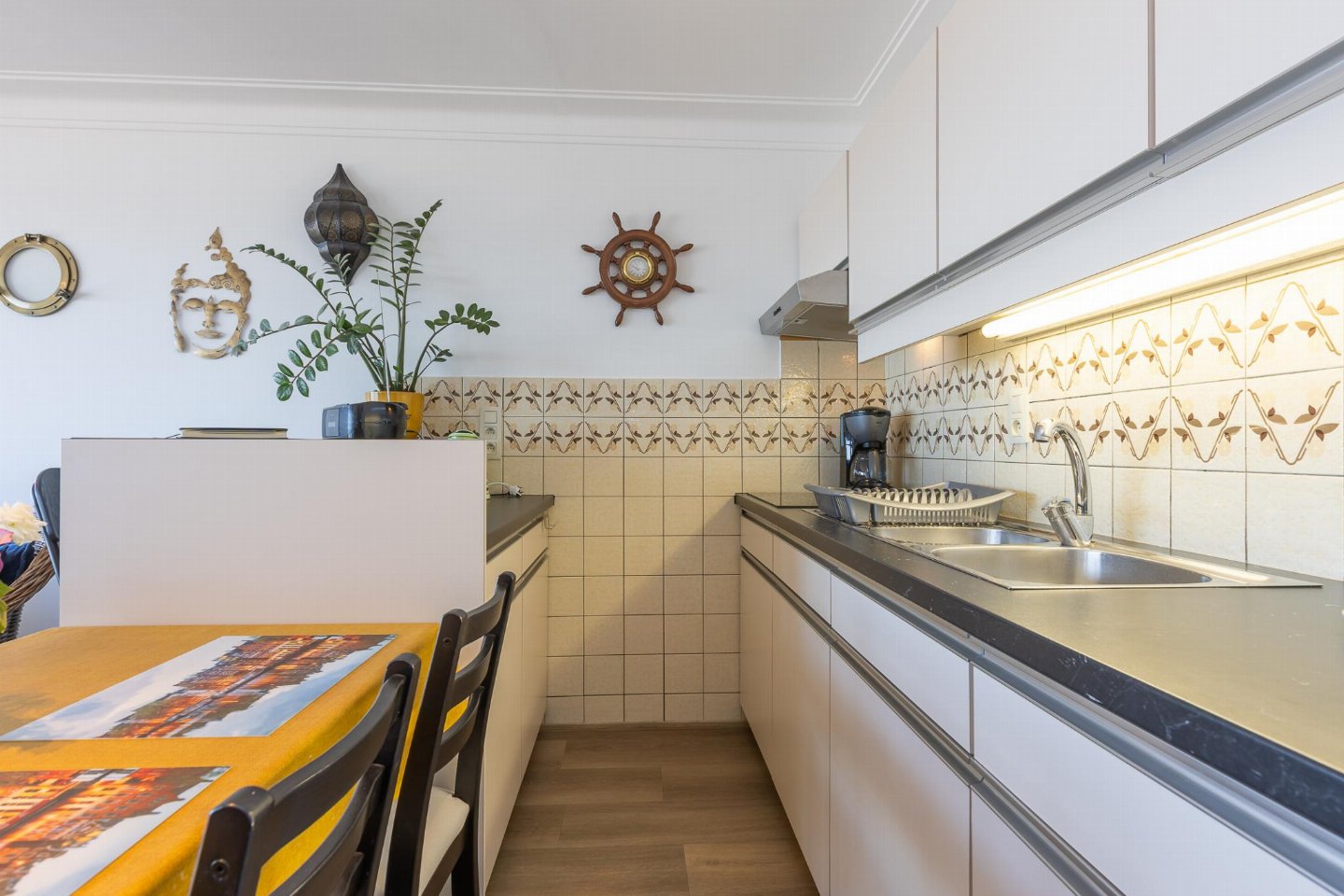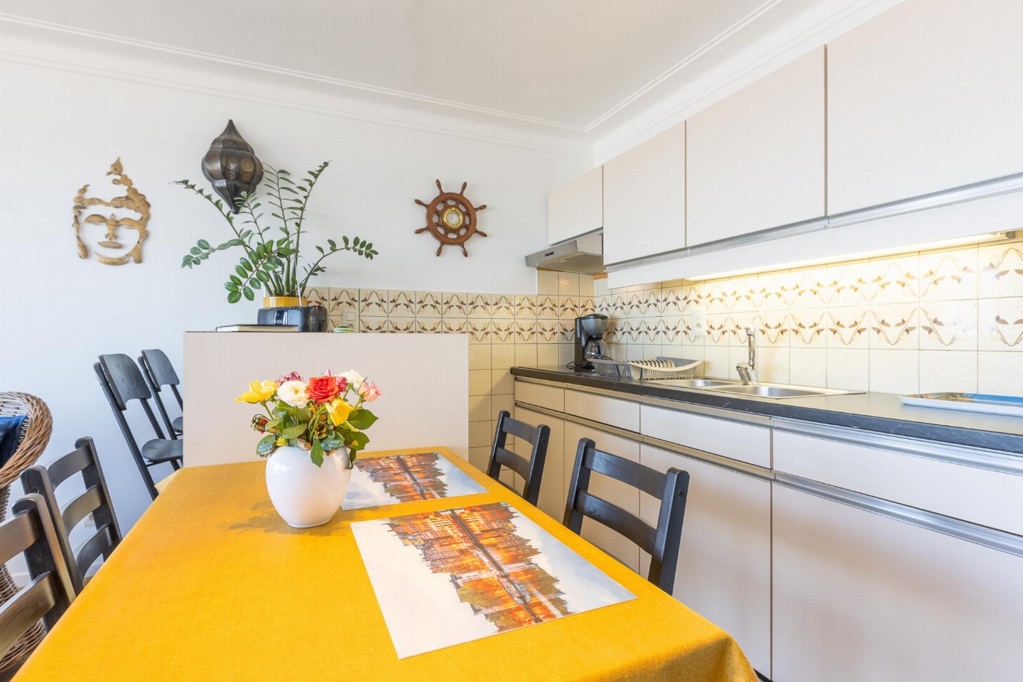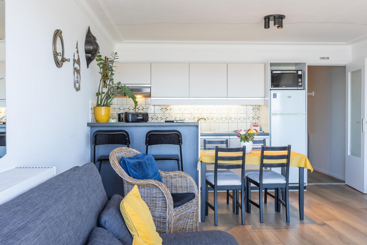 Op de 6e etage: woonkamer met 2-pers. slaapbank(2 persoons dekbed, 140 x 200 cm), TV, eettafel, radio , keuken met waterkoker, broodrooster, koffiezetapparaat(filtermaling), oven, magnetron, koelkast, koel-/vriescombinatie , slaapnis met 2-pers. bed(2 persoons dekbed, 180 x 200 cm) , badkamer met douche , toilet, berging