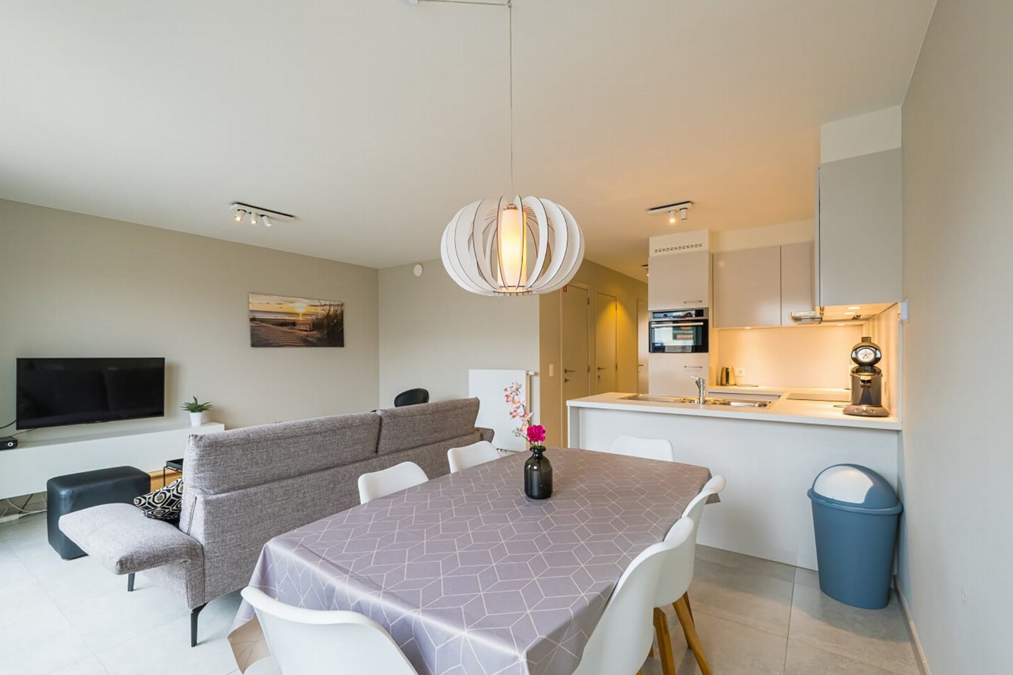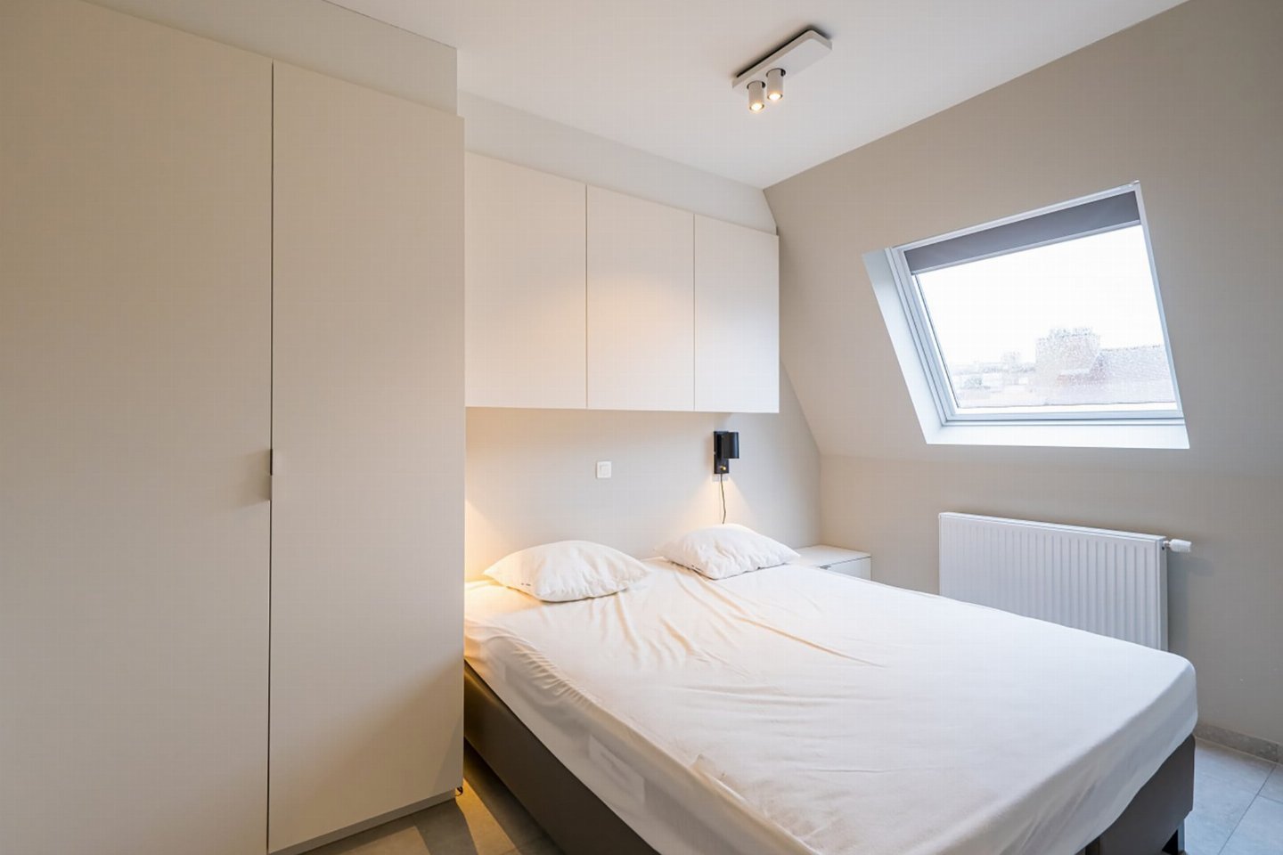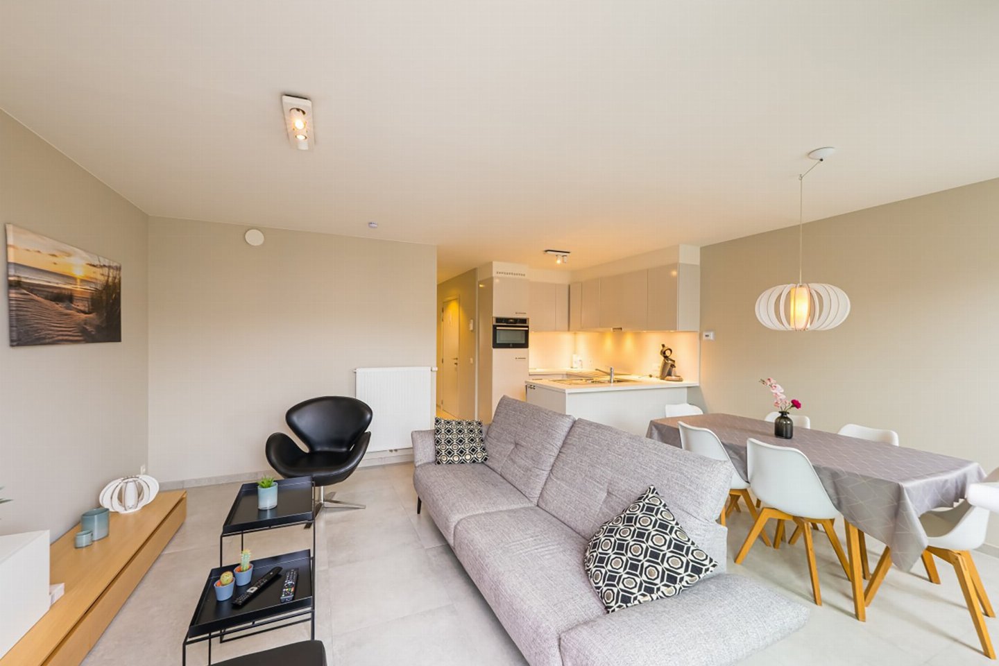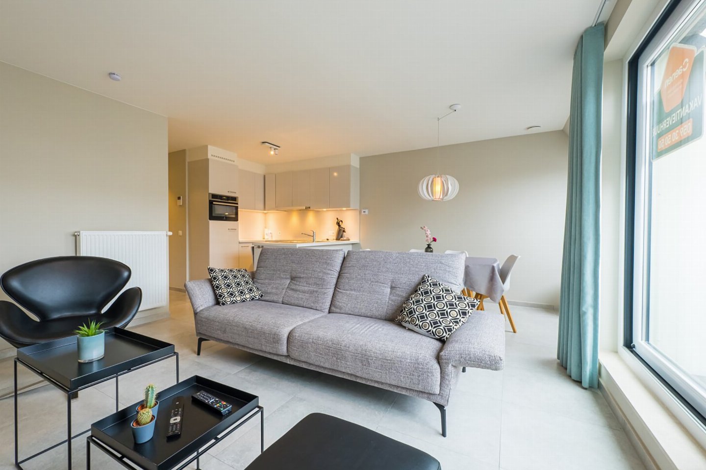 Appartement op de 4e verdieping met 2 slaapkamers: één met dubbel bed en één met 2 enkele bedden. Lichte woonkamer met volledig ingerichte open keuken en toegang tot zongericht terras met zijzeezicht. Badkamer met inloopdouche en apart toilet. Moderne residentie met hedendaagse architectuur.