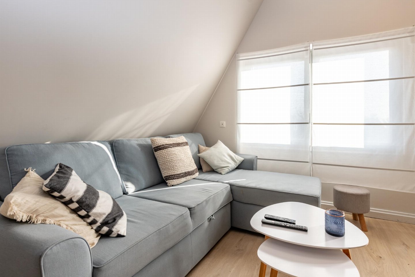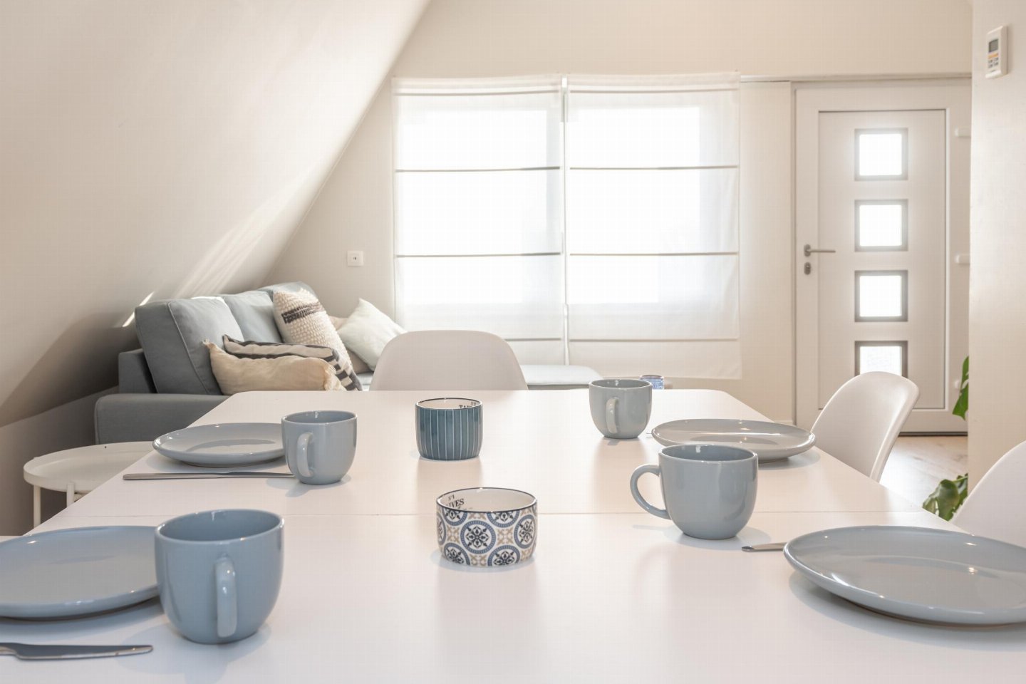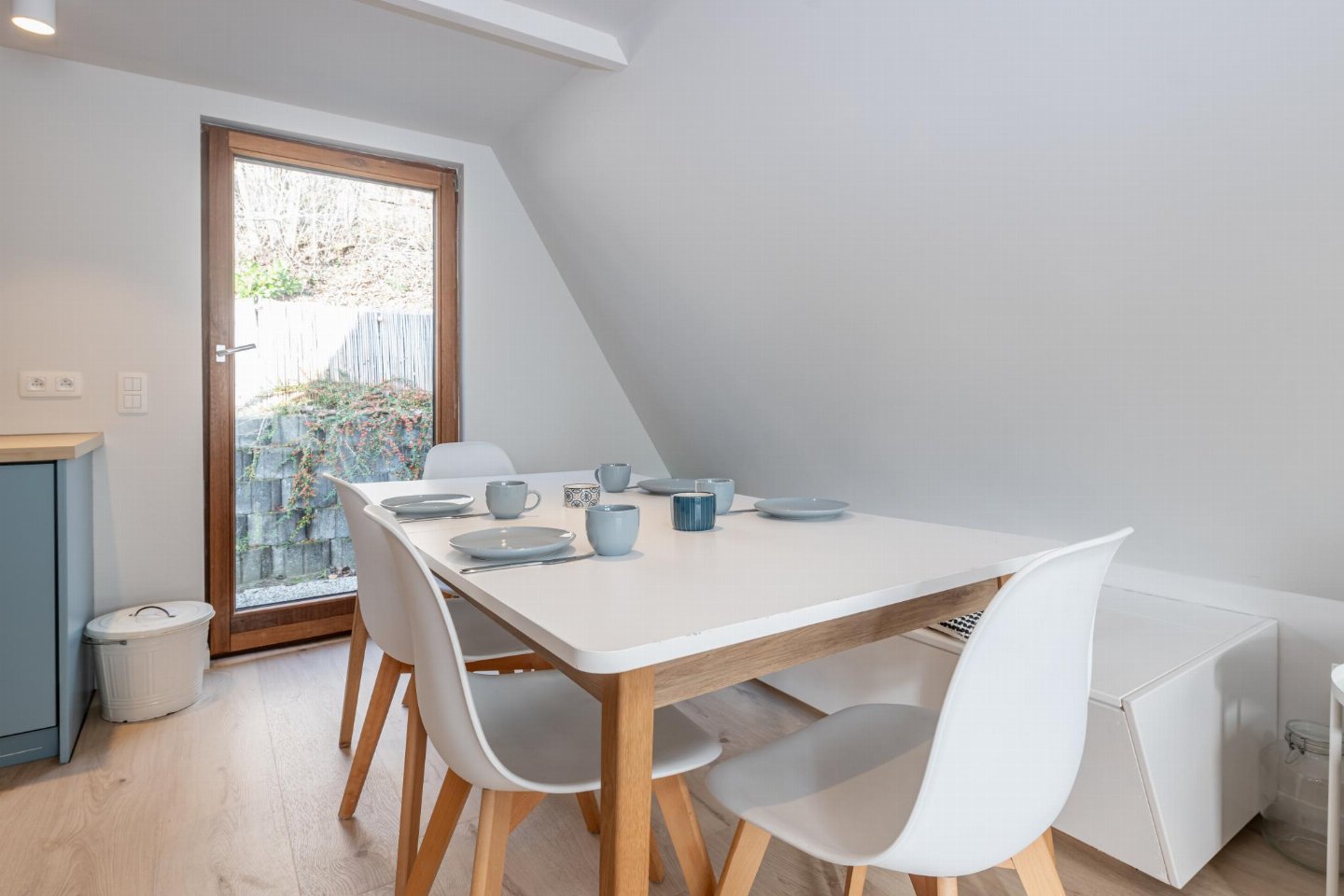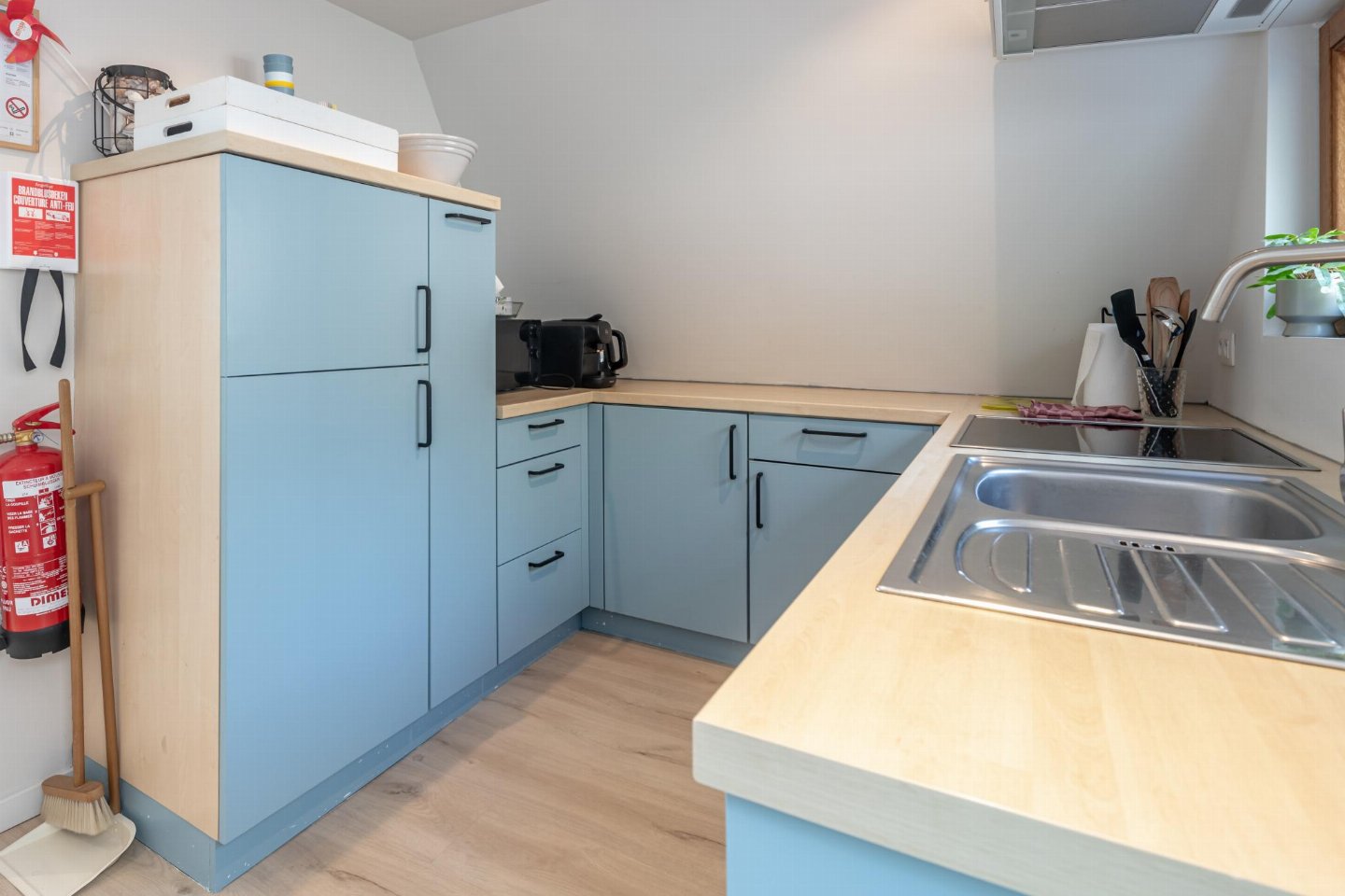 Op de 1e etage(via steile trap): open keuken met kookplaat(4 kookplaten, elektrisch), waterkoker, broodrooster, afzuigkap, koffiezetapparaat(cups, Dolce Gusto), oven(hetelucht), magnetron, afwasmachine, koel-/vriescombinatie , woon/eetkamer met TV(flatscreen, digital, smart TV), eettafel, zithoek, 1x kinderstoel , 1x kinderstoel