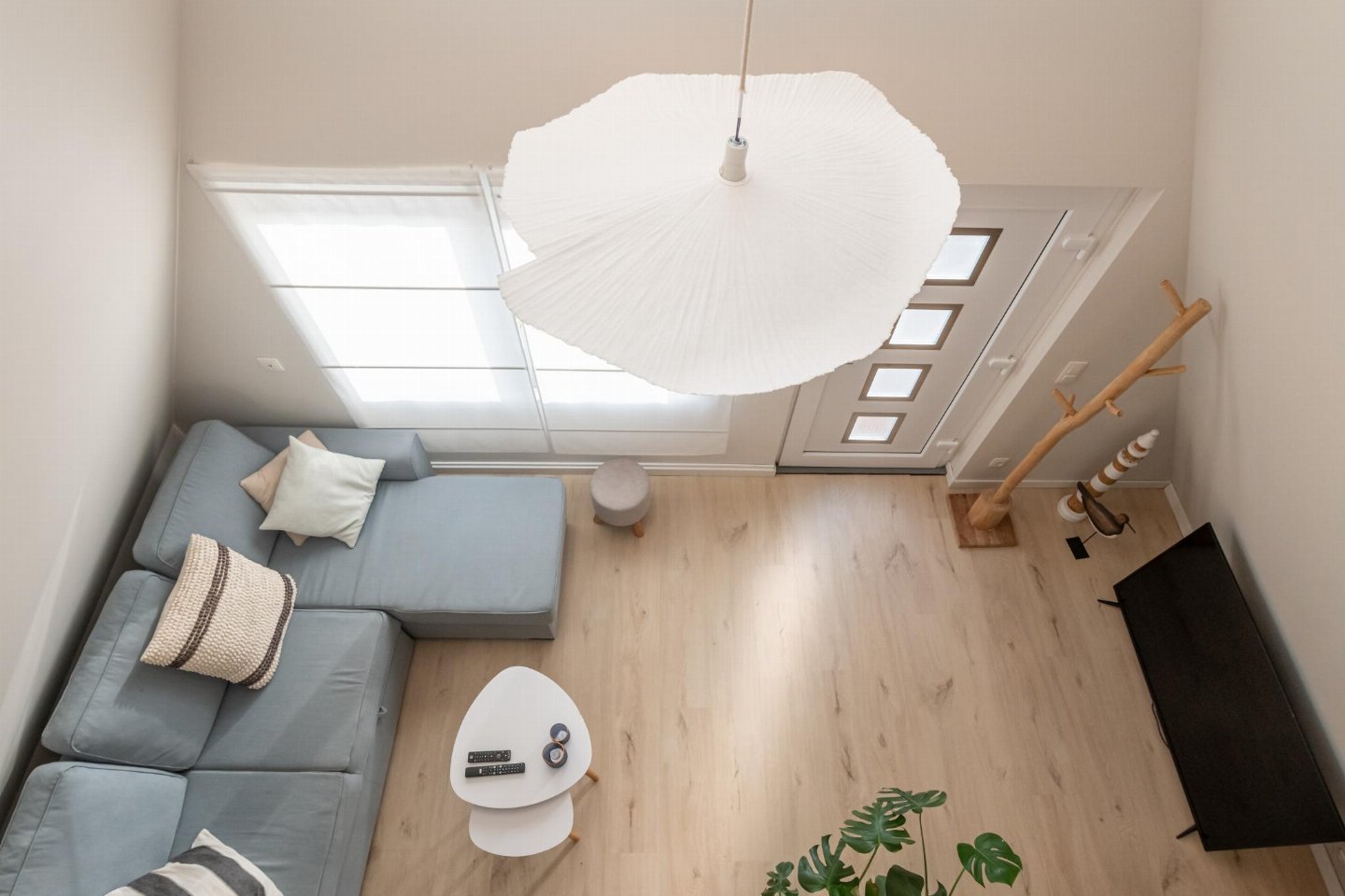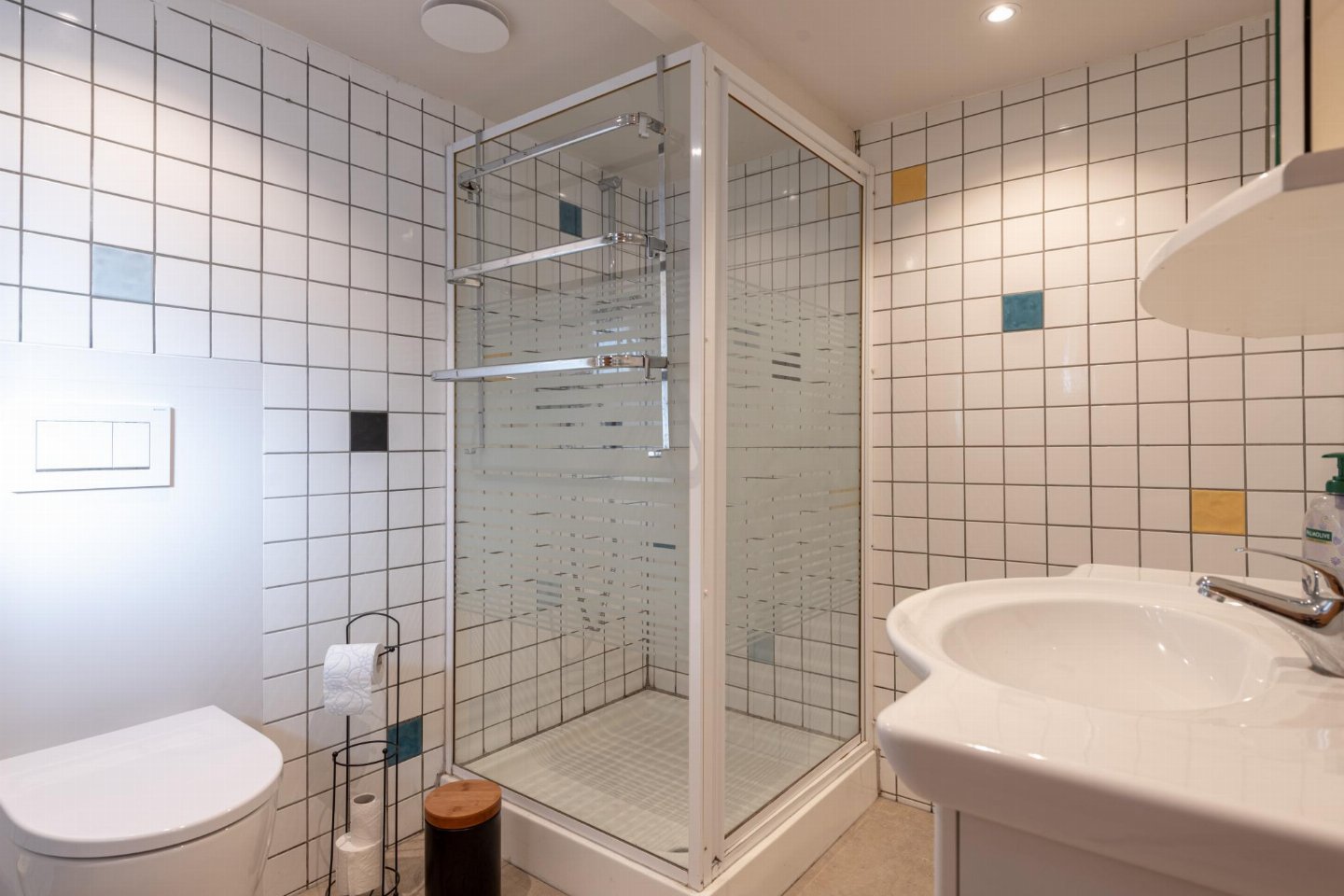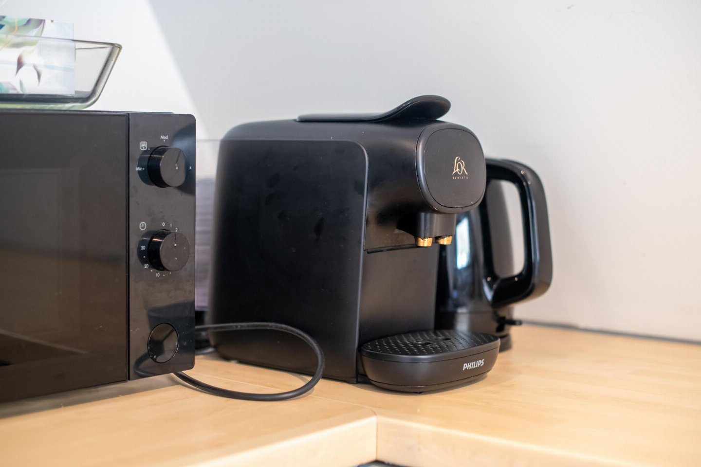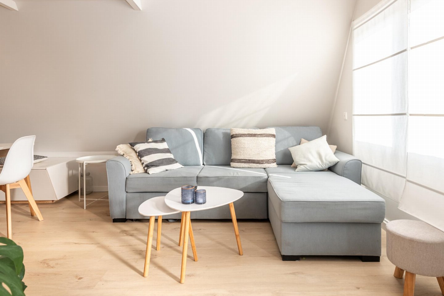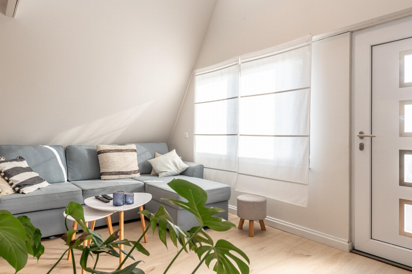 Op de 1e etage(via steile trap): open keuken met kookplaat(4 kookplaten, elektrisch), waterkoker, broodrooster, afzuigkap, koffiezetapparaat(cups, Dolce Gusto), oven(hetelucht), magnetron, afwasmachine, koel-/vriescombinatie , woon/eetkamer met TV(flatscreen, digital, smart TV), eettafel, zithoek, 1x kinderstoel , 1x kinderstoel