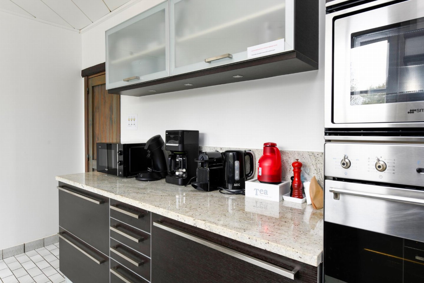 Begane grond: (keuken(kookplaat, waterkoker, afzuigkap, koffiezetapparaat(filtermaling, senseo pads), oven, magnetron, afwasmachine), woon/eetkamer(TV, eettafel, kachel(hout), zithoek), slaapkamer met badkamer(2-pers. bed(2 persoons dekbed), ligbad, wastafel, wc), toilet(wc))