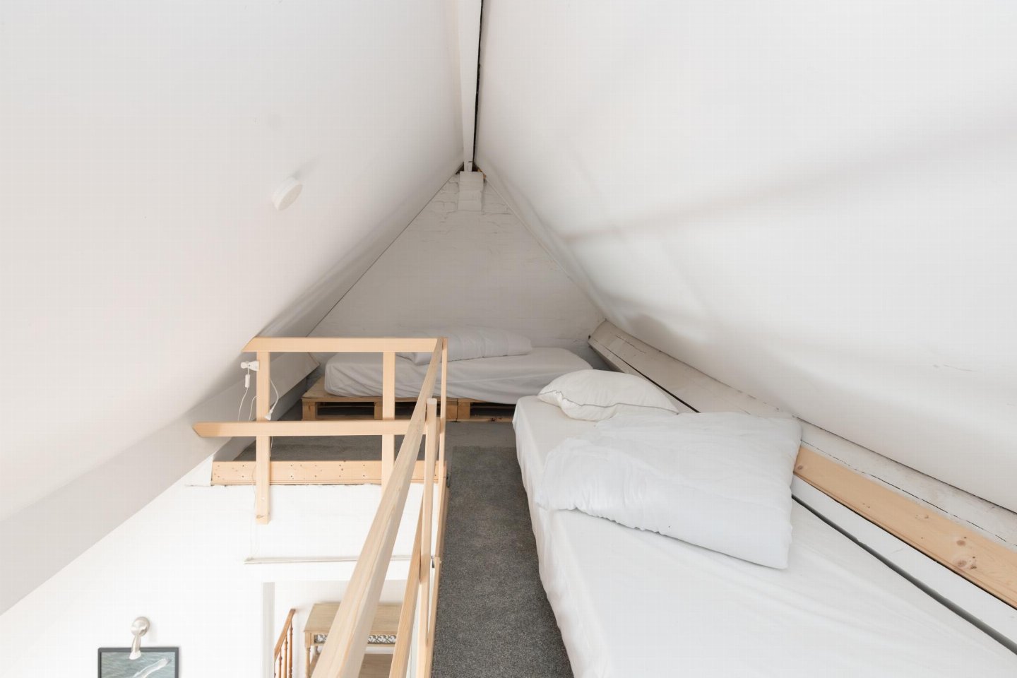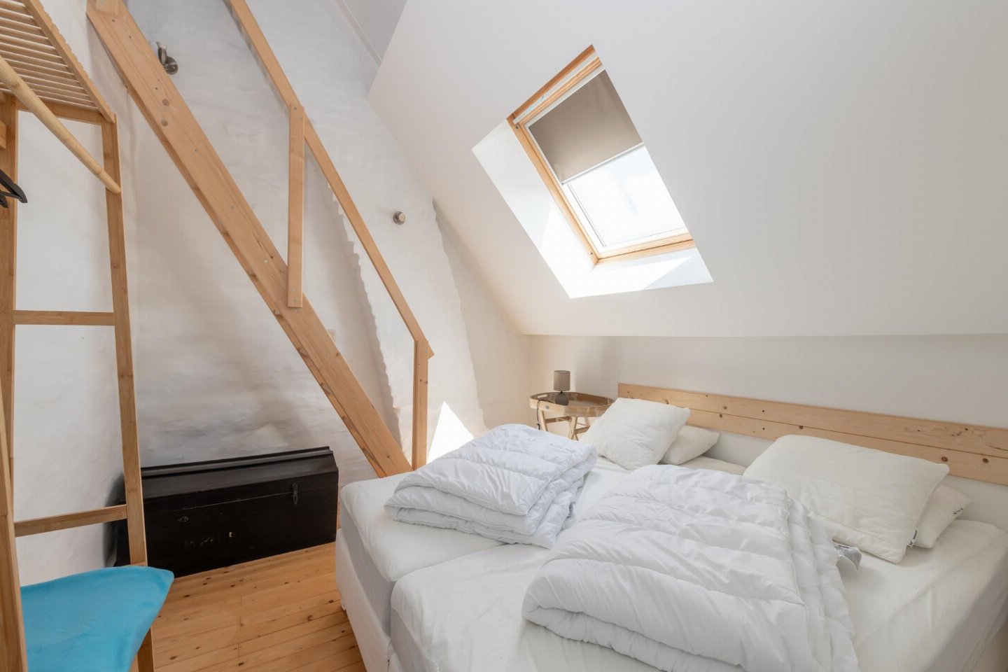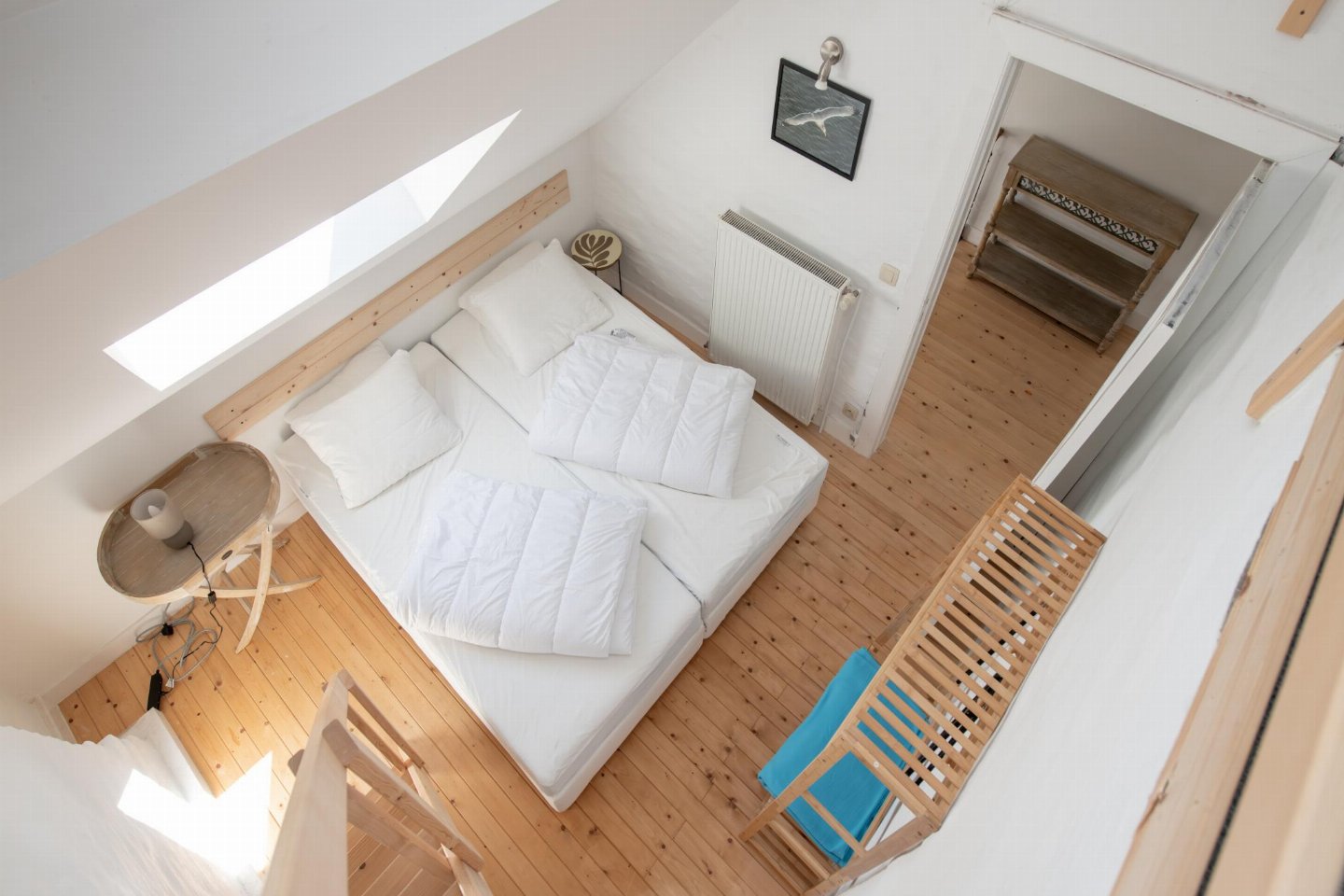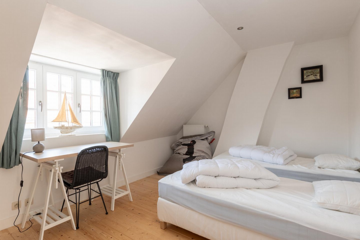 Op de 2e etage: (slaapkamer(2x 1-pers. bed(dekbed, 90 x 200 cm)), doorloop slaapkamer(2x 1-pers. bed(dekbed, 90 x 200 cm)), badkamer(ligbad, 2x wastafel), vide(via steile trap)(2x 1-pers. bed(dekbed, 90 x 200 cm)))