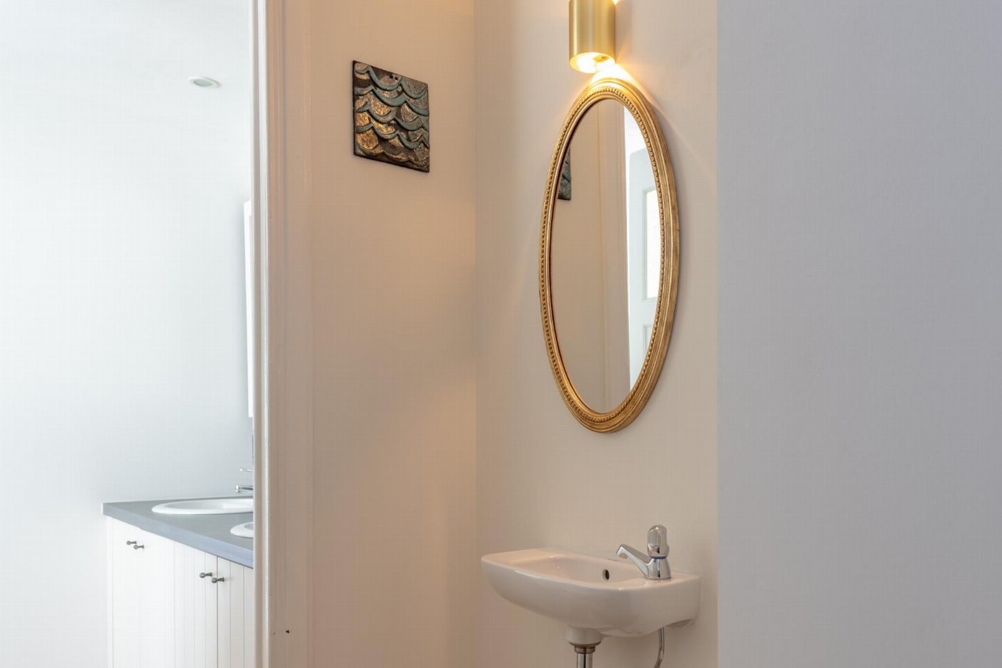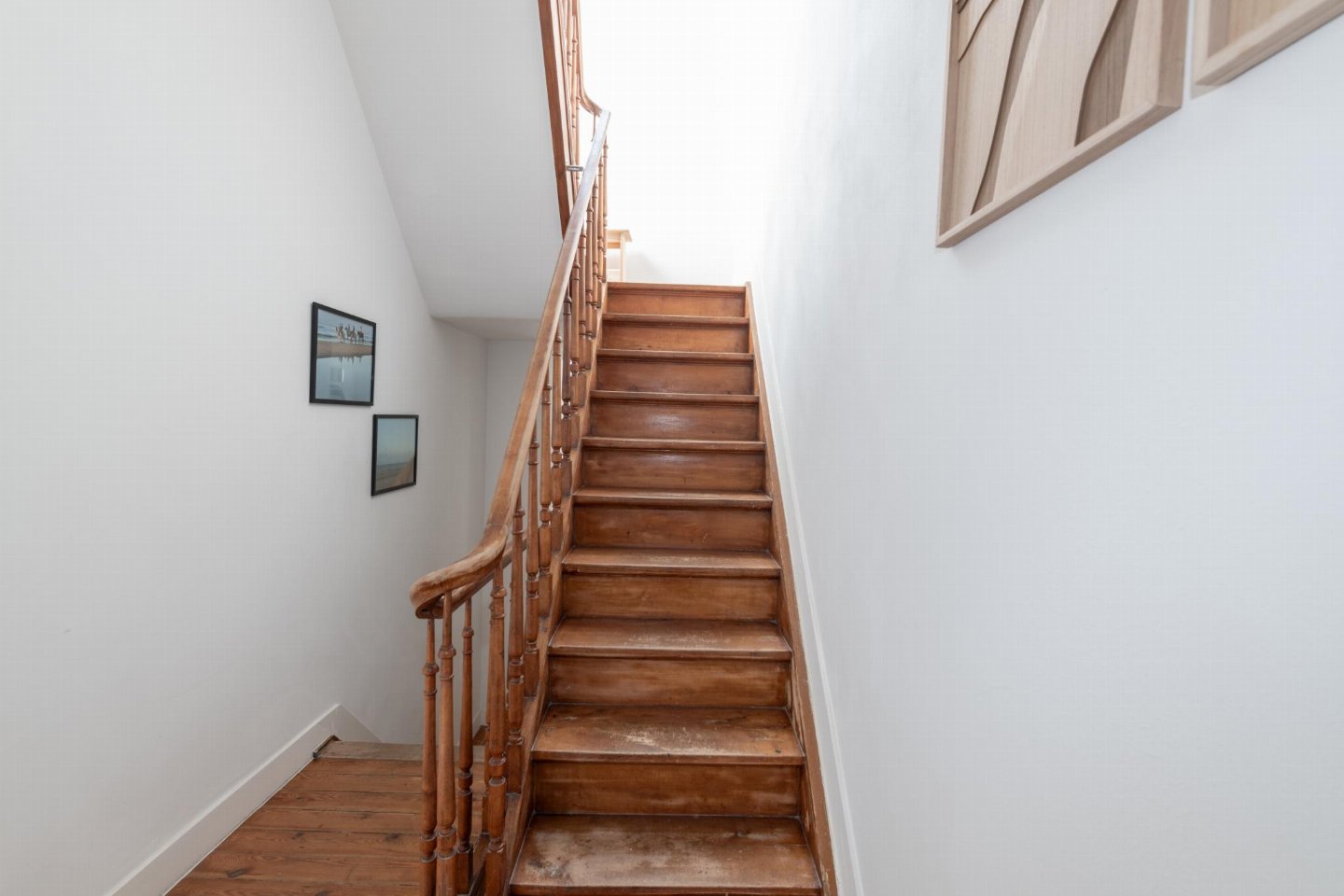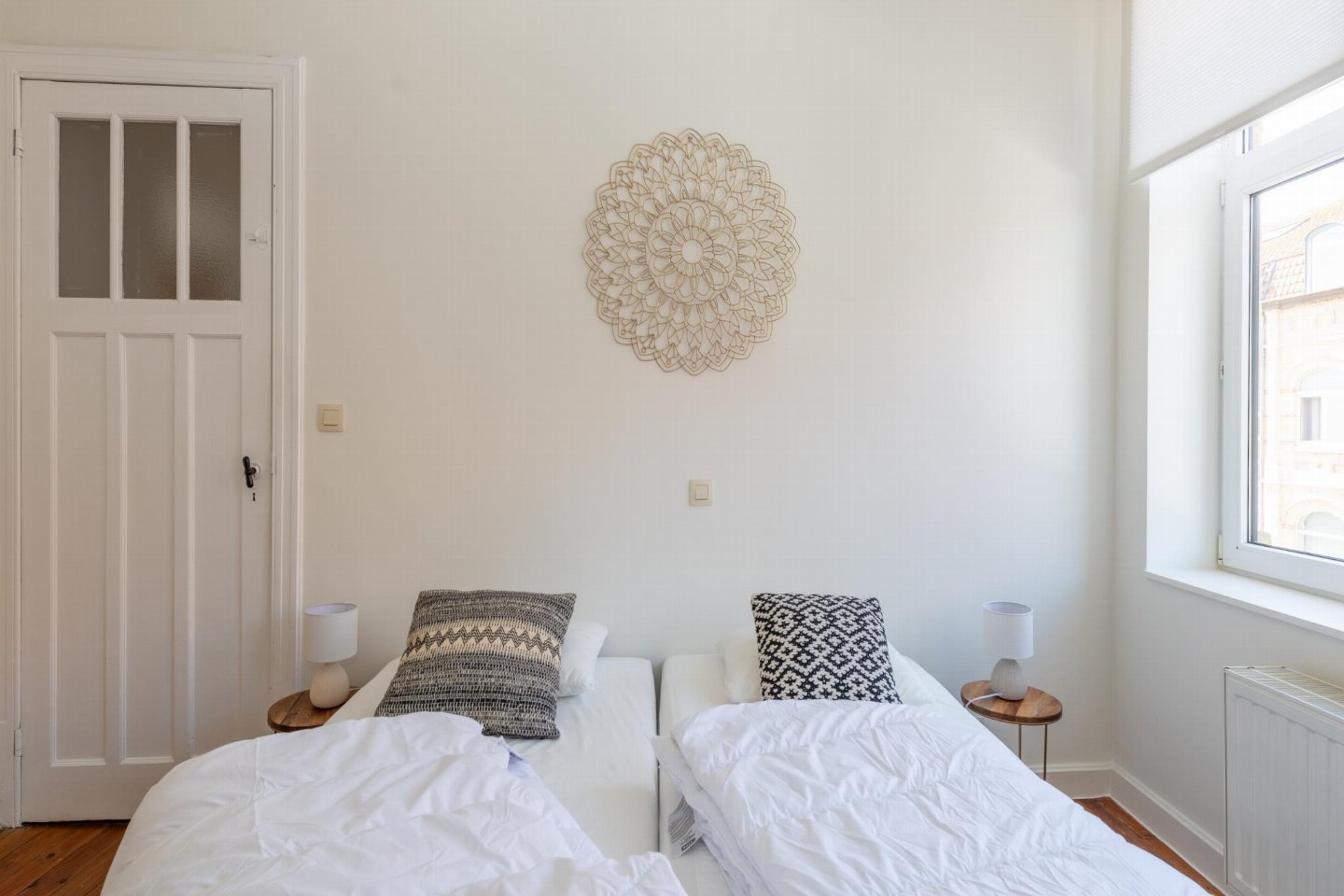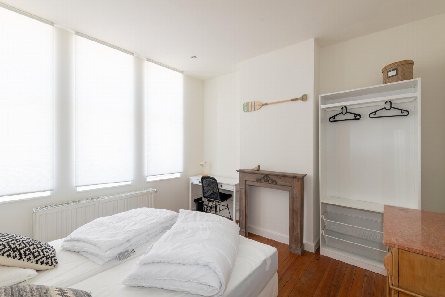 Op de 2e etage: (slaapkamer(2x 1-pers. bed(dekbed, 90 x 200 cm)), doorloop slaapkamer(2x 1-pers. bed(dekbed, 90 x 200 cm)), badkamer(ligbad, 2x wastafel), vide(via steile trap)(2x 1-pers. bed(dekbed, 90 x 200 cm)))