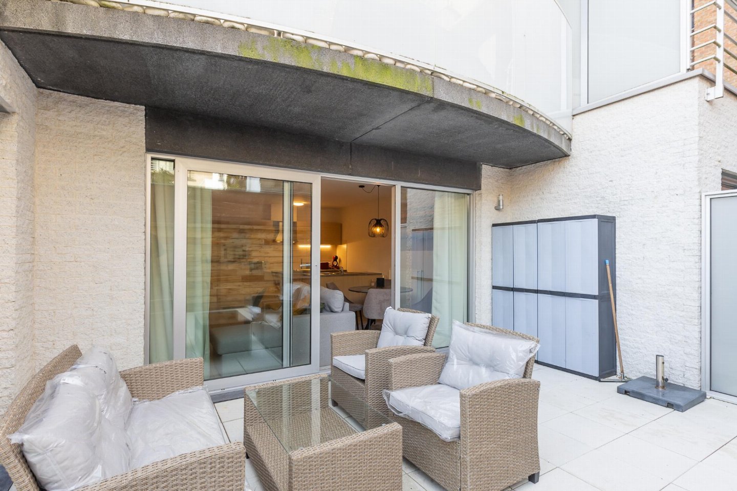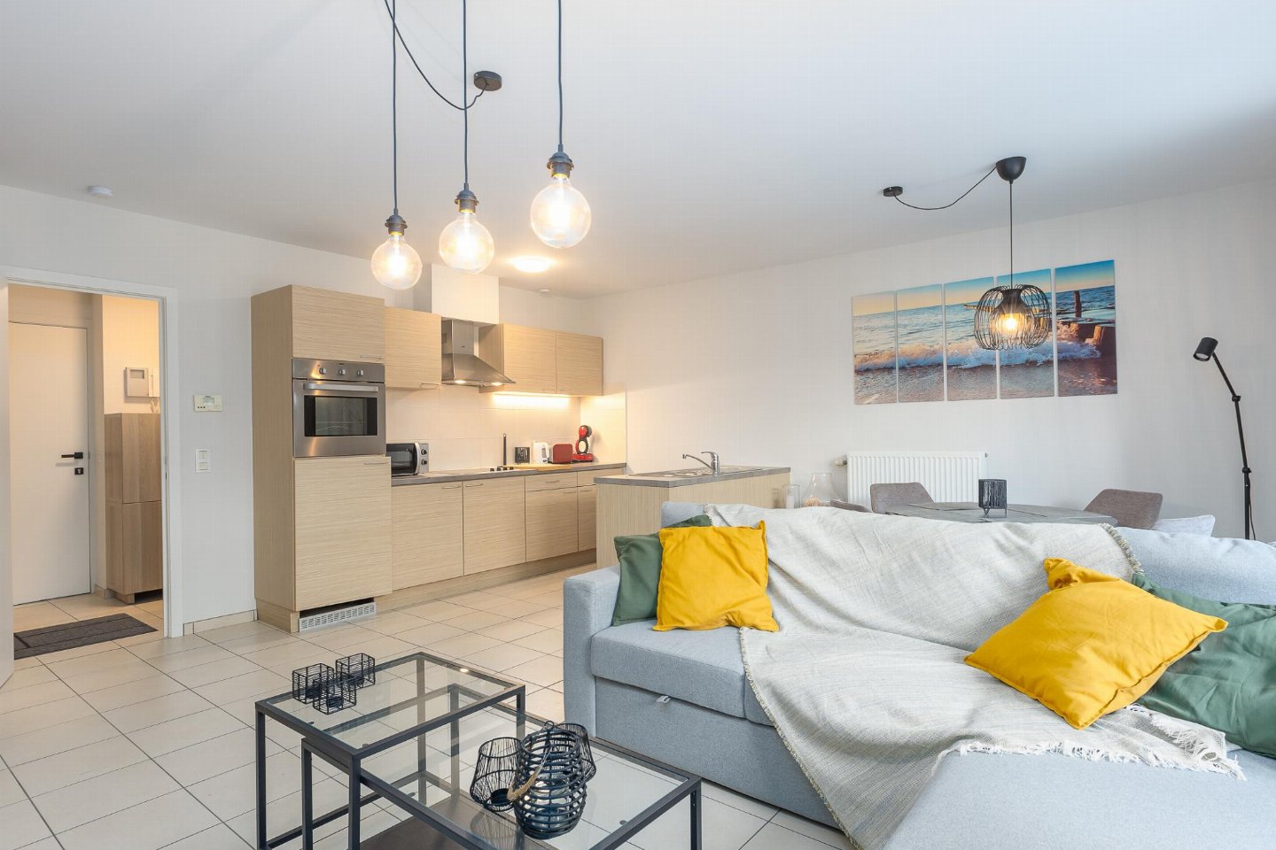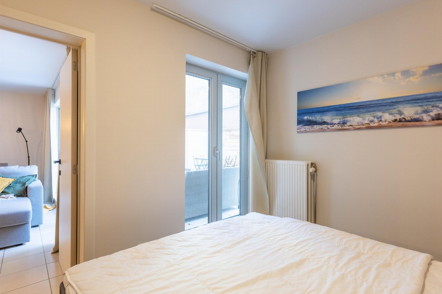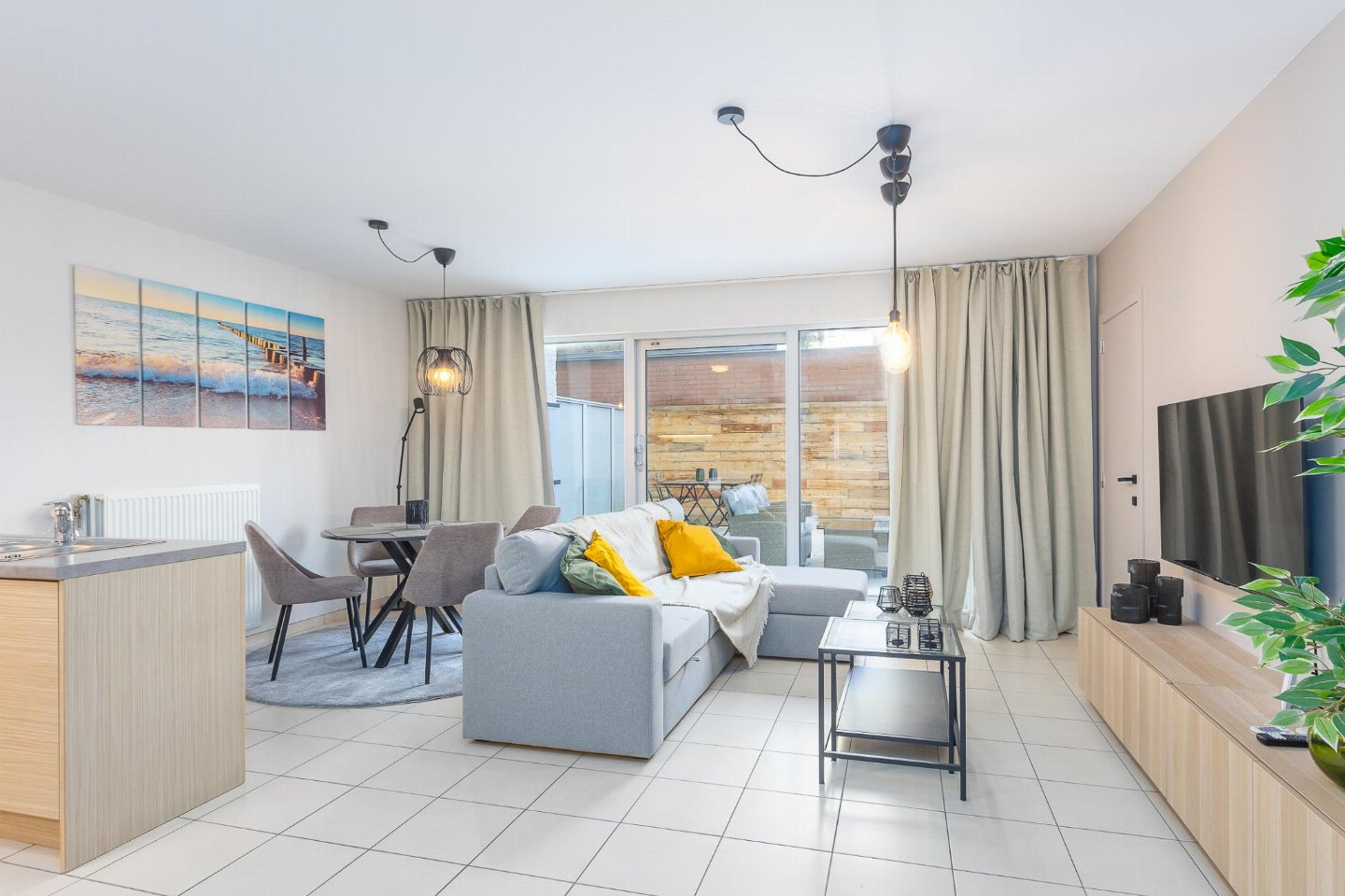 Gezellig gelijkvloers appartement met 1 slaapkamer (dubbel bed) en lichtrijke woonkamer met zetelbed voor 2 personen. Kamerhoge ramen geven toegang tot een ruim, zuidgericht terras met meubilair. Moderne open keuken, badkamer met douche, apart toilet en berging met wasmachine.