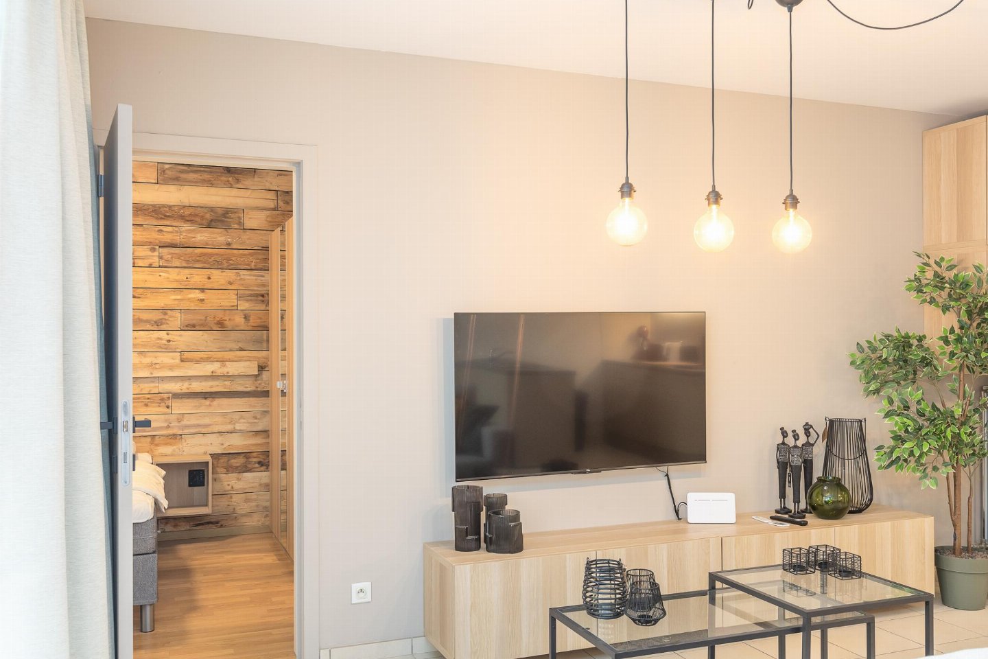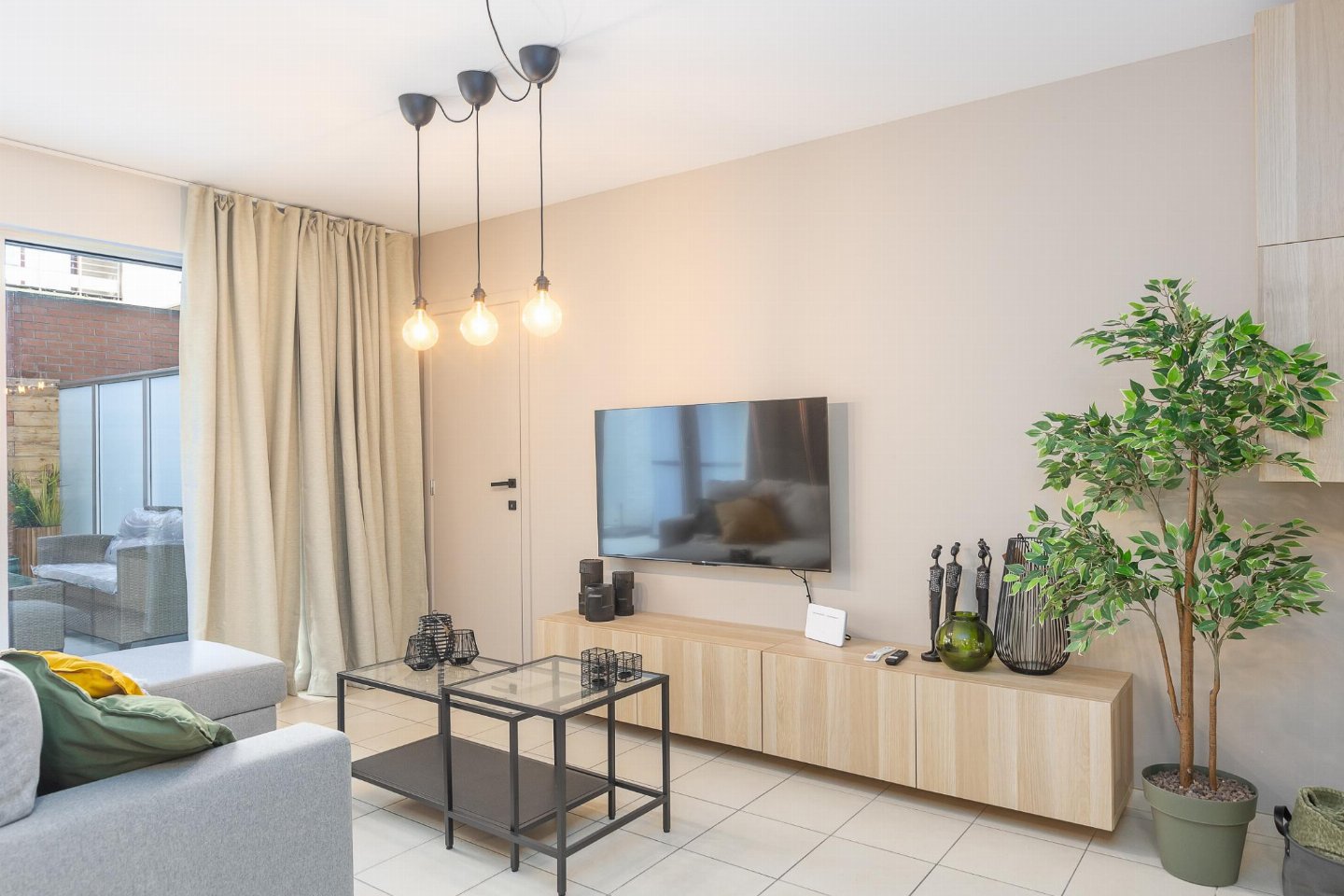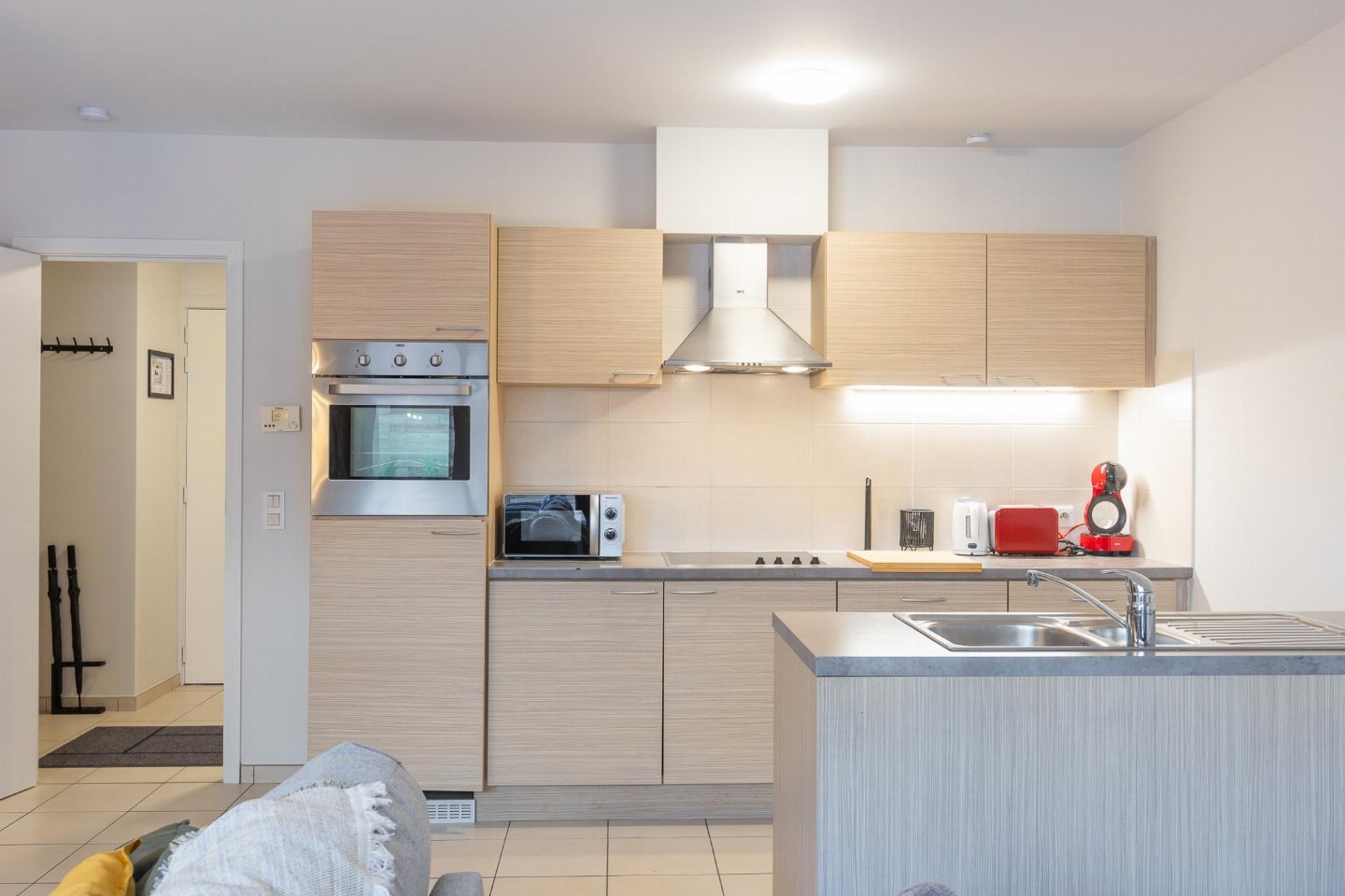 Gezellig gelijkvloers appartement met 1 slaapkamer (dubbel bed) en lichtrijke woonkamer met zetelbed voor 2 personen. Kamerhoge ramen geven toegang tot een ruim, zuidgericht terras met meubilair. Moderne open keuken, badkamer met douche, apart toilet en berging met wasmachine.