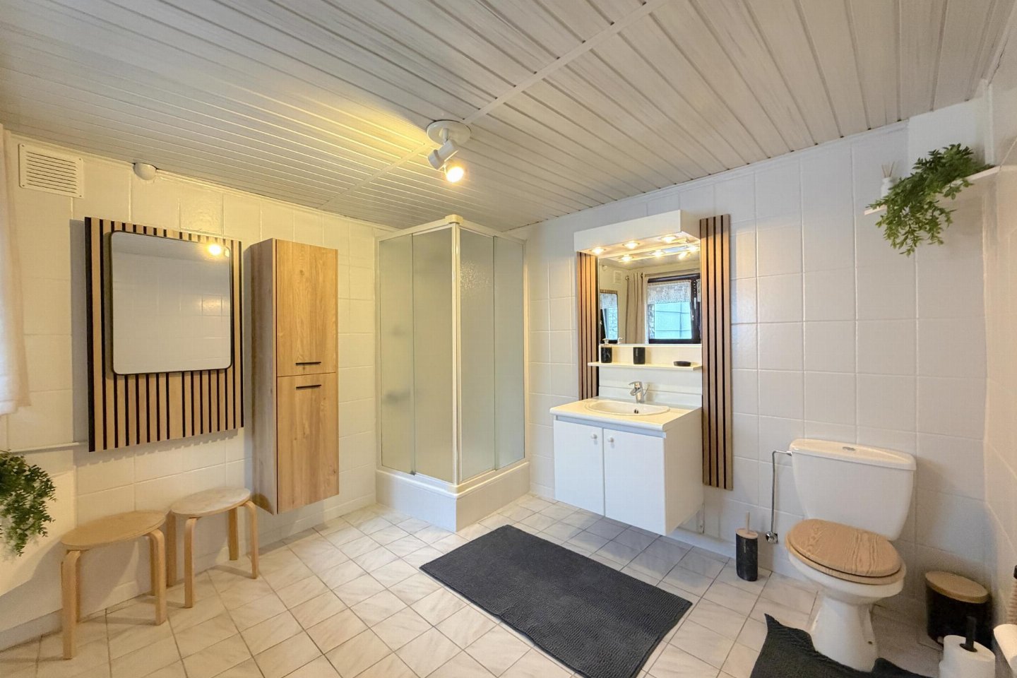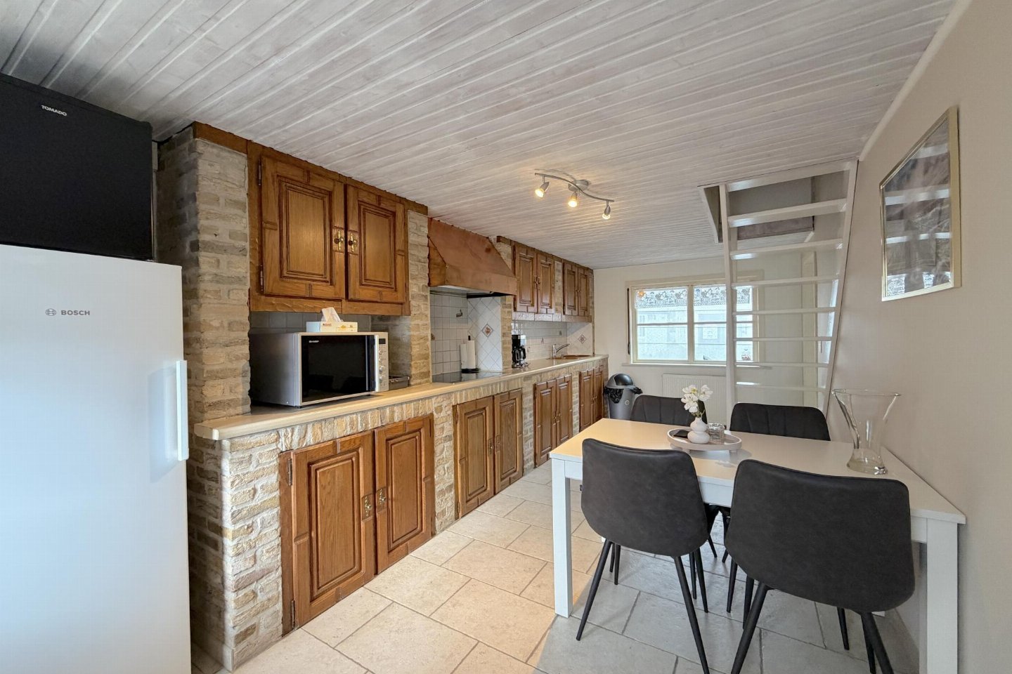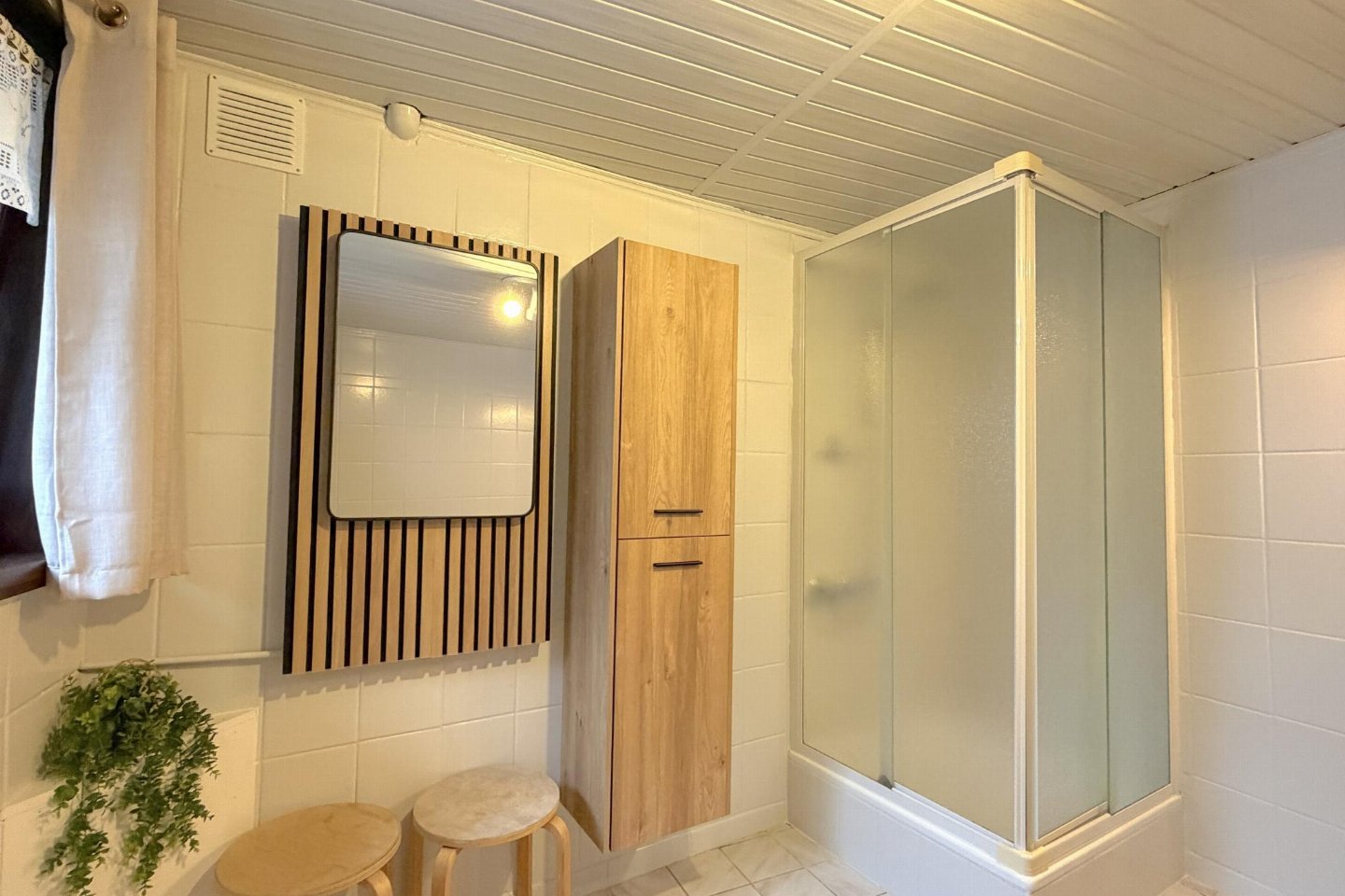Begane grond: woonkamer met 1-pers. slaapbank(90 x 200 cm), TV(smart TV), kachel(gas) , woonkeuken met kookplaat(4 kookplaten, elektrisch), waterkoker, broodrooster, afzuigkap, koffiezetapparaat(filtermaling, senseo pads), combimagnetron, koelkast, vriezer , badkamer met douche, wastafel, wc , serre, 1x kinderstoel